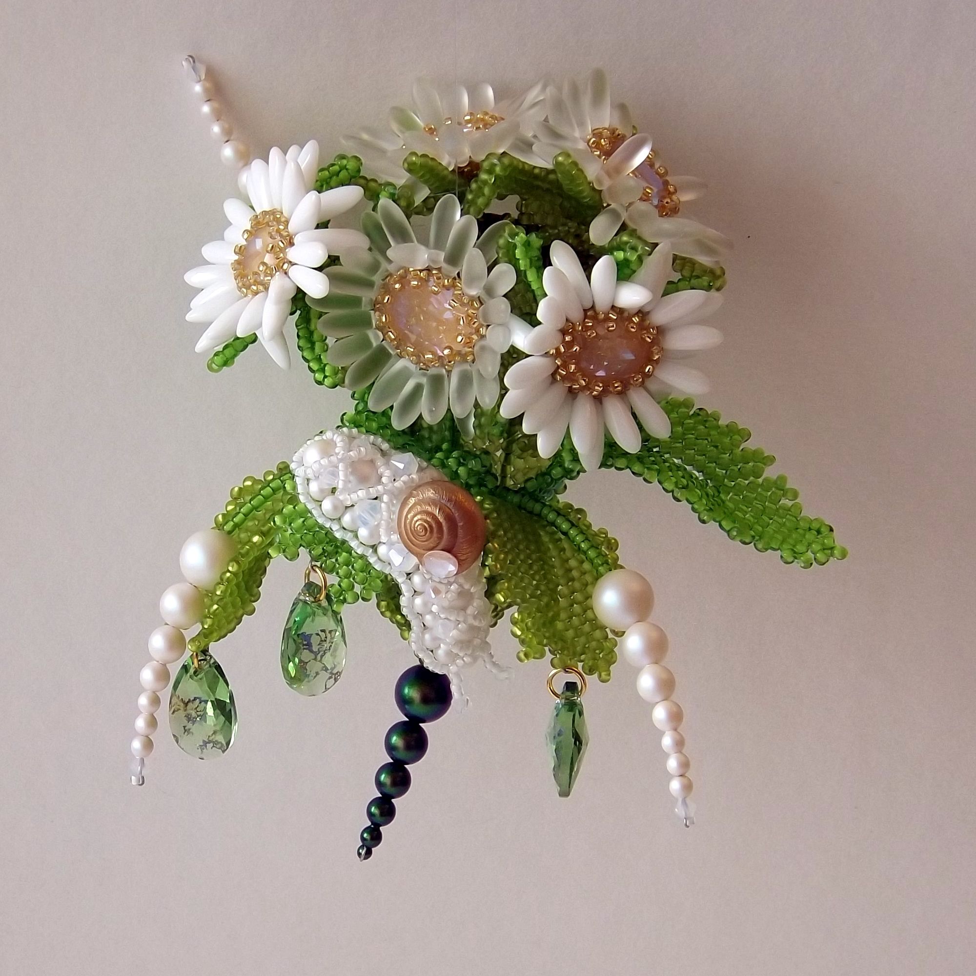 А если серьезно, всегда интересно, что получится, если из горстки бисера, бусин, фурнитуры, камней и черт его знает чего еще, пытаешься воплотить нечто, чтобы оно было похоже на живое: цветы, листья, животных. Кристаллы помогают в воплощении идеи, дают возможность оттенить или усилить сходство украшения с оригиналом; в зависимости от фактуры – передать настроение: сияюще-радостное или матово-грустное, приглушенно-задумчивое или ярко-дерзкое. Позволяют задержать образ во времени, преодолеть сиюмгновенность существования и снова и снова вызывать впечатление. В конце концов, они просто радуют глаз. И пусть с кем-то надолго останется букетик ромашек с любопытной улиткой.