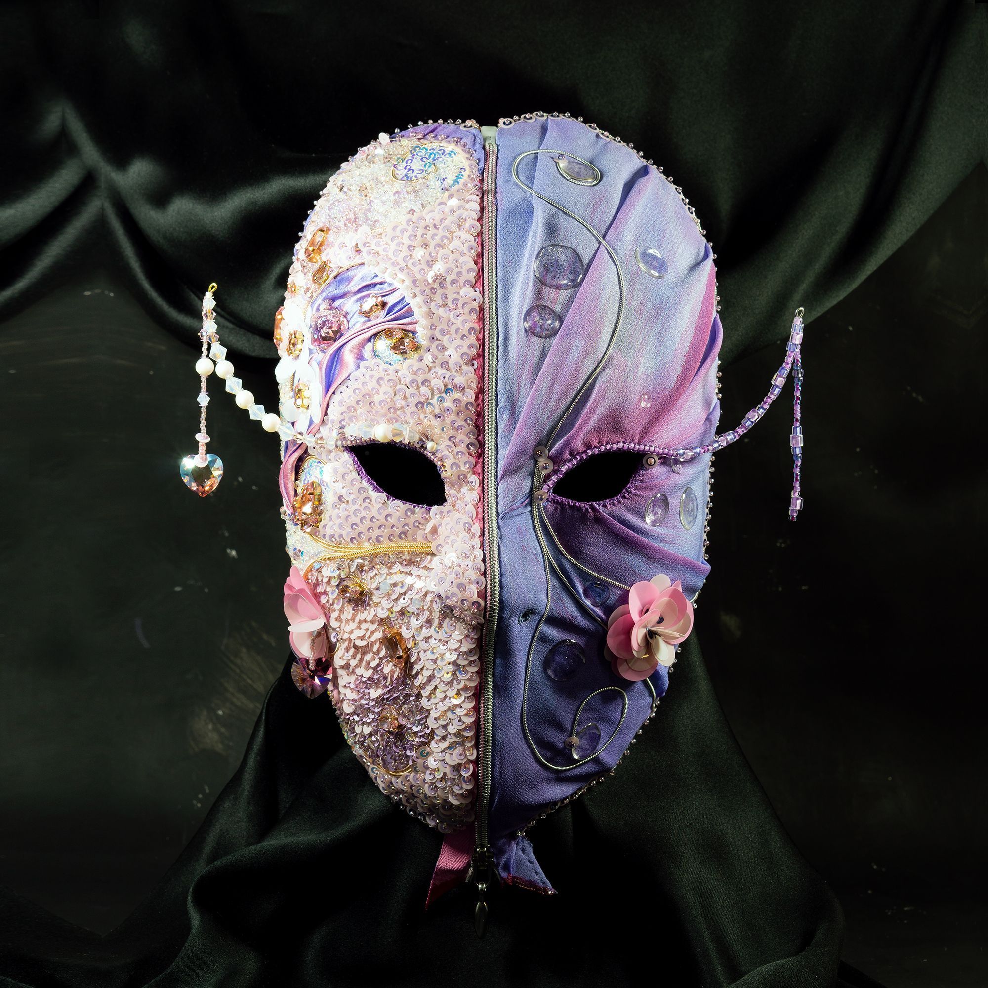 Маска создана с нуля, основа ее достаточно гибкая и мягко обнимает лицо при носке, но при этом самостоятельно держит форму. В целом виде крепится на голове лентами. С помощью молнии разделяется на две половинки, каждая из которых функциональна и может быть использована по отдельности. В этом случае для носки используется окрашенная в цвета маски палочка.