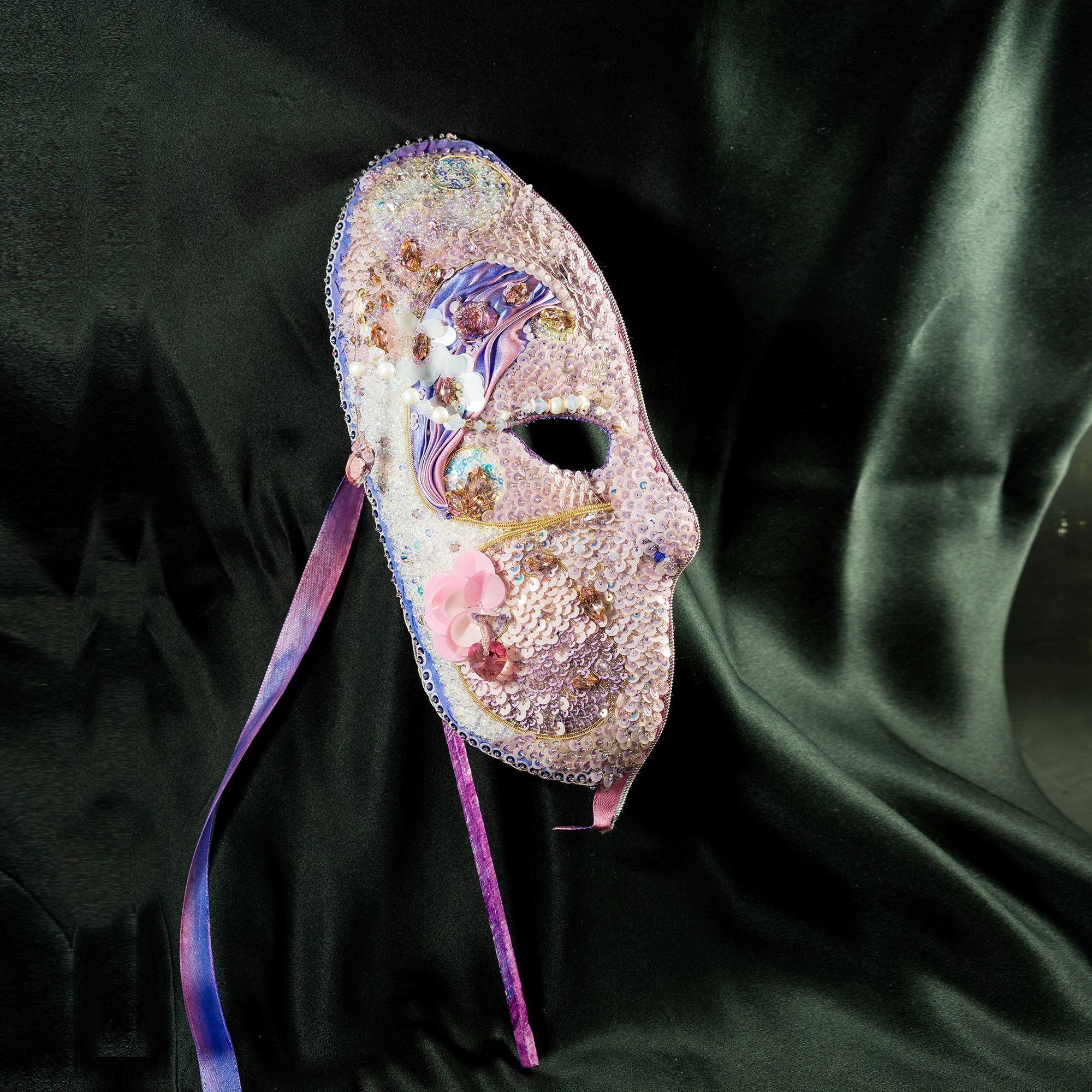 Двуликая маска "Пробуждение" - это метафора ухода эпохи. Цветущая, нежная сторона сна с кристаллами основного цвета Light Rose Shimmer и Light Rose Ignite соответствует времени, когда мастера с нежной любовью создавали бесконечное множество творений из кристаллов Сваровски: здесь буйство граней, подчеркнутое пайетками и биконусами, распускающийся бутон с кристальным сердечком, ресничка из жемчуга и биконусов, скопления кристаллов и сплошное сияние.