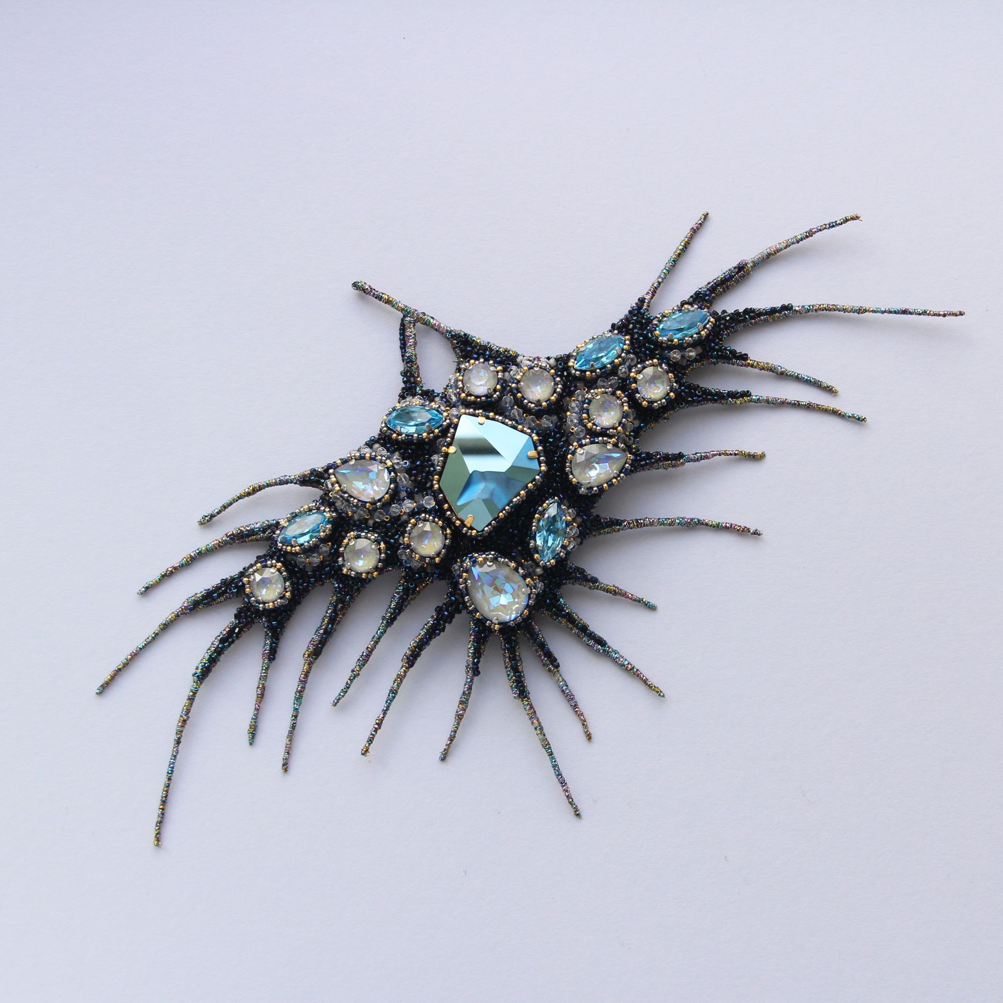 Я не люблю слепящий блеск, но кристаллы из новой коллекции Сваровски с их мягким переливом и элегантным сиянием как нельзя лучше легли на идею этой броши-трансформера. Деталь из сетки снимается и брошь можно использовать в другом стилистическом ключе. Также брошь носится и как подвеска.