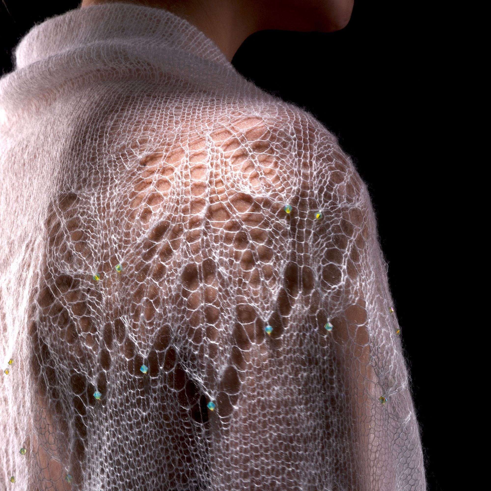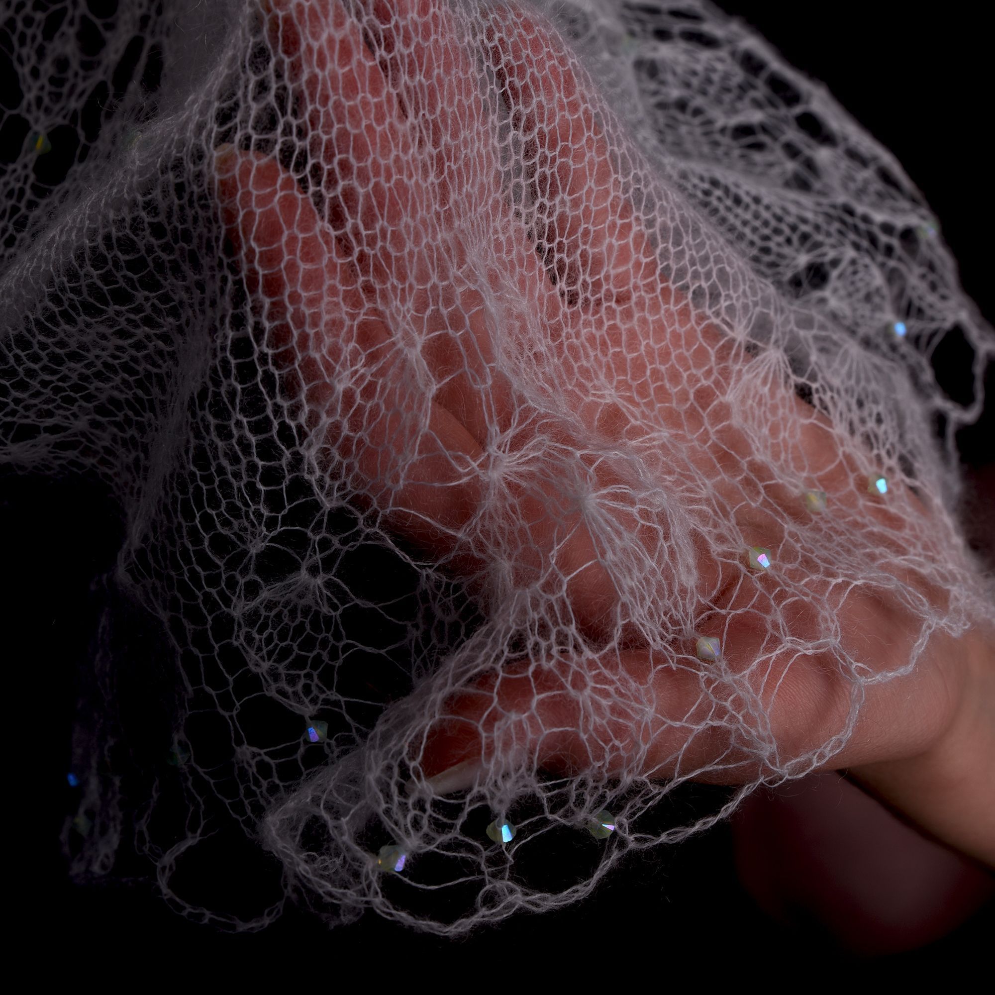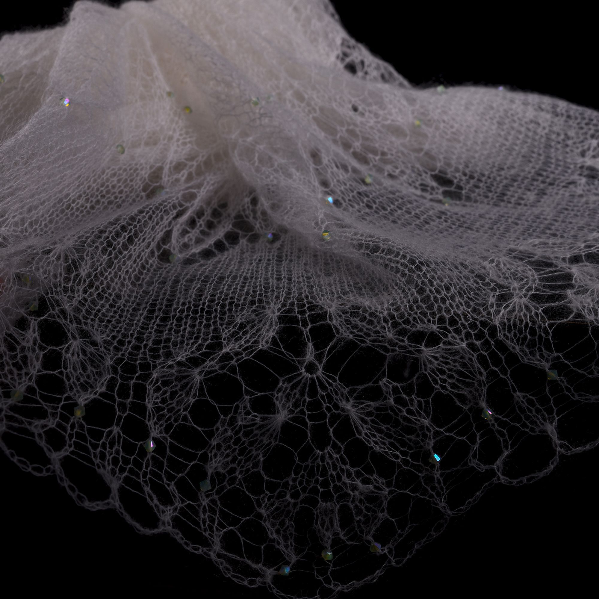 В своей работе я соединила эти символы — связала спицами из нежного мохера белого цвета шаль фишю, в тонком полотне создала букет роз, в ажурный узор цветов добавила кристаллы Сваровски. Преломление лучей света при попадании на грани создают невероятный эффект всего изделия. Мохеровая шаль поражает красотой и изяществом, придает облику аристократизм, очарование и утонченность.