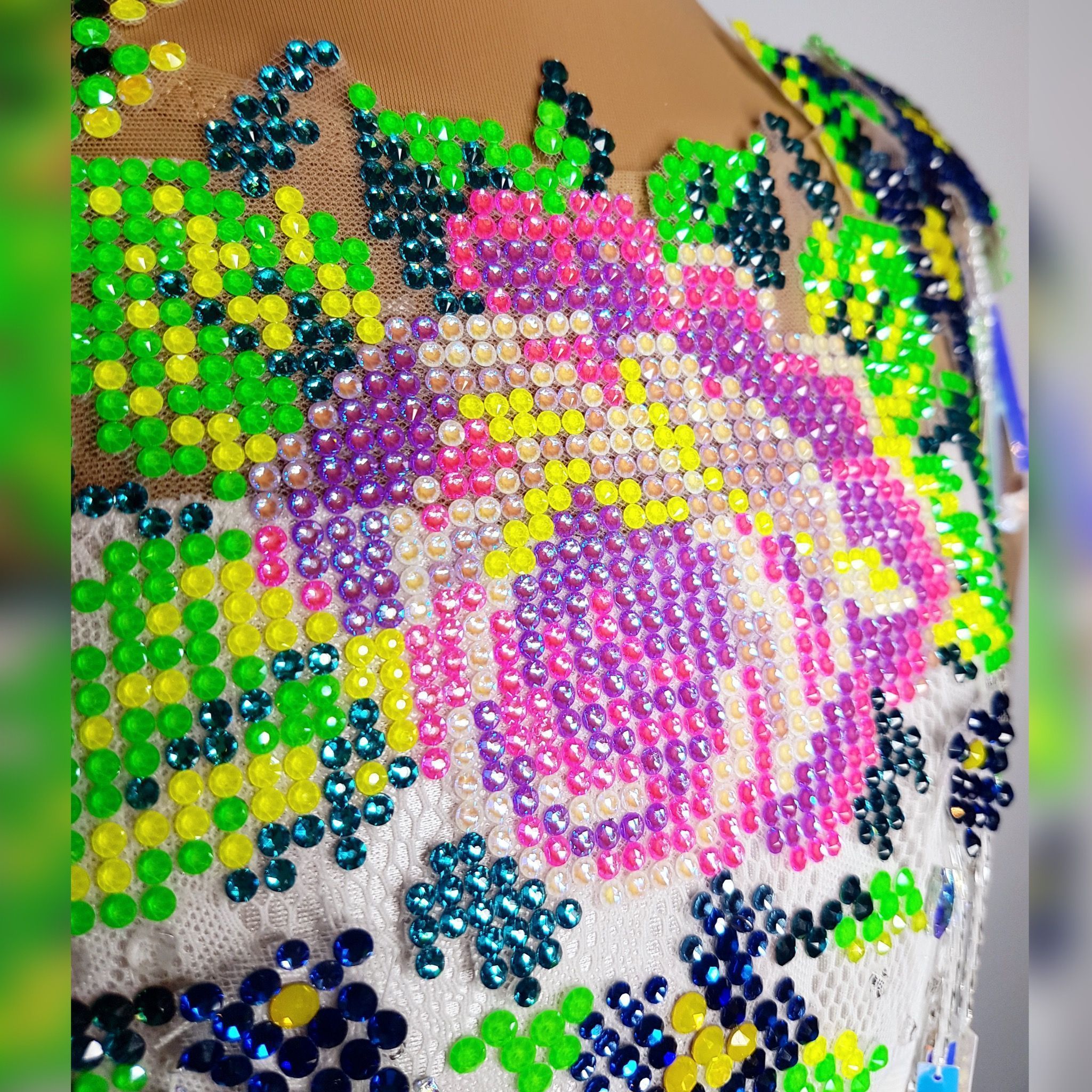 В своей работе я соединила две эти любви. Вышивка крестиком вдохновила меня на создание цветочного рисунка из страз, в котором я соединила множество оттенков Swarovski Crystals. Кристаллы правят балом в этом купальнике для художественной гимнастики
