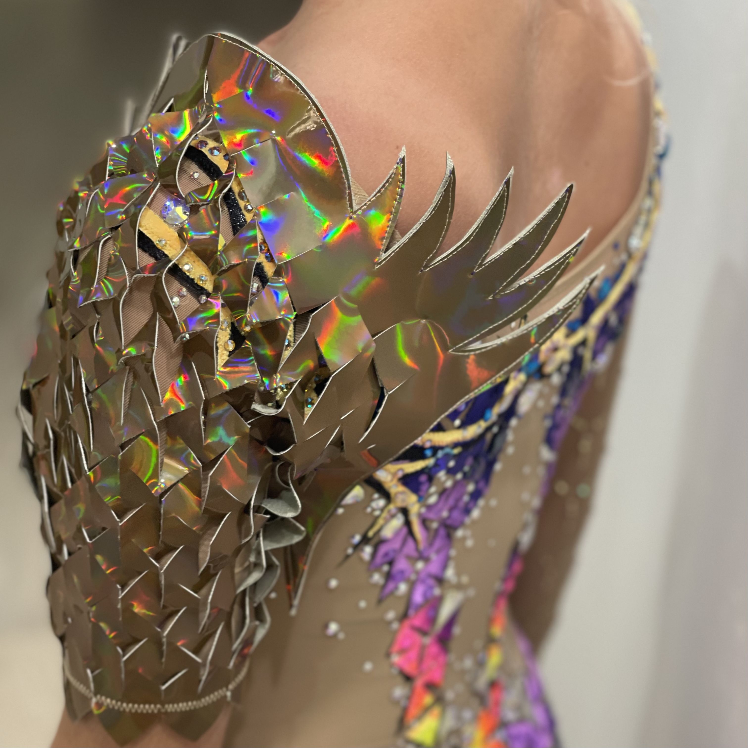 В своей работе я использовала винил взглянув на него с другого ракурса, как на отдельный элемент, придав ему способность растягиваться, повторяя форму тела, создав оригинальную текстуру поверхности. Рукав из винила подчёркивает образ своей остротой и колкостью формы, но он также как и кристаллы переливается и привлекает взгляд.