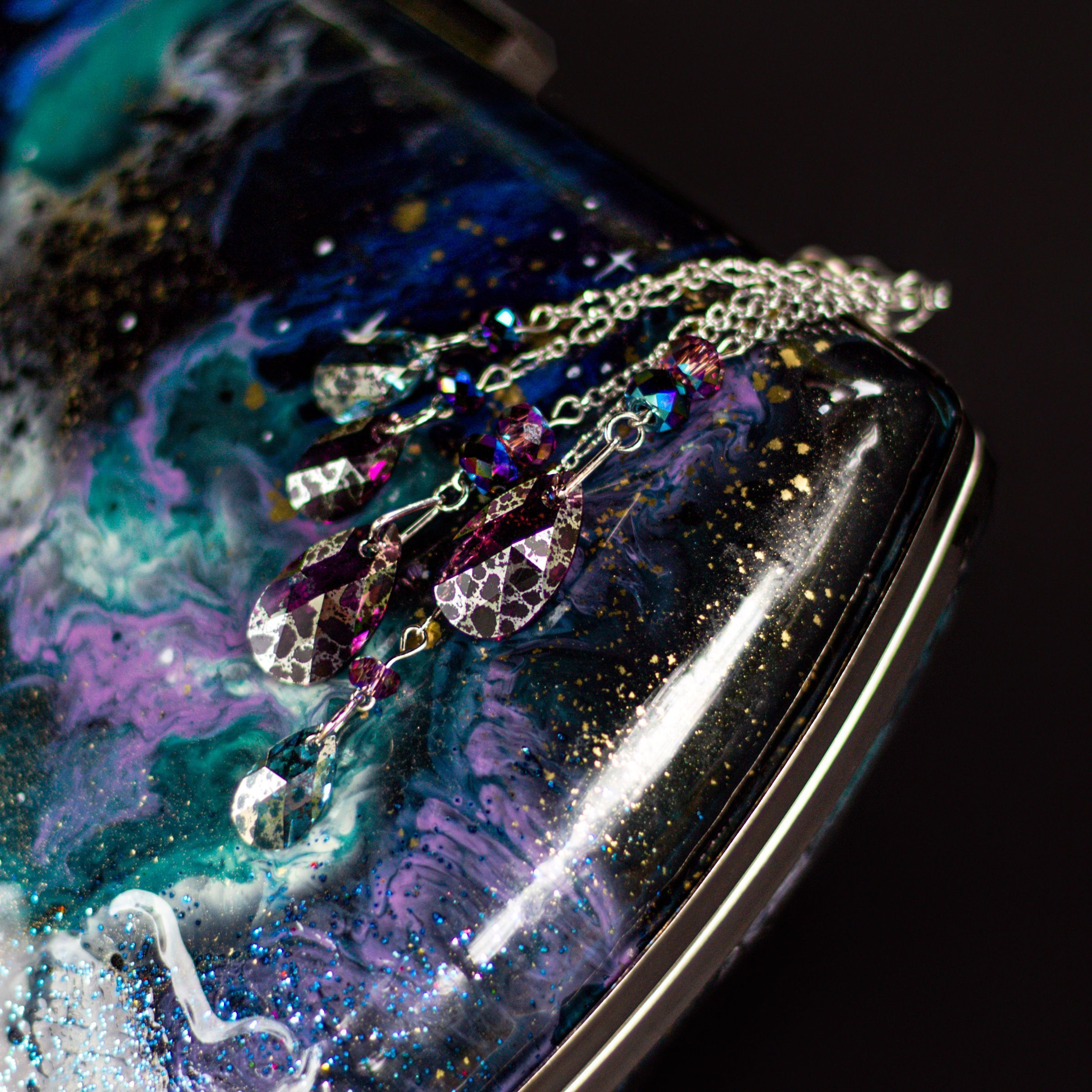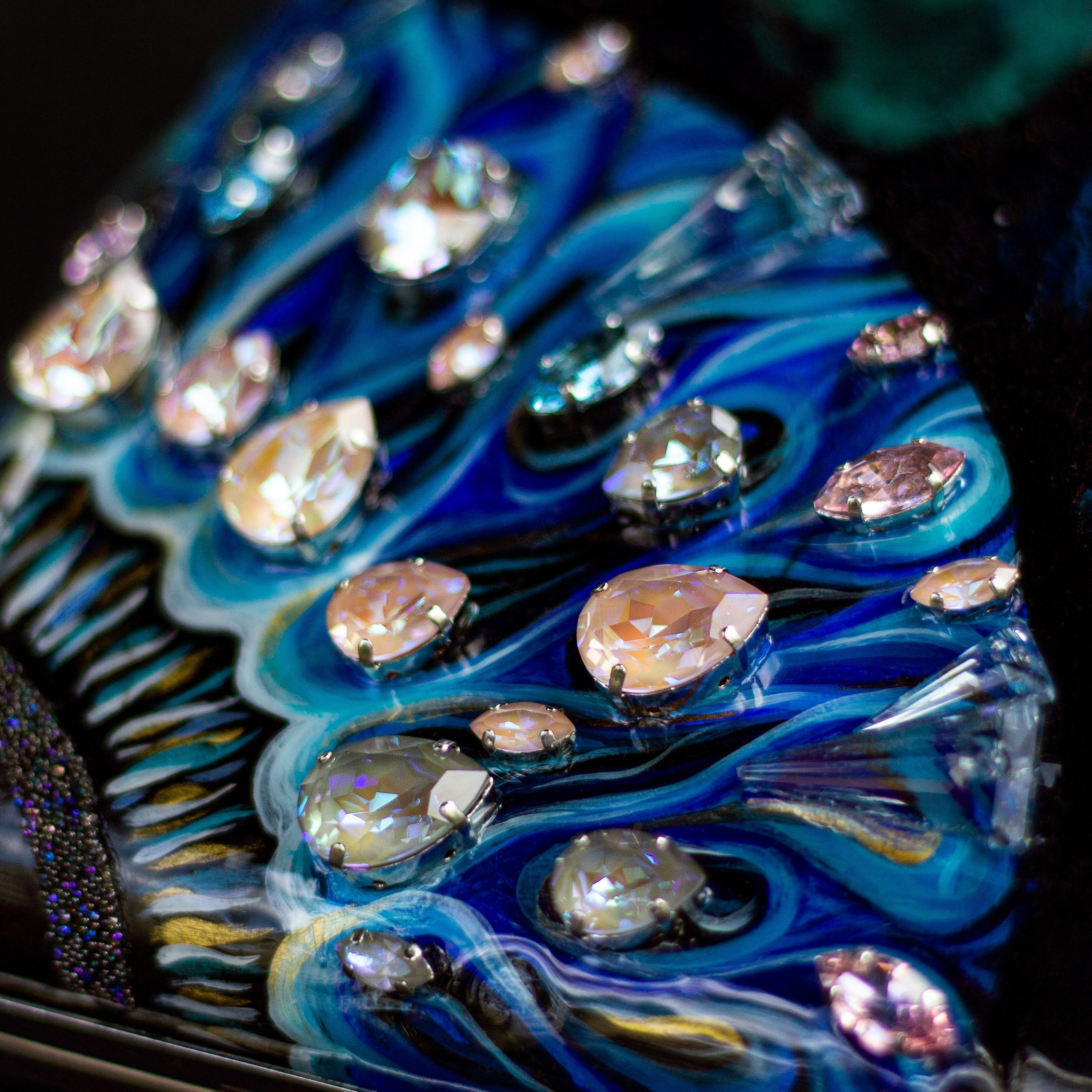 Последняя коллекция Swarovski 2022 "в поисках нового" меня натолкнула на использование новых технологий в декоре сумочки. Здесь сочетаются художественная роспись акриловыми красками и резин-арт (эпоксидная смола), абстракция и конкретика, глянцевые поверхности с блеском страз и кристальной ткани.