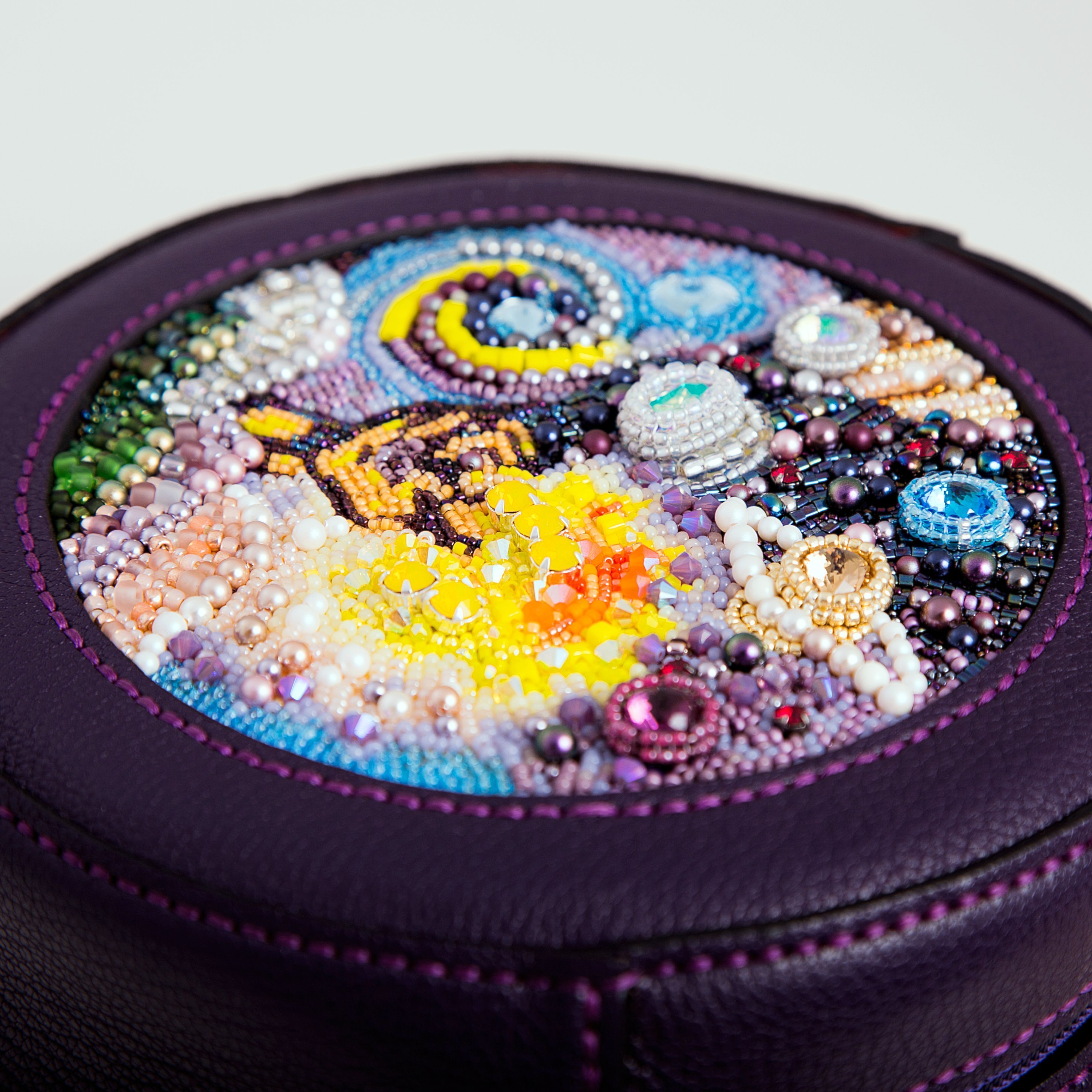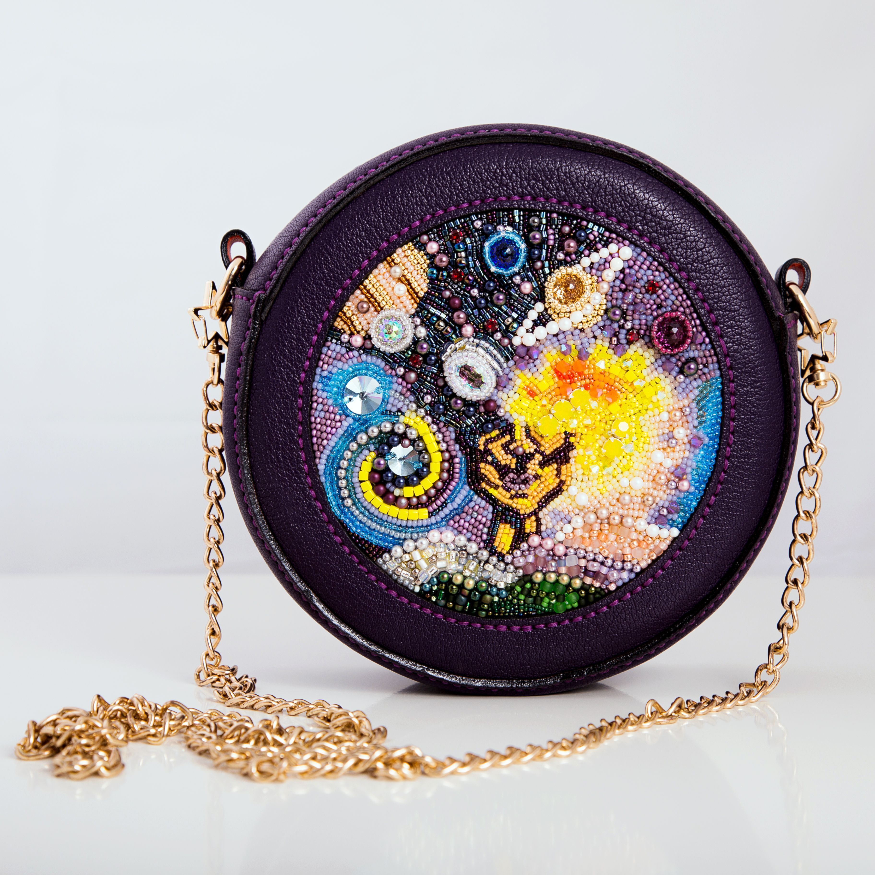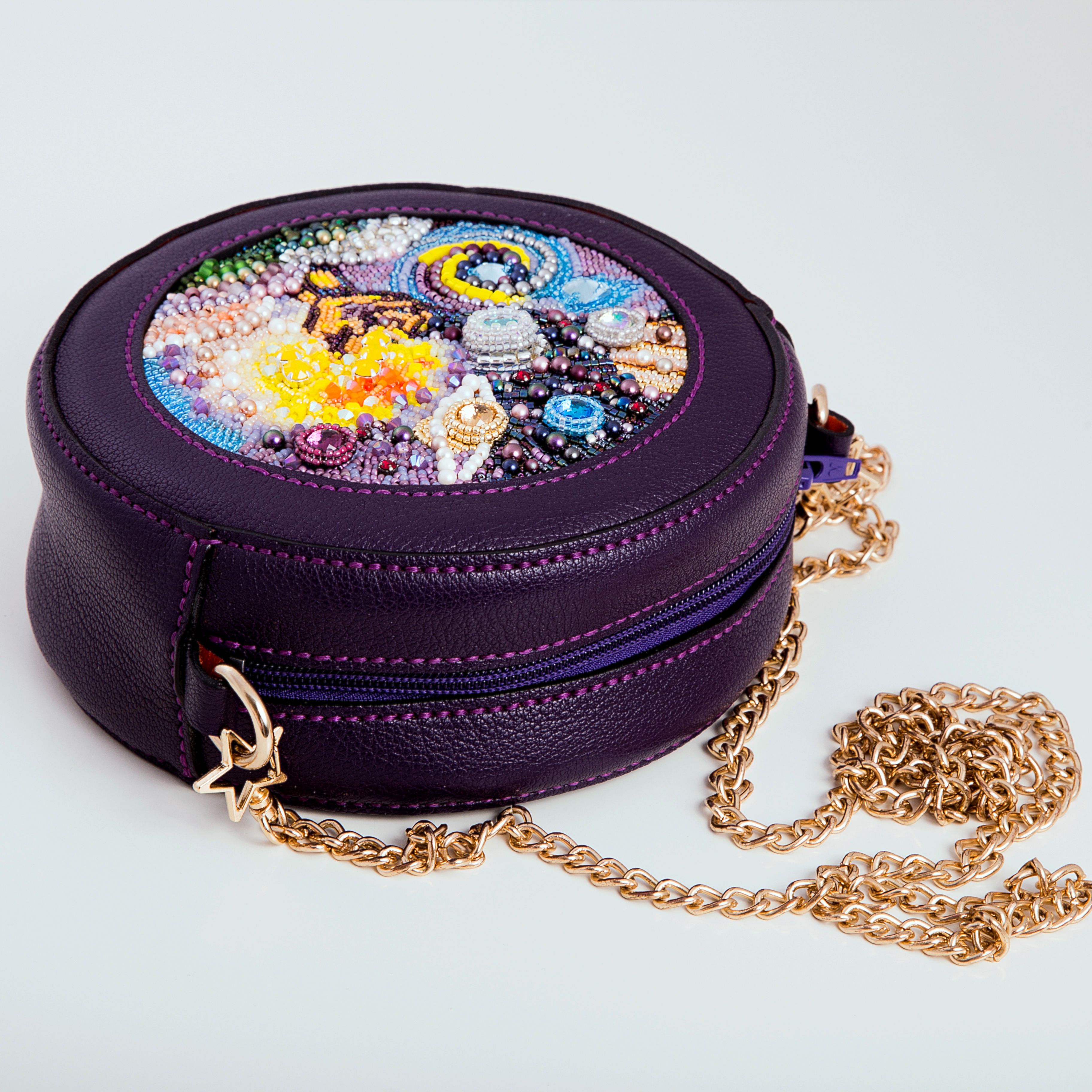 Форма сумки – круг – тоже использована не просто так. Круг имеет огромное количество символов, но я в своей работе применила значение целостности, непрерывности. Хотелось передать идею того, что невозможно разделить человека на отдельные составляющие. Ведь он есть то, как он ощущает и понимает этот мир.