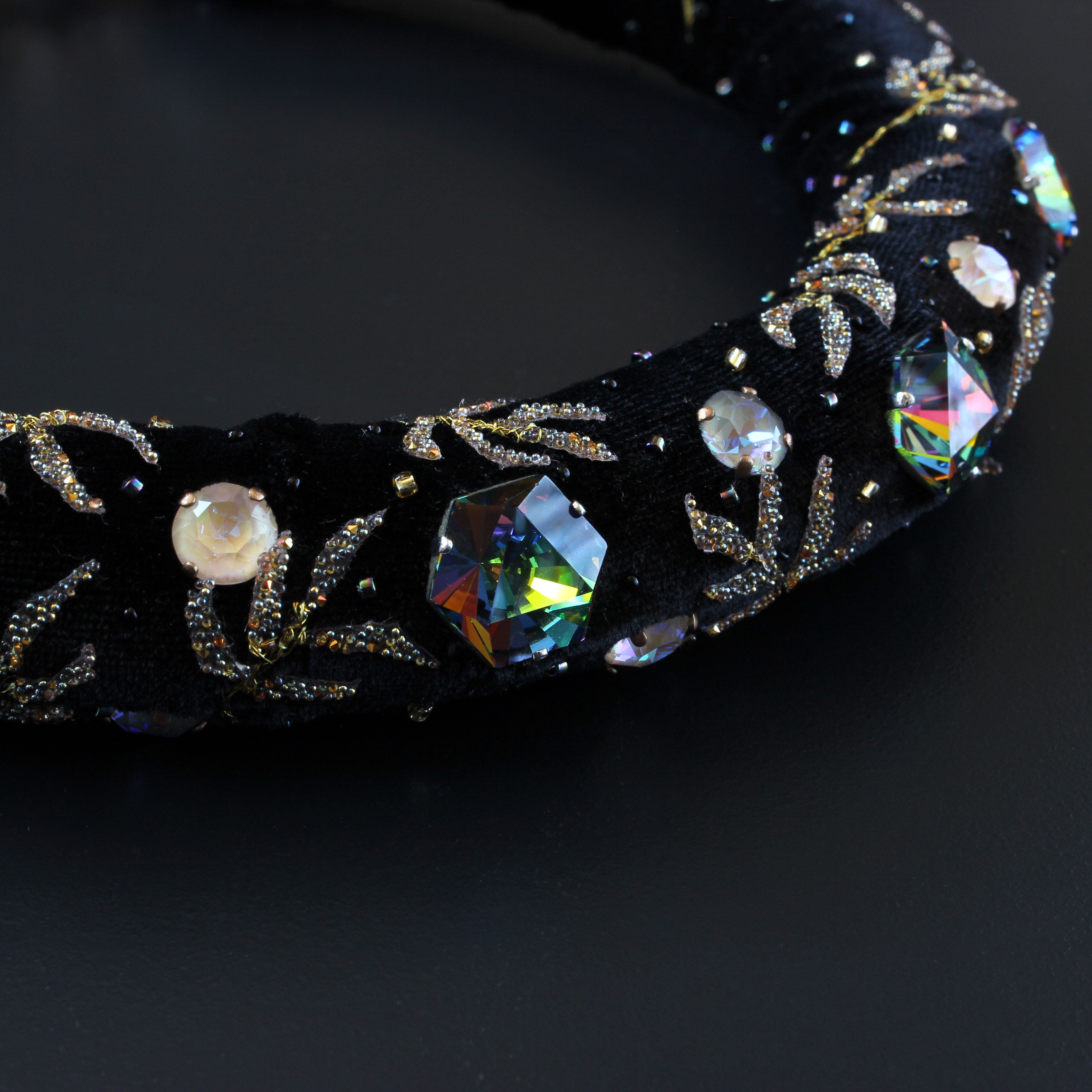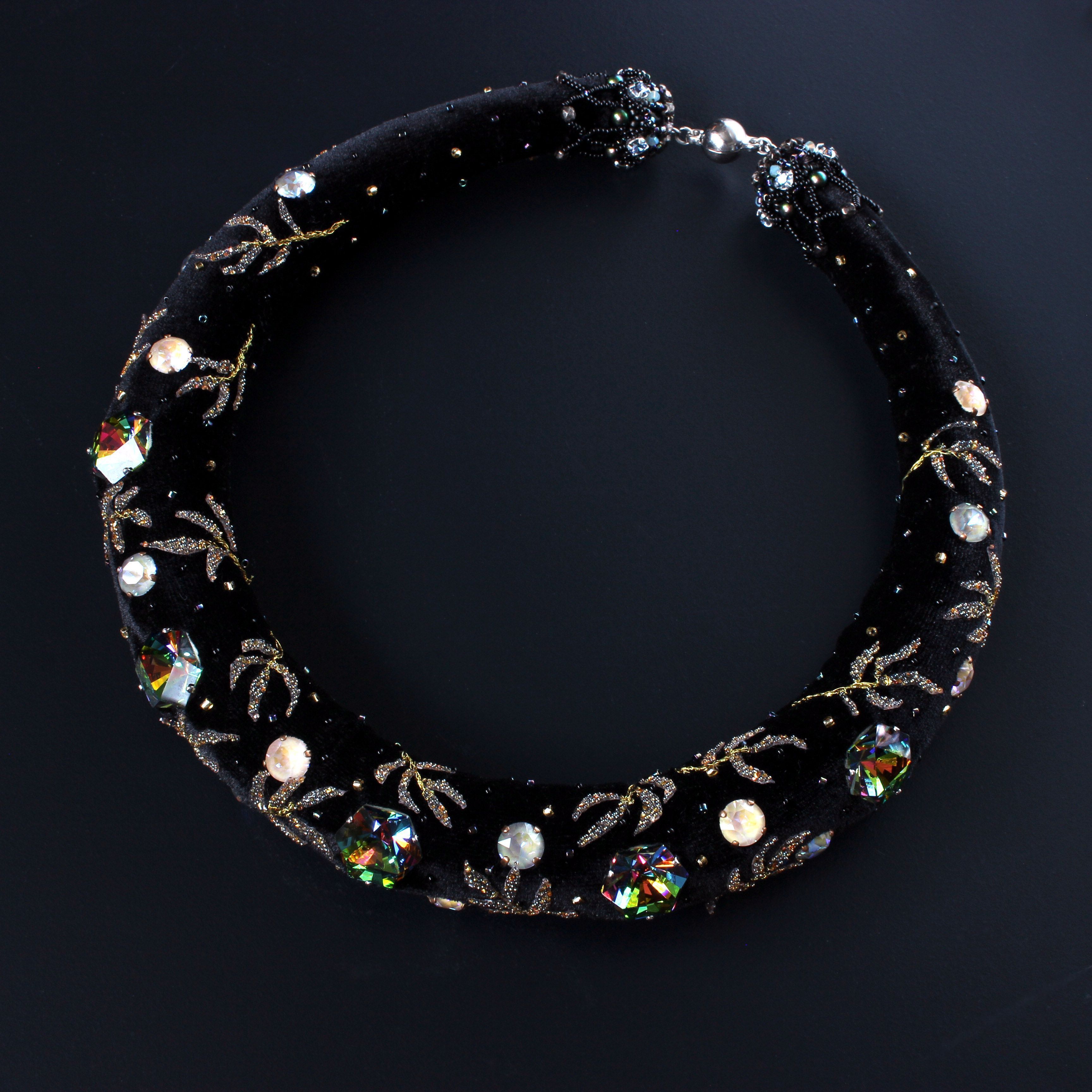 Чёрный бархат — прекрасный фон для блеска кристаллов, на нем они сияют особенно ярко. Мне захотелось создать объёмное, насыщенное блеском украшение, при этом лёгкое, уютное и одновременно благородное. Так вышло украшение в виде мягкого бархатного жгута, расшитого узором из моих любимый кристаллов.