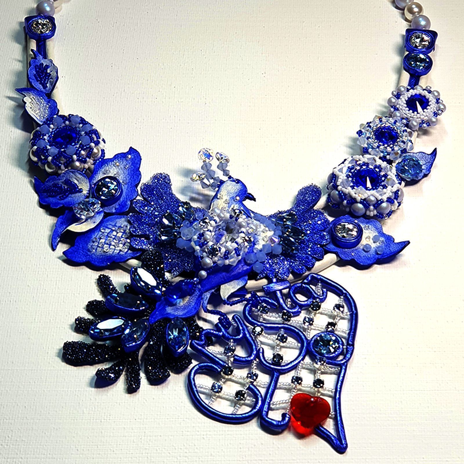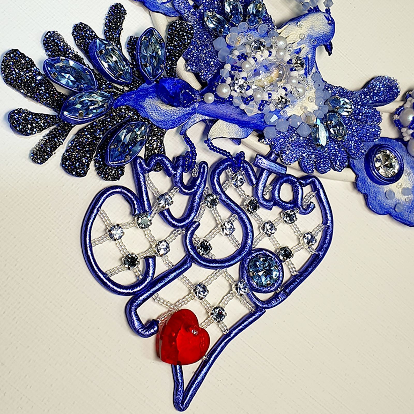 Услышав впервые название конкурса «Crystal Love», мне сразу вспомнилось выражение «Из России с любовью» - так и зародилось название колье. Захотелось создать украшение с самобытным характером, присущим культуре нашей страны. Рассмотрев конкурсные кристаллы, я определилась с цветовой гаммой. Органичная комбинация белого и синего цветов кристаллов, хрустального жемчуга и натуральной кожи, характерные для русской народной росписи «Гжель». Сказочная птица, цветы, листочки соединились в одно целое. Роспись по коже и блеск кристаллов эффектов Ignite, Shimmer, Opal дополняют друг друга. В центре колье сверкающая птица, держащая буквенное сердце с красным огоньком – любви к кристаллам Сваровски.