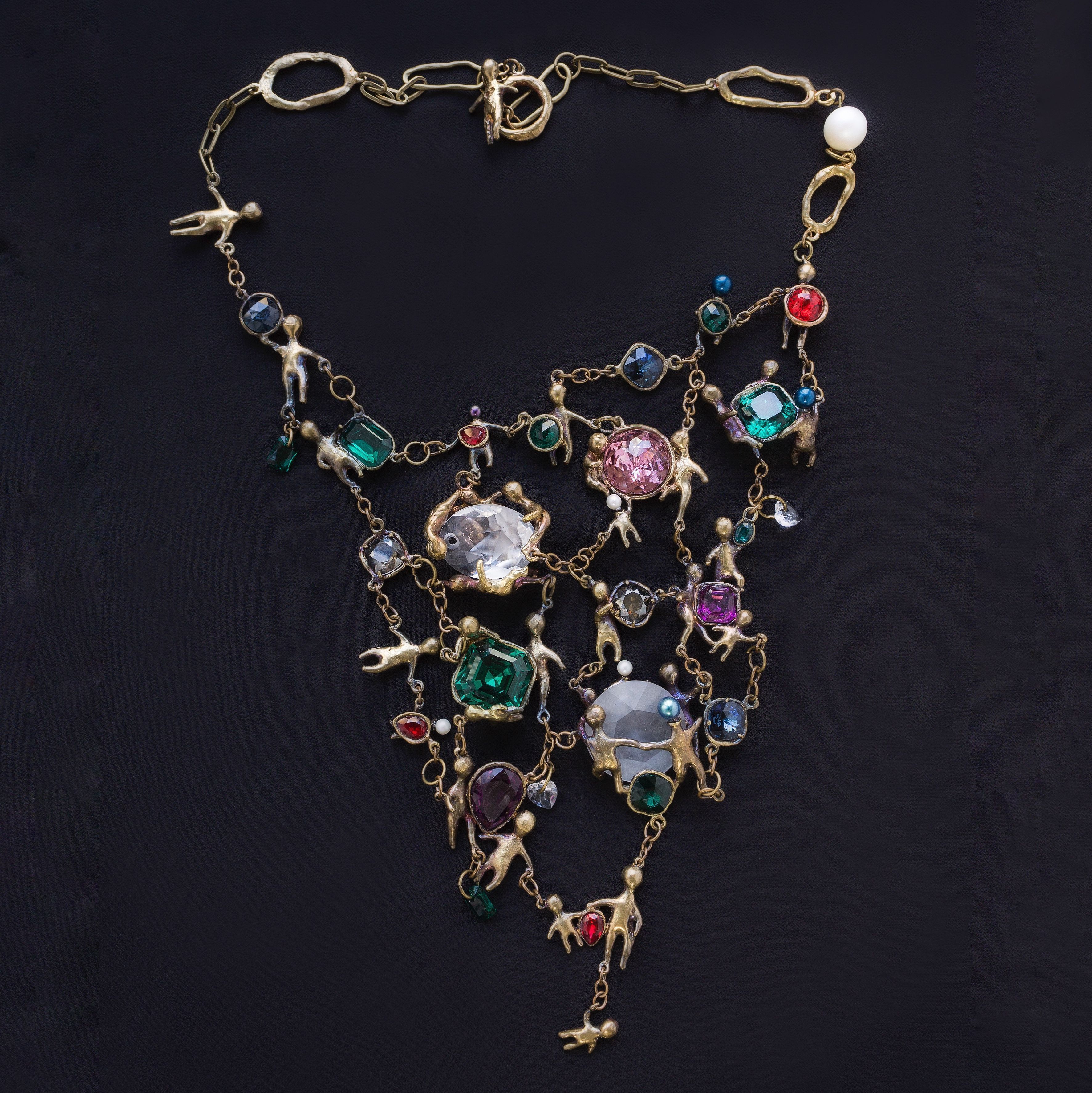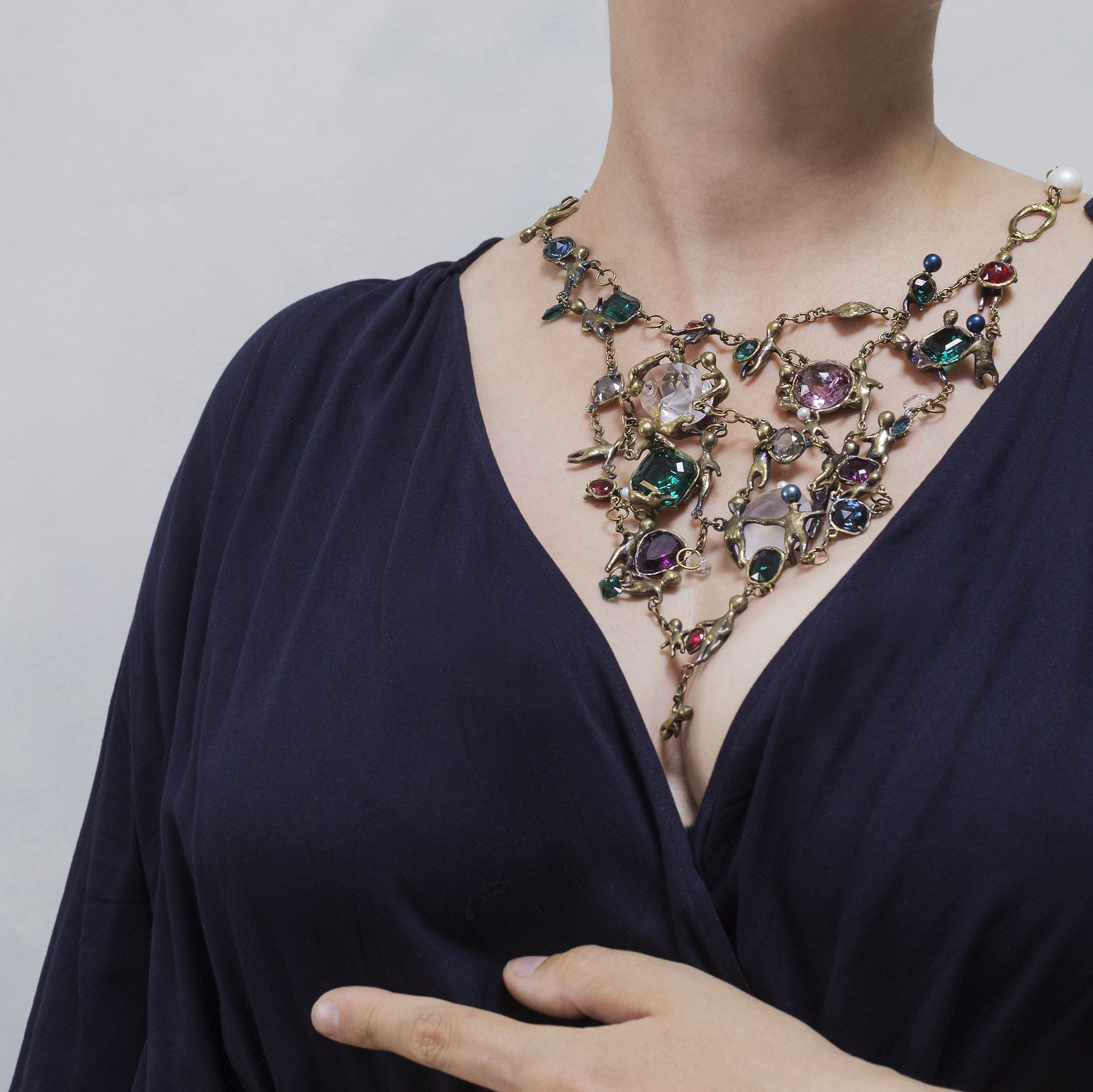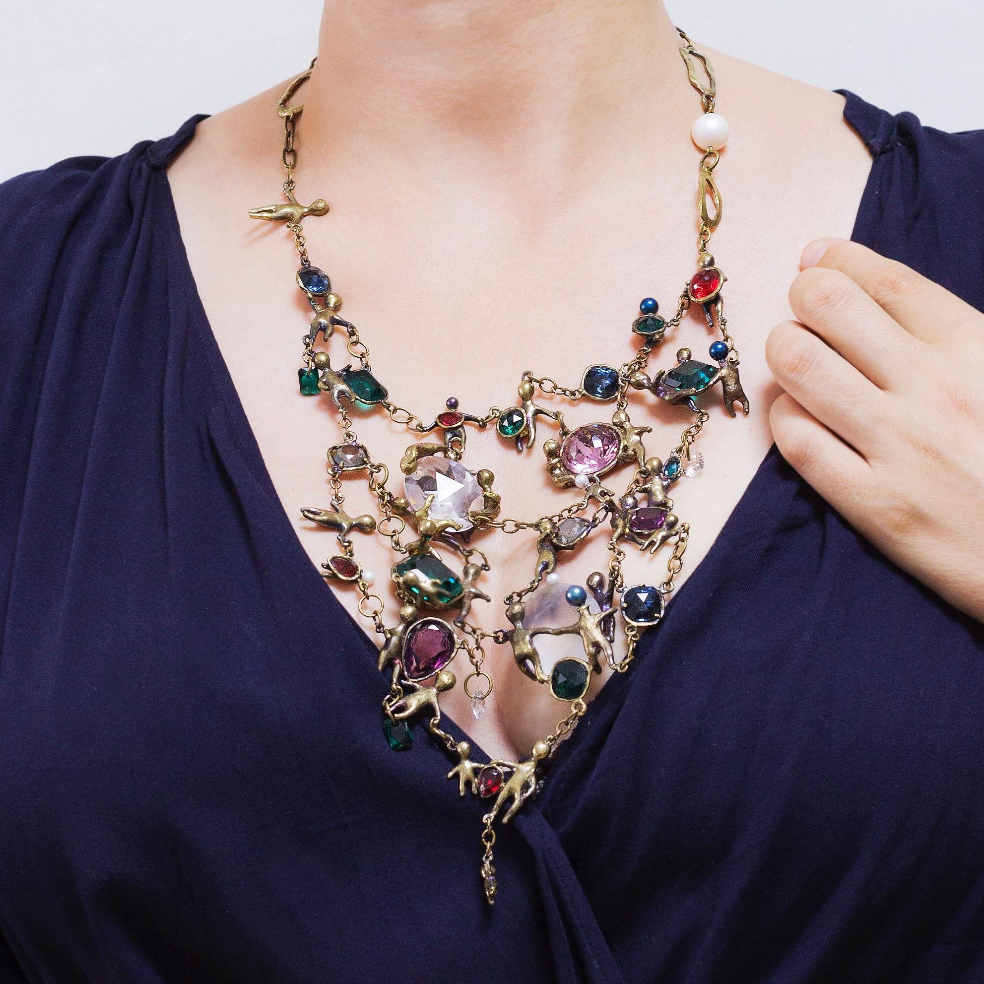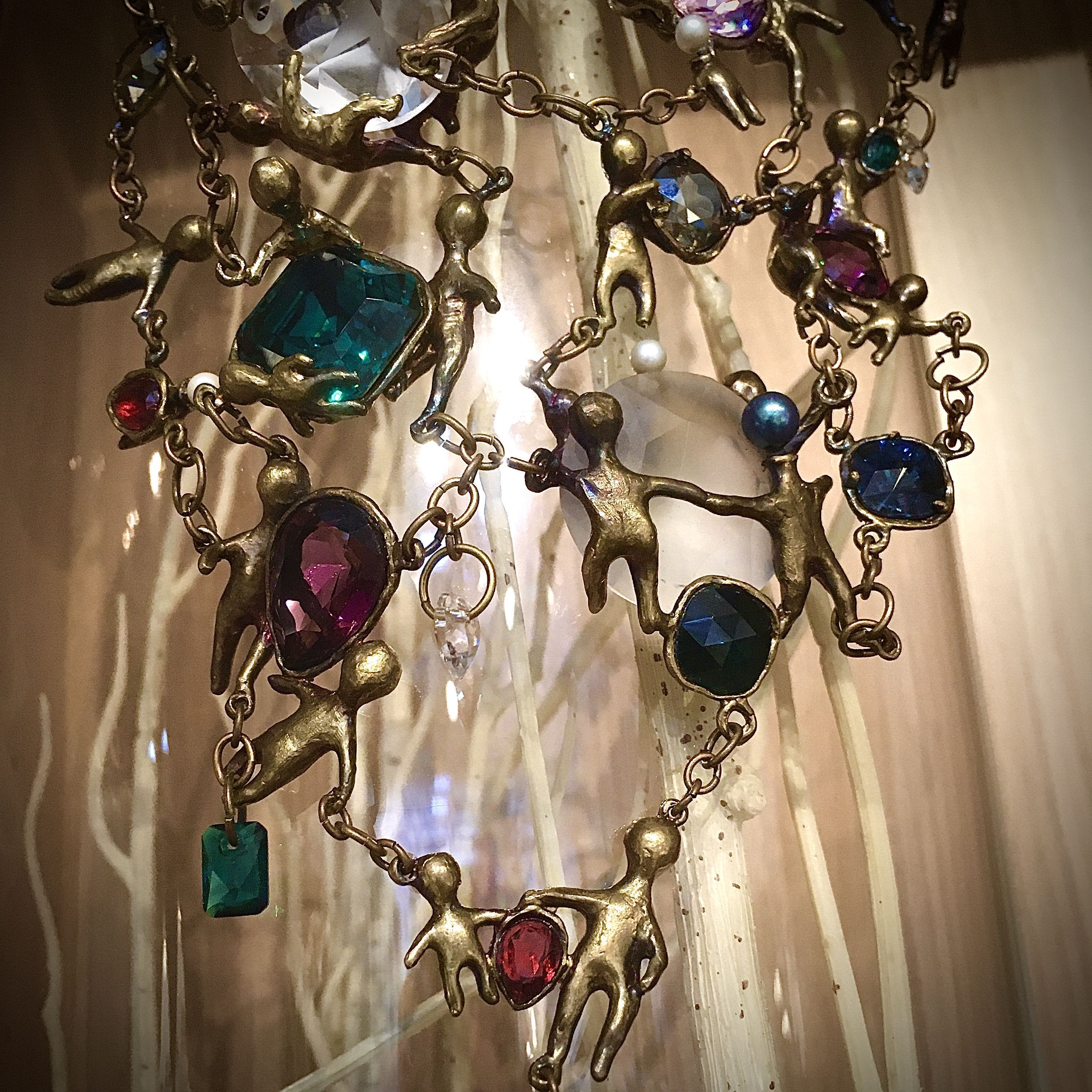 В своём колье я постаралась использовать максимальное количество форм и размеров, и цветов кристаллов. Не побоялась этого «изобилия» - ведь все их объединяют (кроме нашей любви к блеску) латунные оправы - человечки, которые я сделала сама под каждый конкретный кристалл. Это колье рассказ - каждый элемент отдельная история со своими чувствами и идей. Очень надеюсь, что вам понравится созерцать это произведение.