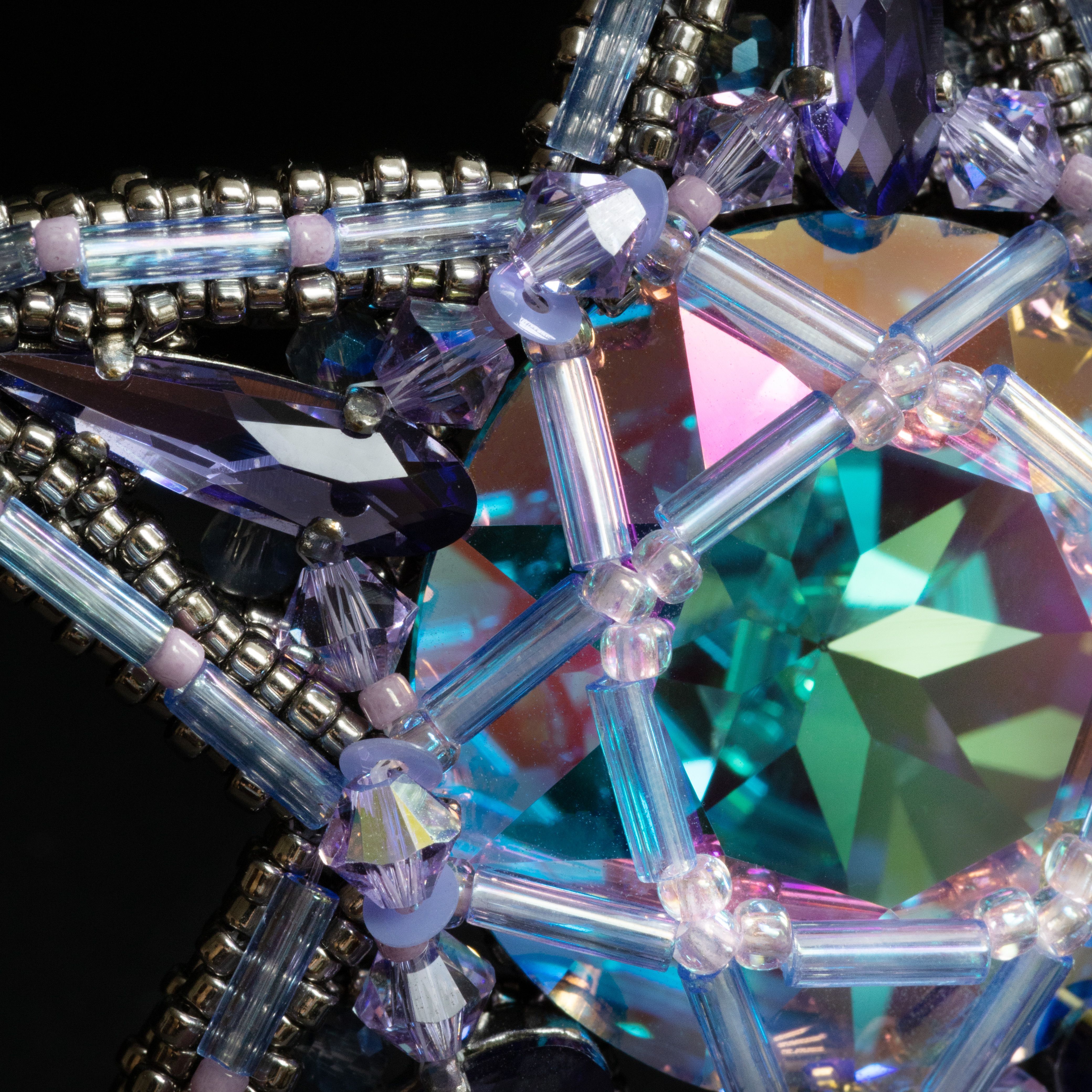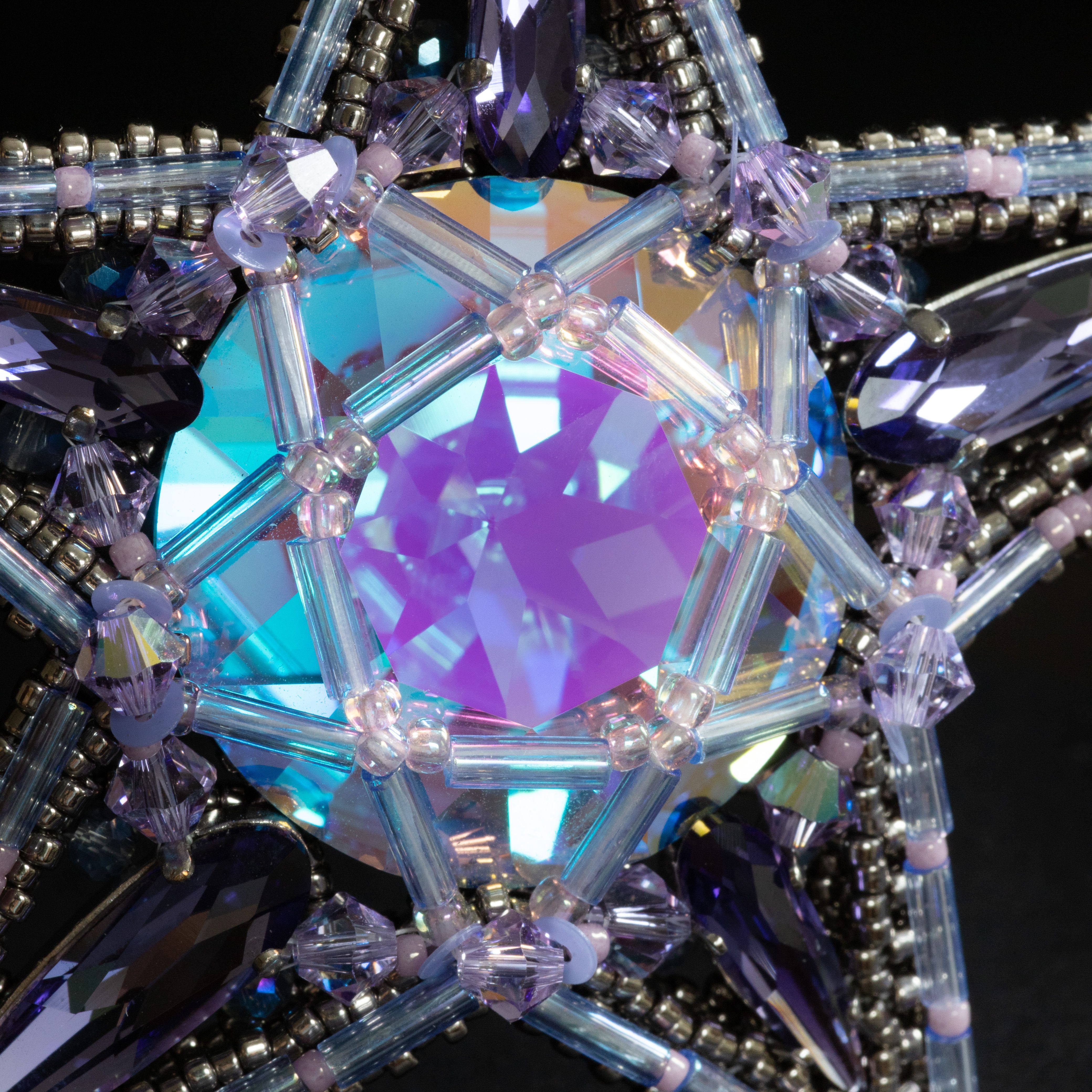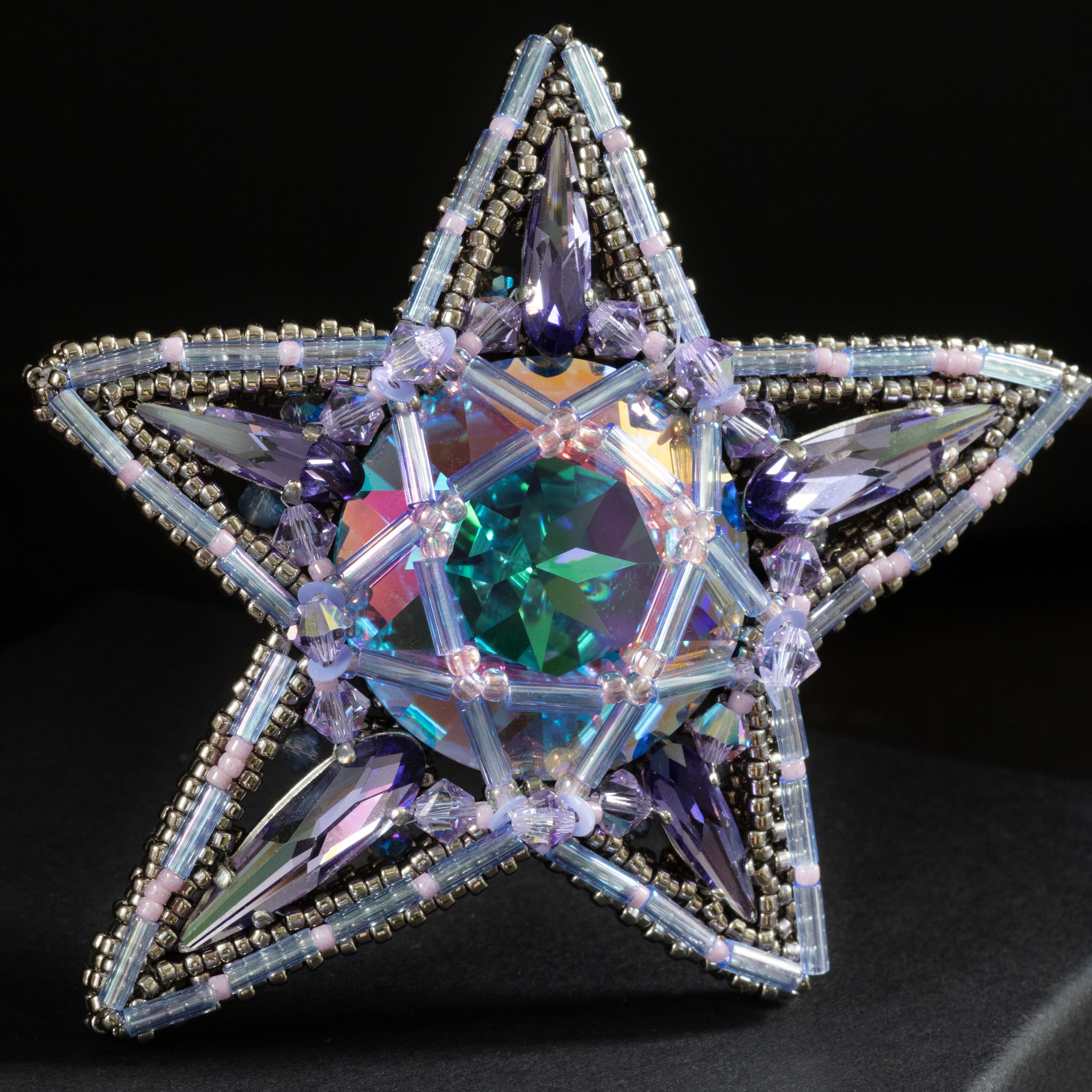И вот из этих кристальных частиц появилась моя брошь - с обычным названием «Звезда», грани которой сверкают и восхищают!!! Разноразмерные лучи обрамляют сердце работы - восхитительный кристалл, окутанный стеклярусной паутиной с вкраплениями бусин и пайеток. Каждый элемент дополняет друг друга, переливаясь на свету.