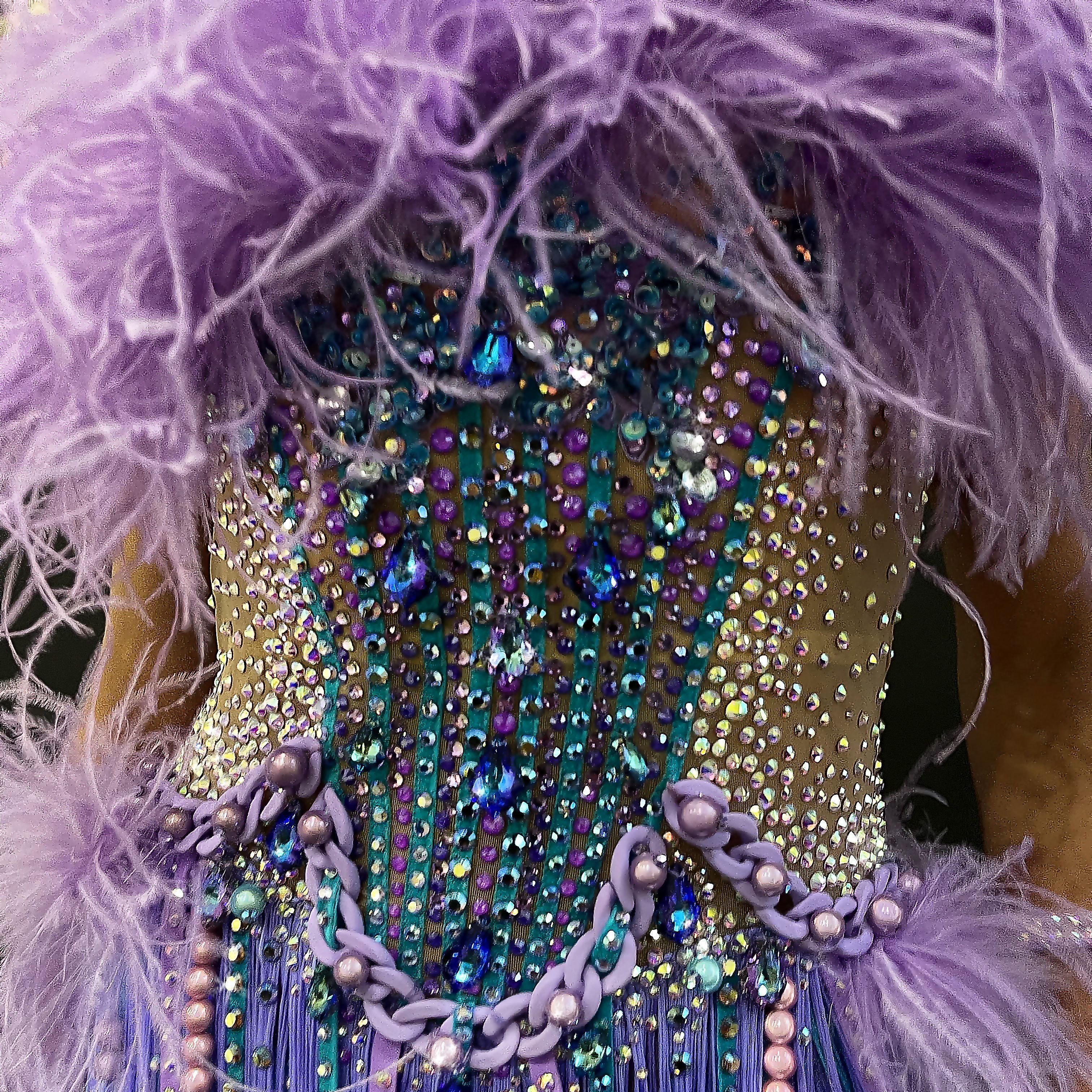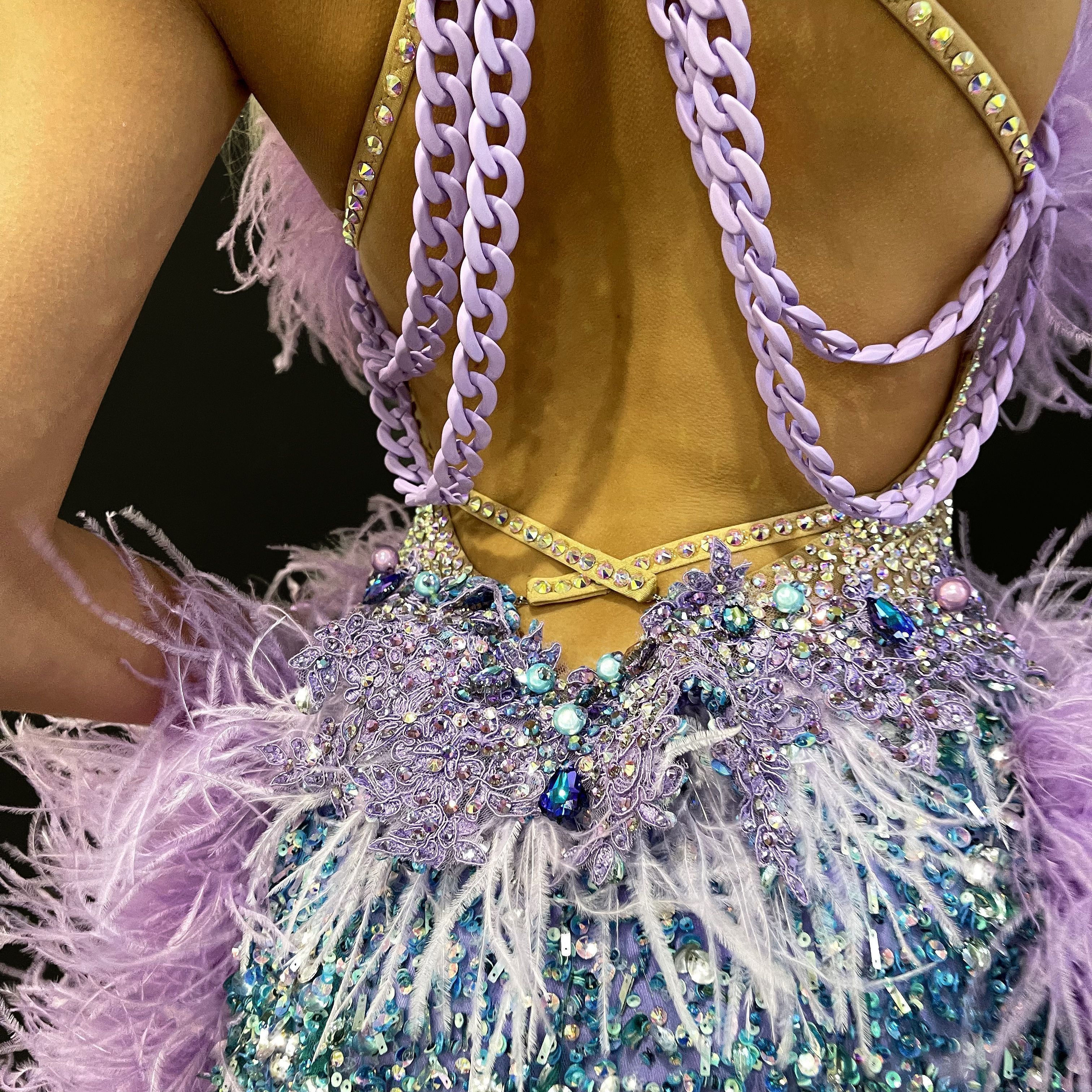 Благородный перелив барочных кристаллов Vitrail Light и Heliotrope. Сияние страз с непревзойдённым эффектом Aurora Borealis. Ручная вышивка,  лёгкие струящиеся перья цвета Lilac. Всё это раскрывает  страсть, нежность и изящность моей работы. В движении под звуки румбы или ча-ча-ча можно увидеть как раскрываются грани вселенной .EVOLI
