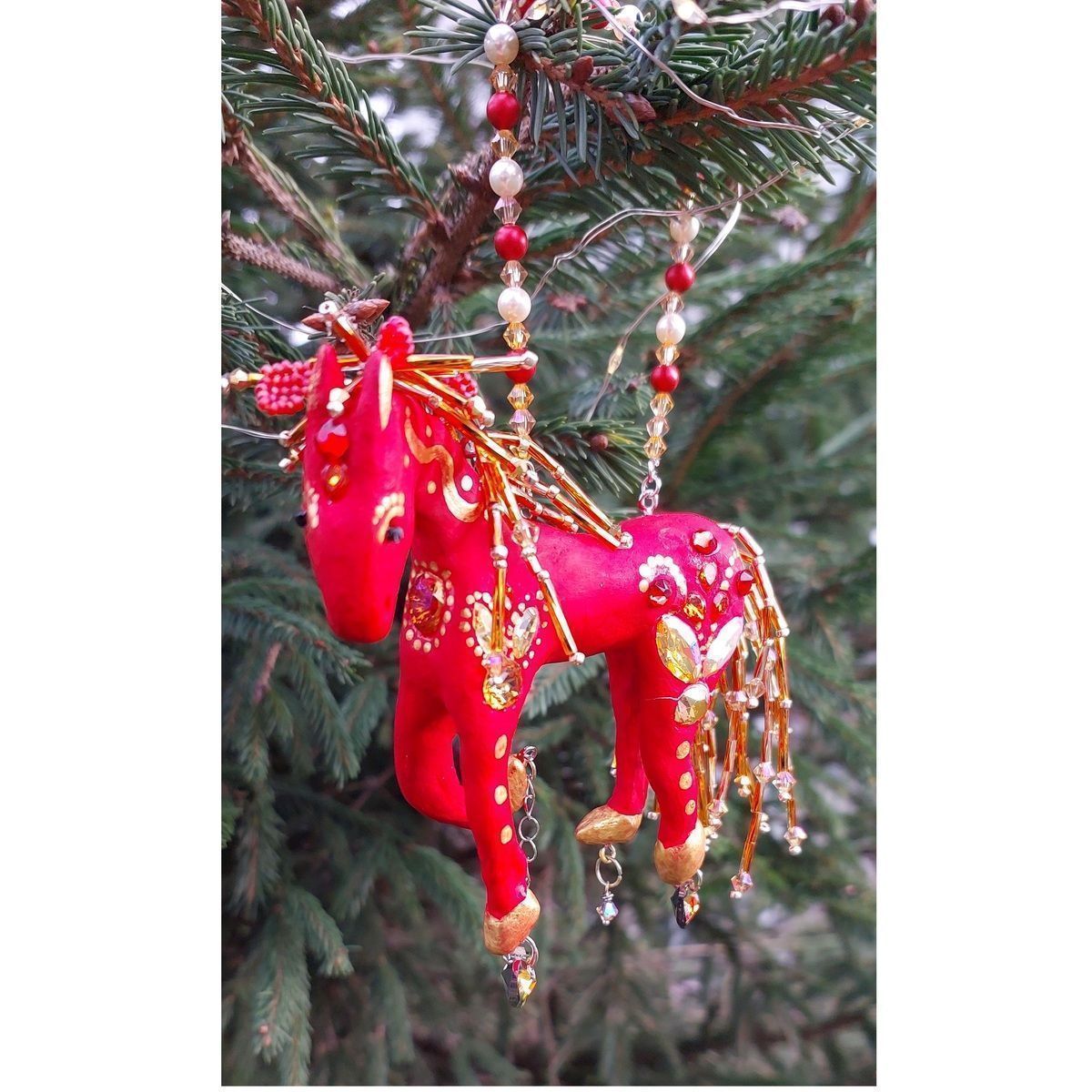 Кристаллы являются здесь частью игрушки, грива и хвост выполнены из бисера и