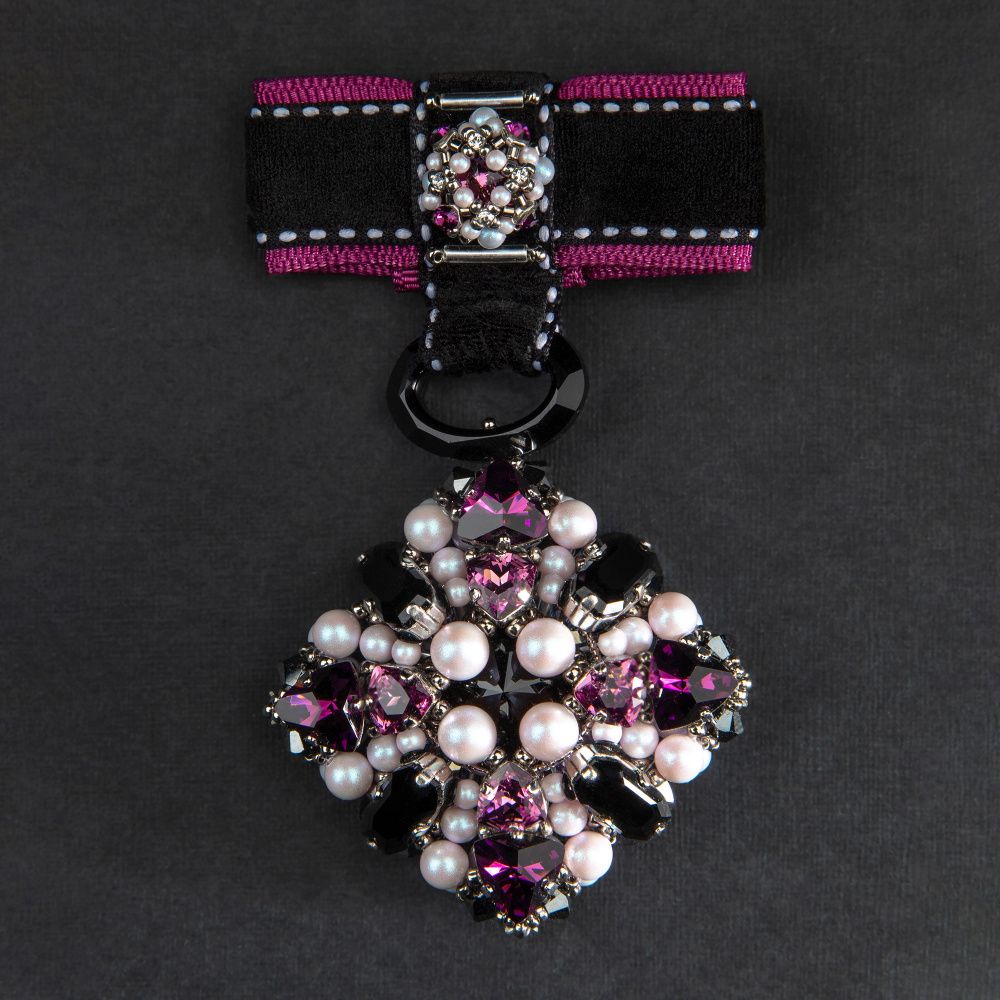 Орден выполнен в технике бескаркасного бисероплетения, а вдохновением для этой работы послужили непревзойденные цвета жемчуга и элегантные формы кристаллов Swarovski.