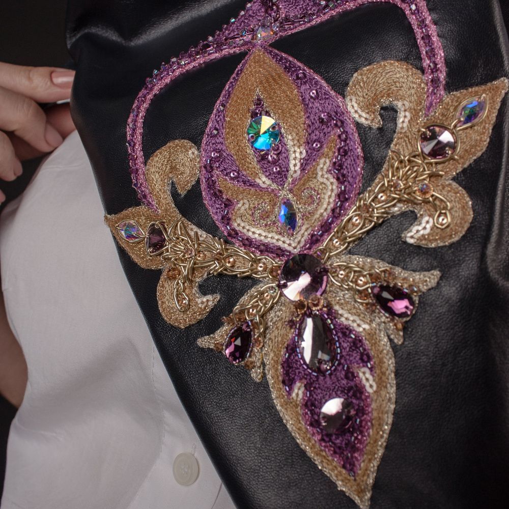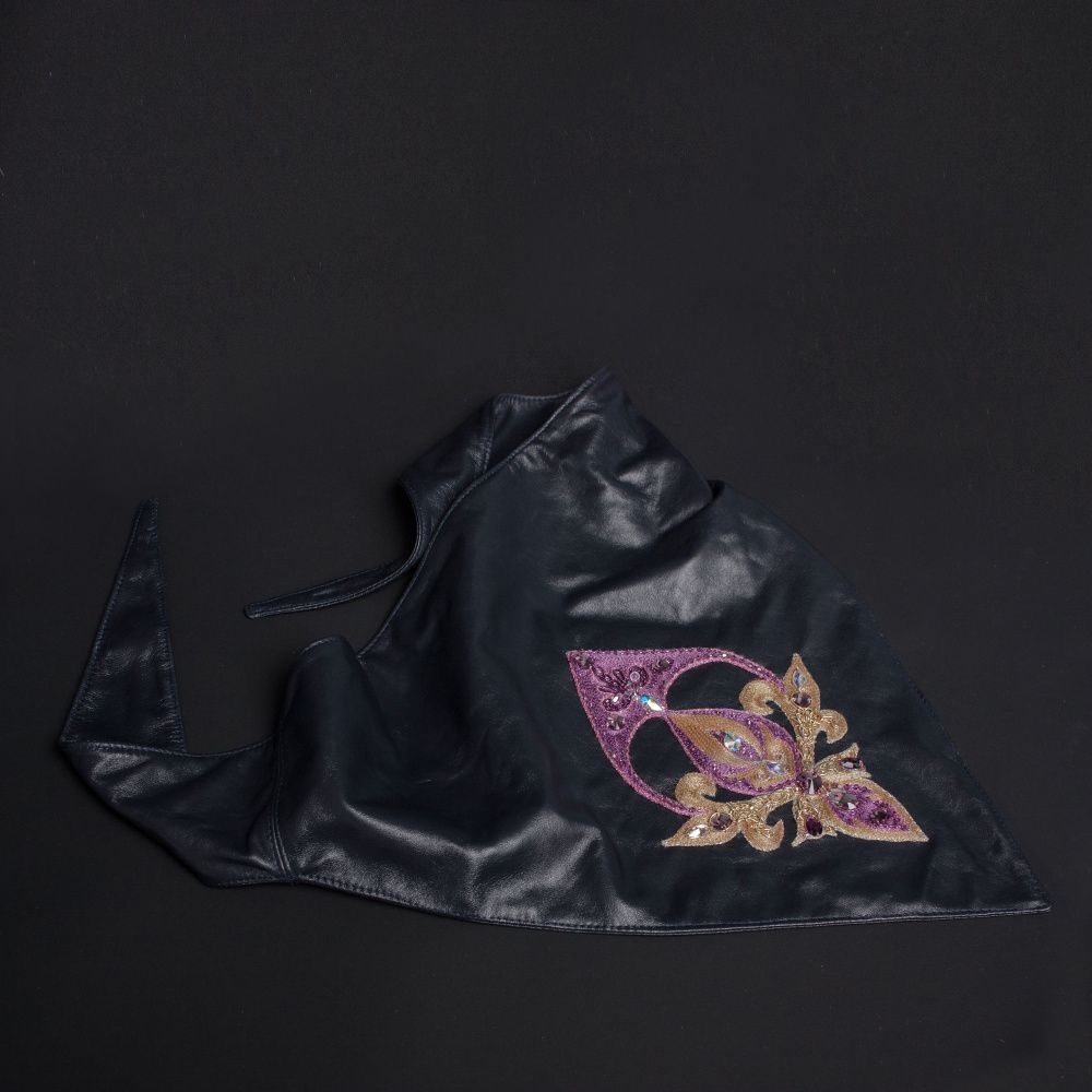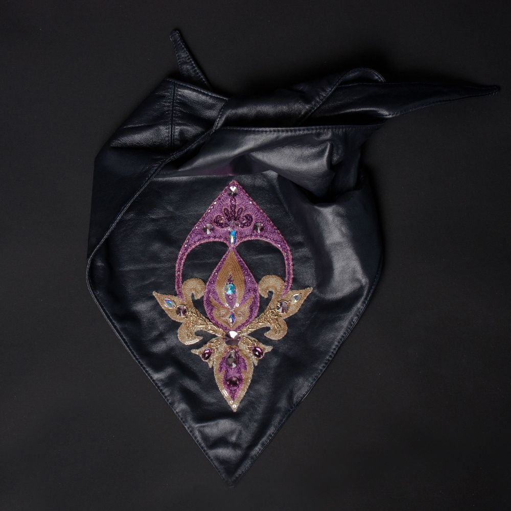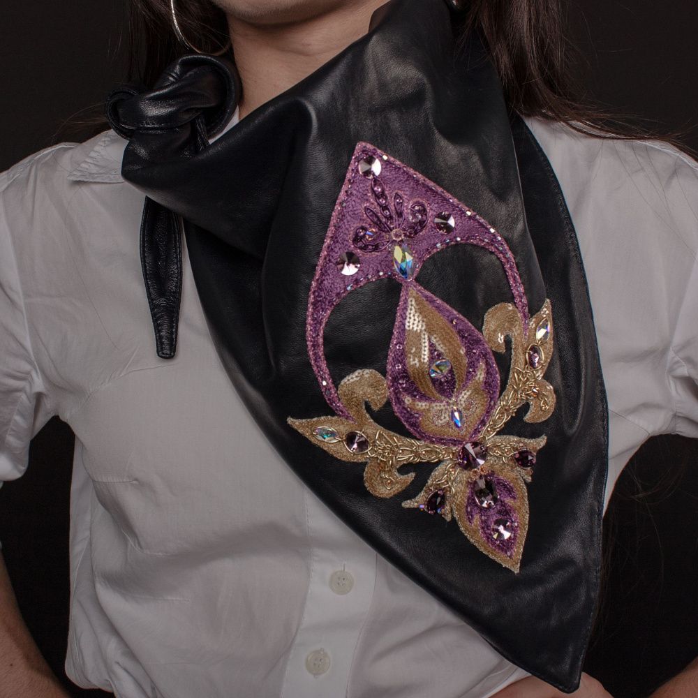 Именно таким я и вижу платок в современном мире. Дерзость кожи и яркость камней сплелись воедино. Это аксессуар, который говорит громче любых слов.