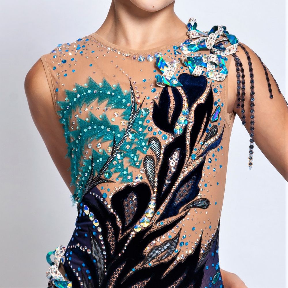 Природа ― самый необъятный источник вдохновения. Она загадочна, бесконечно прекрасна и многогранна. Одно из самых божественных созданий природы, несомненно, женщина. Женщина и природа вторят друг другу. Женщина естественна, свободна как стихия, тиха, как робкий шелест листьев, нежна, как роза. Дизайн купальника для художественной гимнастики воплощает всю многогранность истинной природной женственности. Винил ― один из тех материалов, который совмещает в себе множество достоинств, делающих его уникальным: это эластичность, блеск, прочность и изящность. Аккуратно приютившаяся полосочка винила на плече олицетворяет ленту мёбиуса, простейшую, но при этом неориентируемую поверхность, показывает такую простую, но сложную красоту, придает объем и фактурность купальнику. А аккуратно разбросанные кристаллы Swarovski, словно капли теплого дождя, устало отдыхают после жестокой бури на раскинувшихся молодых и свежих листьях.