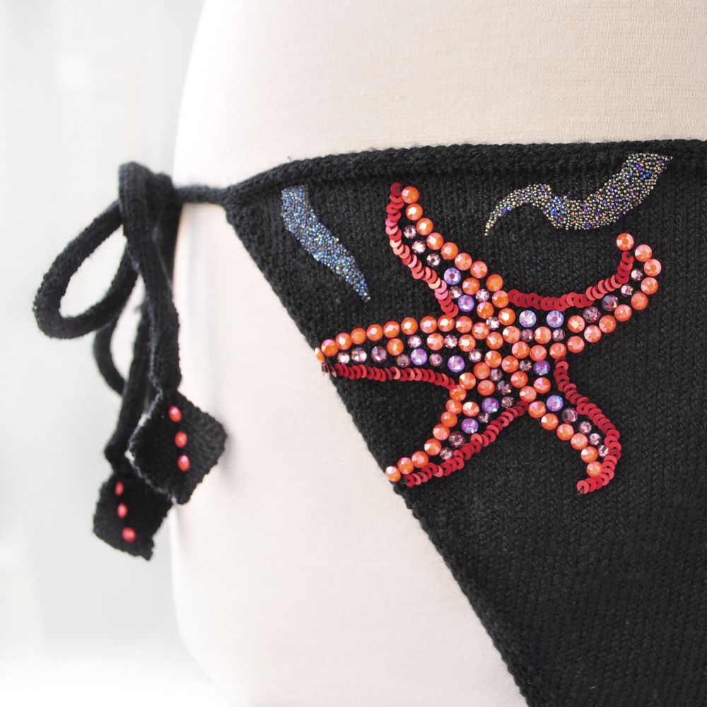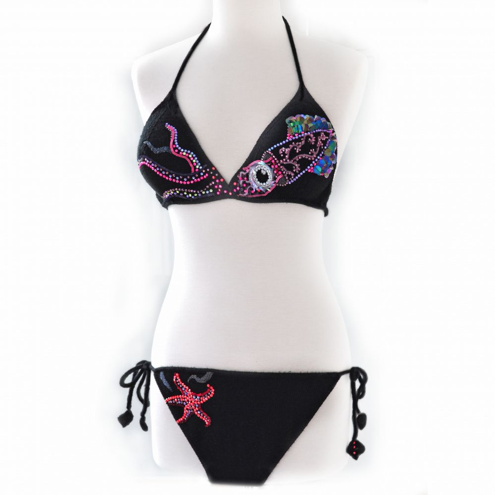 Материалы для дизайна выбраны по принципу легкости, поэтому основным материалом стали клеевые кристаллы, которые можно использовать в купальниках для плавания, а так же пайетки.