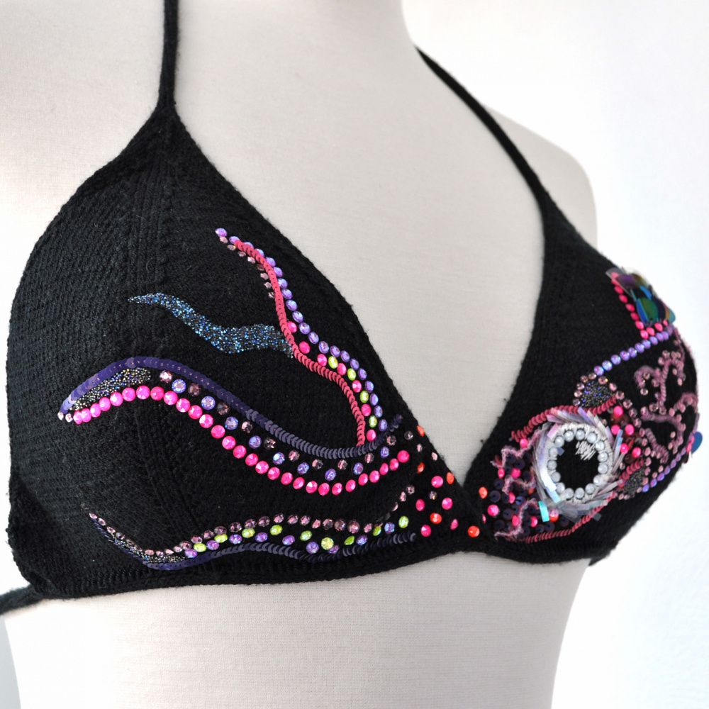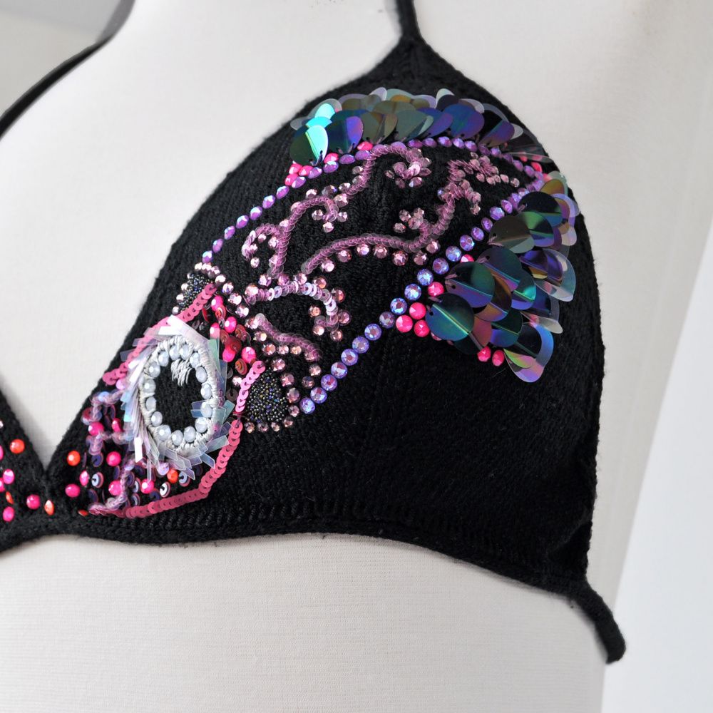 Где как не в темных глубинах океана открываются новые грани сияния? Глубоководные обитатели еще далеко не все изучены, а сколько еще их предстоит открыть? Сколько завораживающе мерцающих неоновых чудищ сейчас охотится и таится в глубинах мирового океана... Именно такими образами вдохновлялась я, когда нащупывала идеи для конкурсной работы: черная глубина океана и игра неоновых огней ее обитателей. Так пришёл образ кальмара, а в качестве носителя изображения решила использовать раздельный черный купальный костюм. Его для меня связала моя мама.
