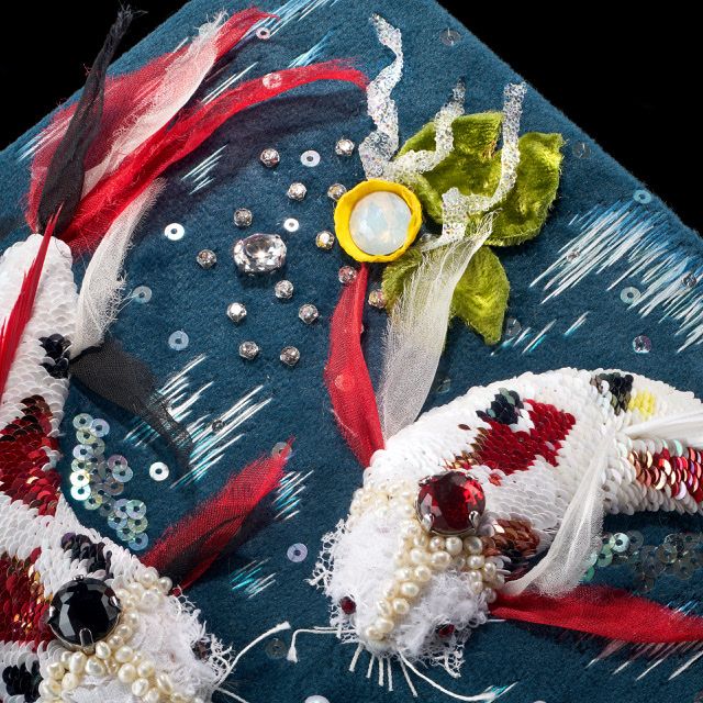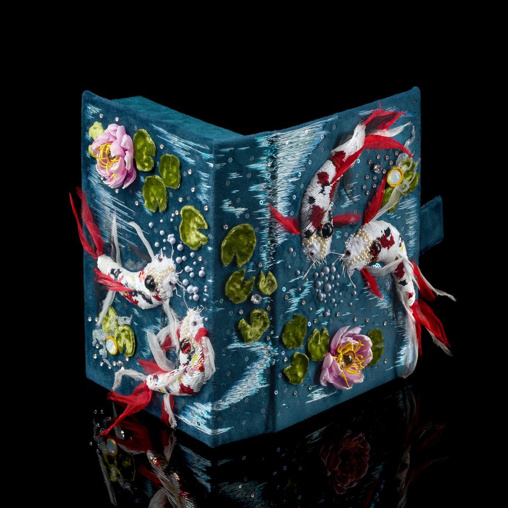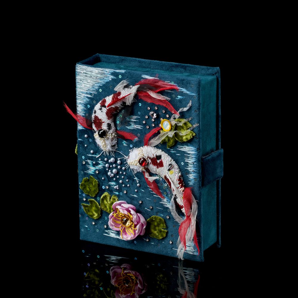 Моя работа основана на этой прекрасной легенде и как мне кажется, она идеально вписалась в тему конкурса: на одной стороне клатча Кои плывут по течению , а на второй стороне - против. Этот год выдался неимоверно сложным, но именно он во многих раскрыл скрытые потенциалы. Мы словно эти самоцветные рыбки олицетворяющие собой волю и упорство умело справлялись с жизненными трудностями. Одни сдаются, а другие, как и я, продолжают свой путь по водопаду, оттачивая Новые Грани Сияния.