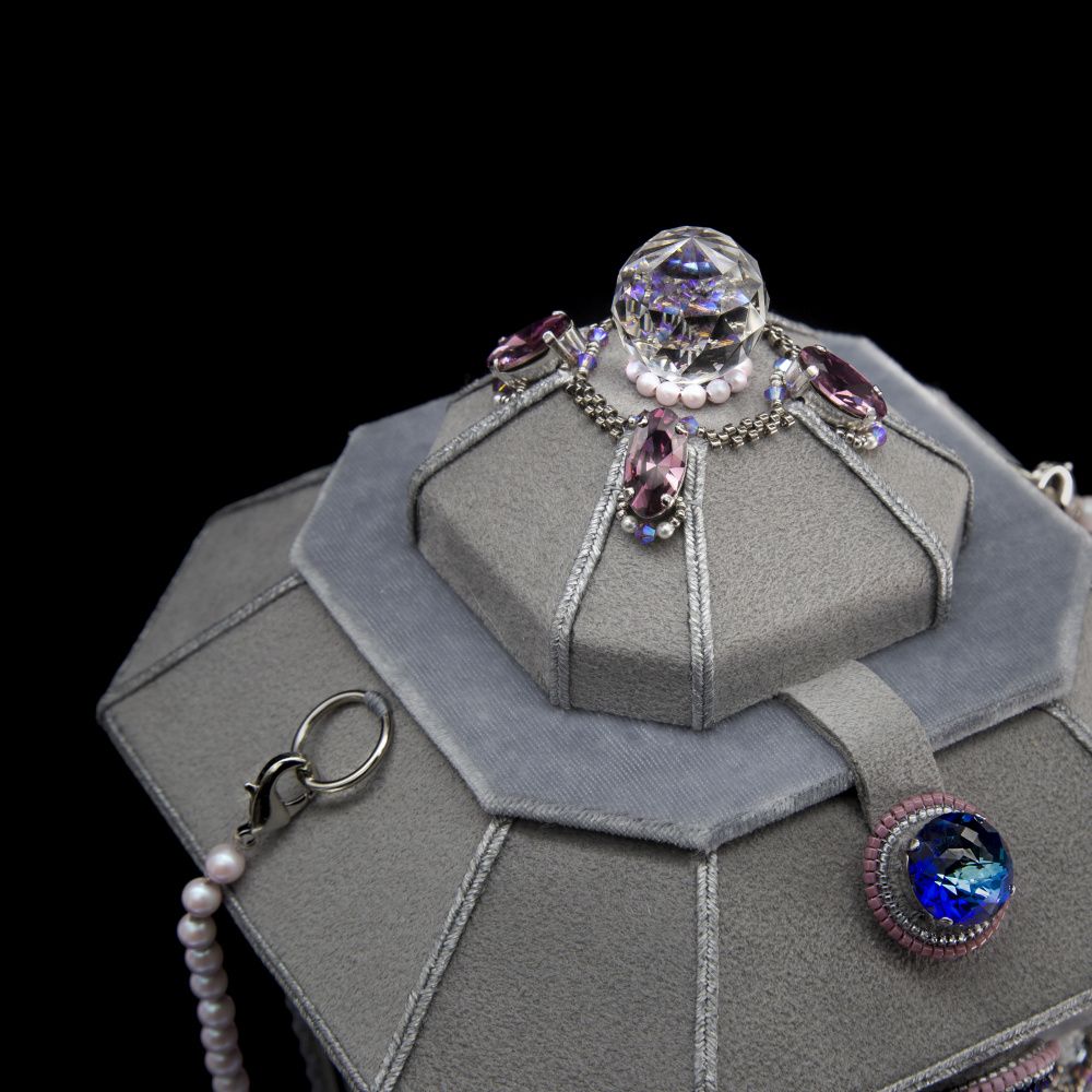 Так же сумочку украшают кристаллы новых форм. Мне захотелось с ними поиграть. Так появились тела стрекозок. Это новый кристалл Dome Round, покрытый кристальной тканью. Смотрится волшебно!