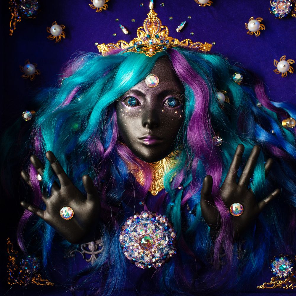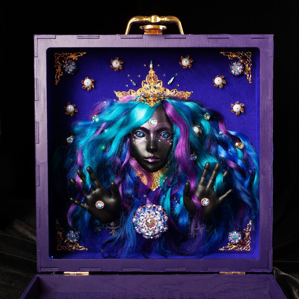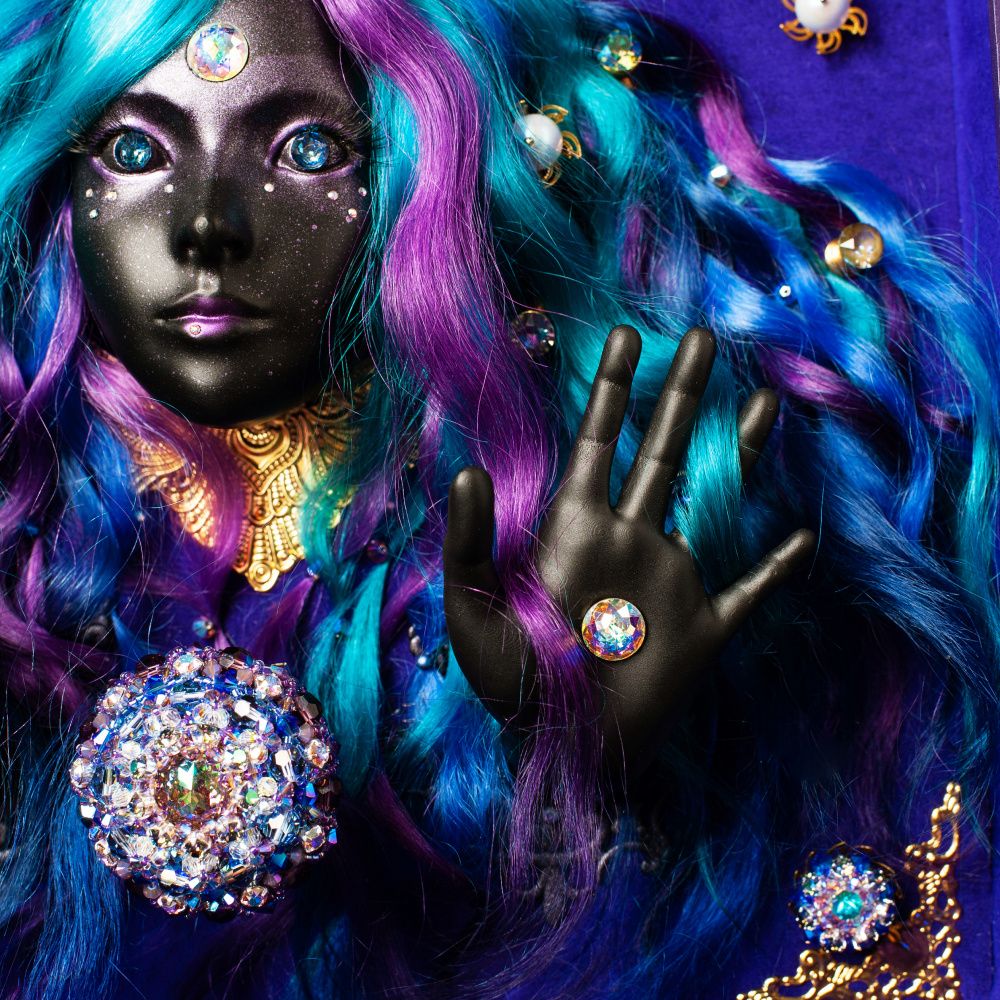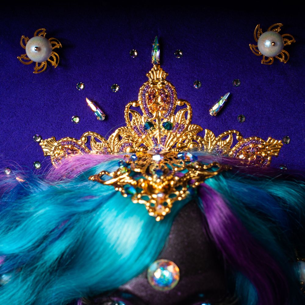 Волосы выполнены из шерсти козы окрашенной вручную и расшиты биконусами и шатонами.