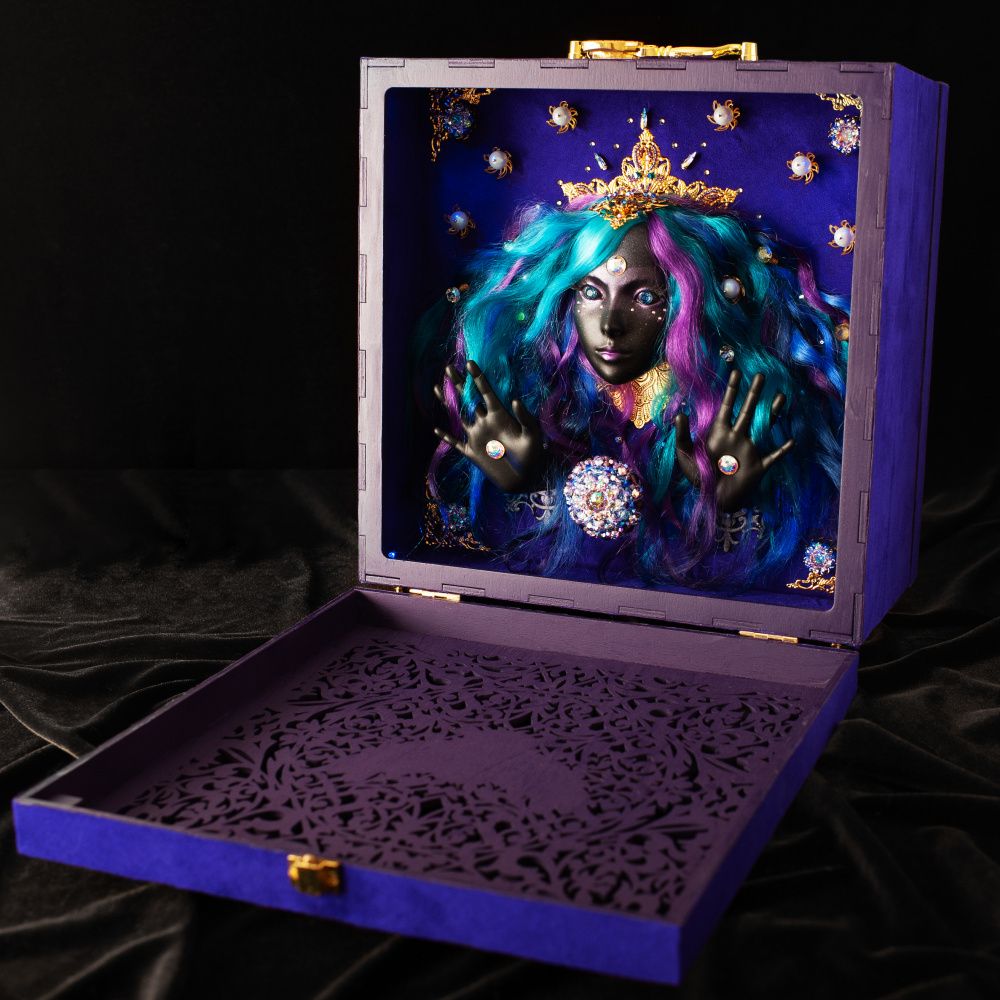 При открытии сумки включается подсветка. Голова и руки окрашены вручную. Глаза богини выполнены из кристаллов шатонов с эффектом ignite и имеют внутреннюю подсветку.