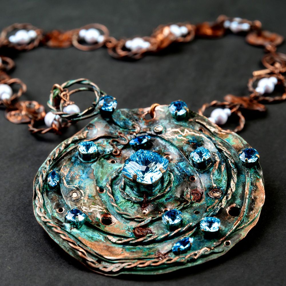 Моё колье — это прекрасные и завораживающие стихи Александра Блока выраженные в меди. Если присмотреться, то в колье можно увидеть и реку и звезды, и центральный кристалл- душу.Вокруг которого всё и вращается. Такой совершенный в своей холодной красоте. Несколько слоёв патины помогают передать «течение реки», а кристаллы это конечно же звезды.Но главнее всего душа- от нее очень трудно оторвать взгляд.