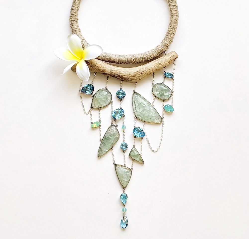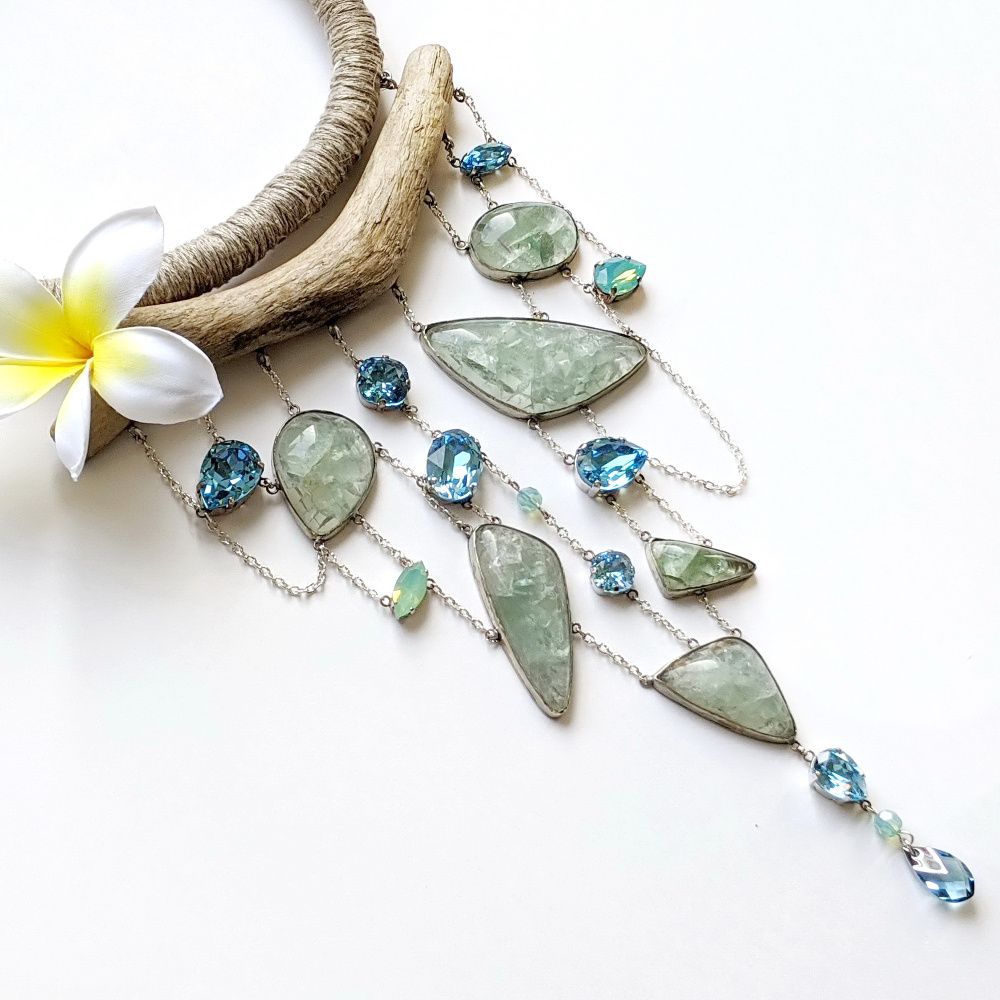 Химия между нами случилась в секунду. Прекрасные прозрачные кристаллы и такие же прозрачные натуральные флюориты. Все оттенки воды, текучая форма, максимально простой дизайн и экологичные материалы. Я только осваиваю ювелирные техники, но идея требовала именно такого воплощения. Мне хотелось вывести на первый план природные фактуры и показать: это сочетание, элитные кристаллы и натуральные материалы, имеет право на жизнь! Своеобразный вызов миру гламура, красота простых форм и чистых цветов.
