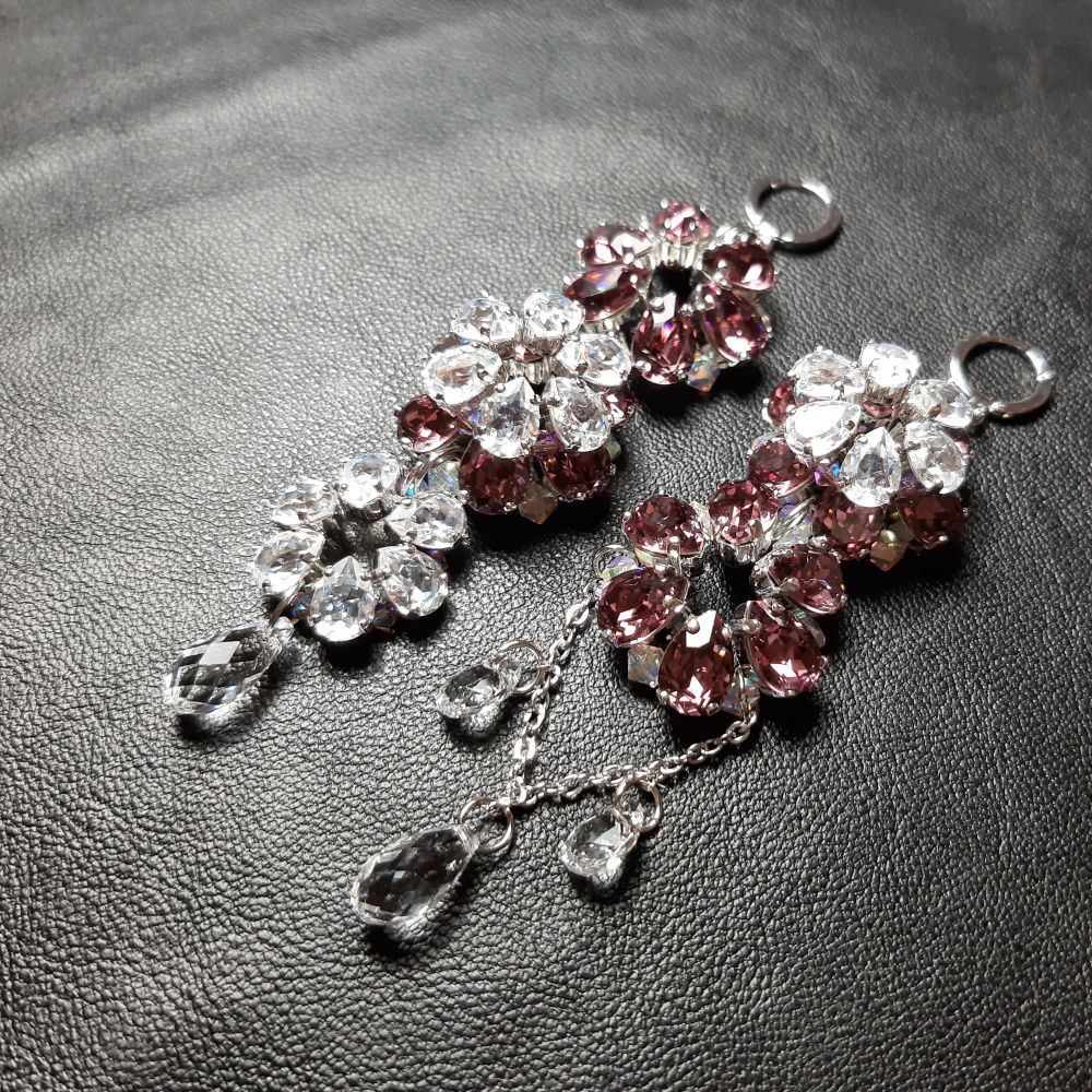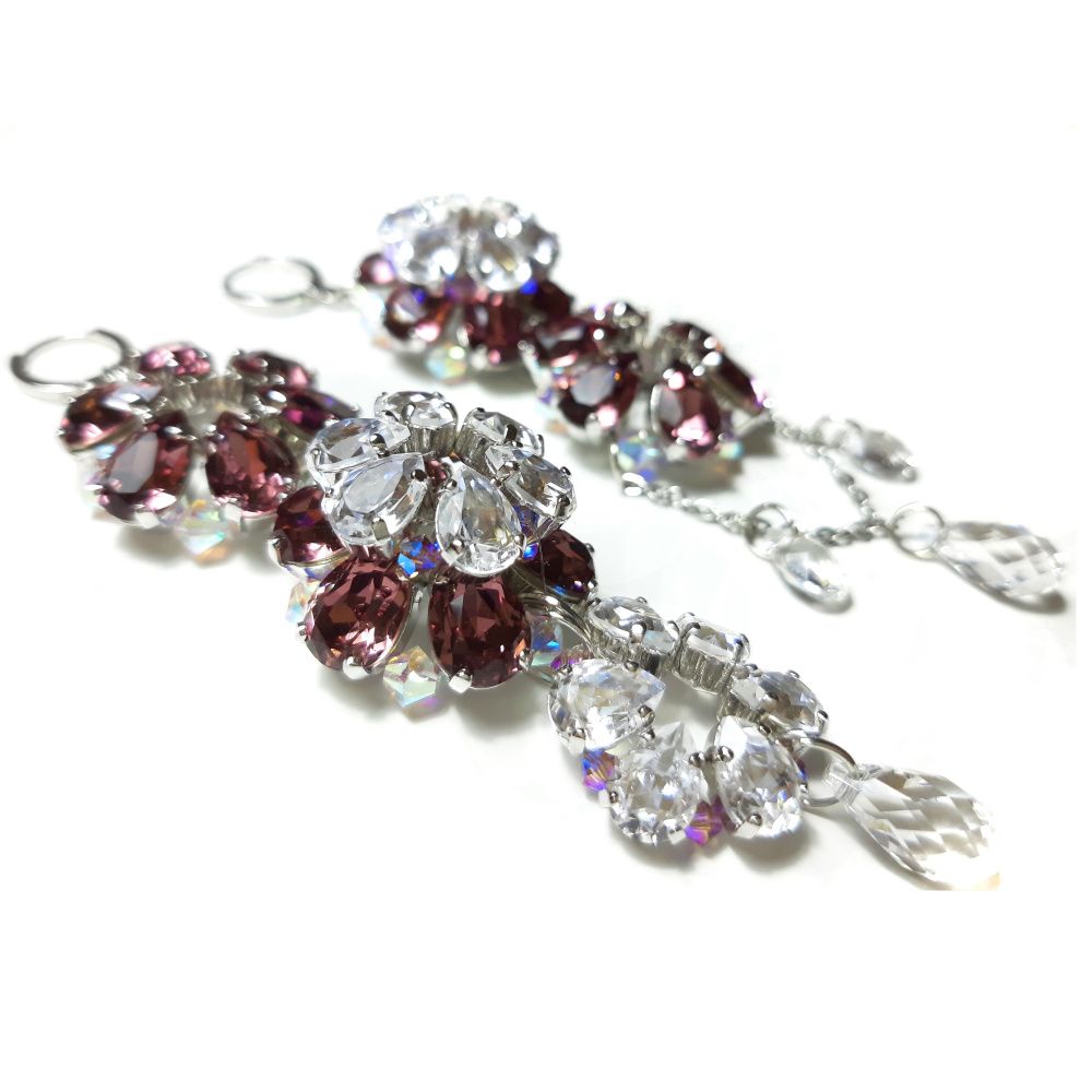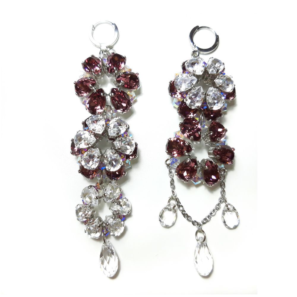 Сияющие ассиметричные серьги олицетворяют новую современную девушку блистающую в любой ситуации. На выпускном вечере или просто в кафе - она точно не останется незамеченной. На принцессе может быть кружевное платье или кожаная косуха, но надевая эти серьги она будет уверена - настало время сиять. Основная задача это тренда показать хрустальные кружева в различных вариациях, дополненные мелкими металлическими деталями. Это новая готическая романтика, которая появляется на улицах наших городов. Завораживающий цвет iris в форме капли выступает здесь основным кристаллом, а белые кристаллы с эффектом ignite, которые использованы в многослойной композиции подчеркивают магическую красоту iris и пропускают его свет и оттенок. Биконусы с эффектом AB 2x дополняют здесь остальные кристаллы и зажигают их словно маленькие огоньки.