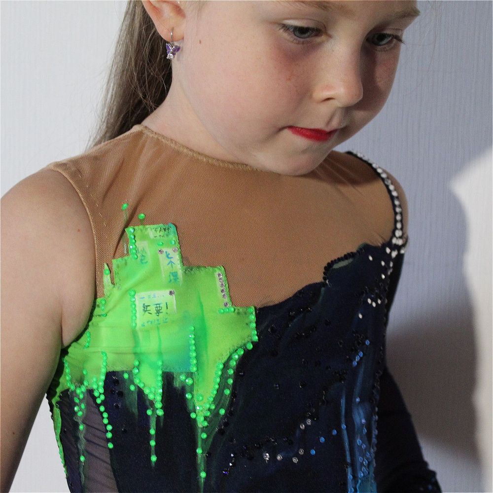 Вдохновленный кинокартиной «Бегущий по лезвию 2049» костюм стремится передать чарующее и футуристическое сияние ночного города, его ярких рекламных экранов и подсветки. Все слоганы на купальнике написаны на китайском языке. Для передачи буйства цвета неспящего мегаполиса использовались стразы линейки electric в цветах blue и green.