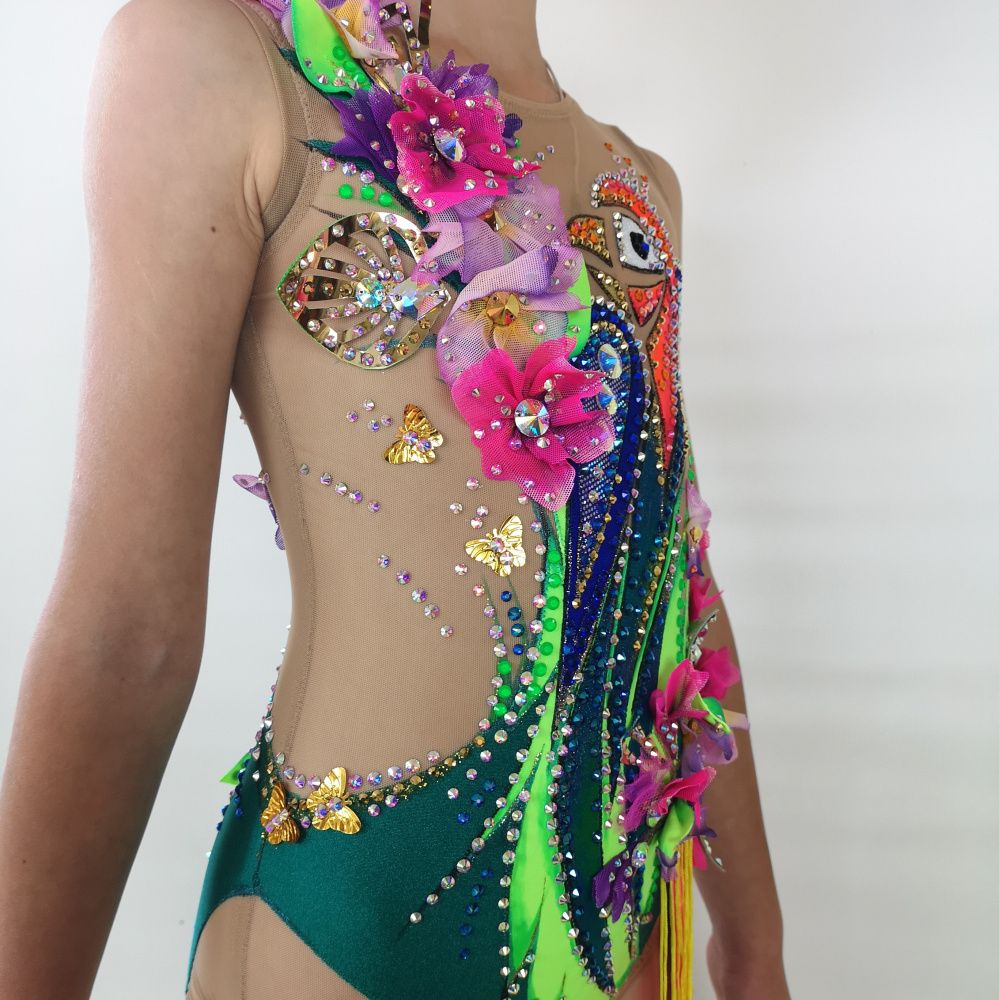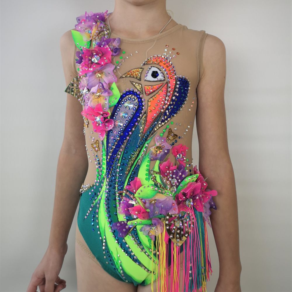 Волшебная птица на купальнике распадается на множество кусочков. Её изображение дробится, как отражение в граненом зеркале. При этом строгие геометрические формы с одной стороны смягчаются растительным декором, а с другой - подчёркиваются сверкающими всеми гранями кристаллами. И в свете софитов купальник засверкает по-новому!