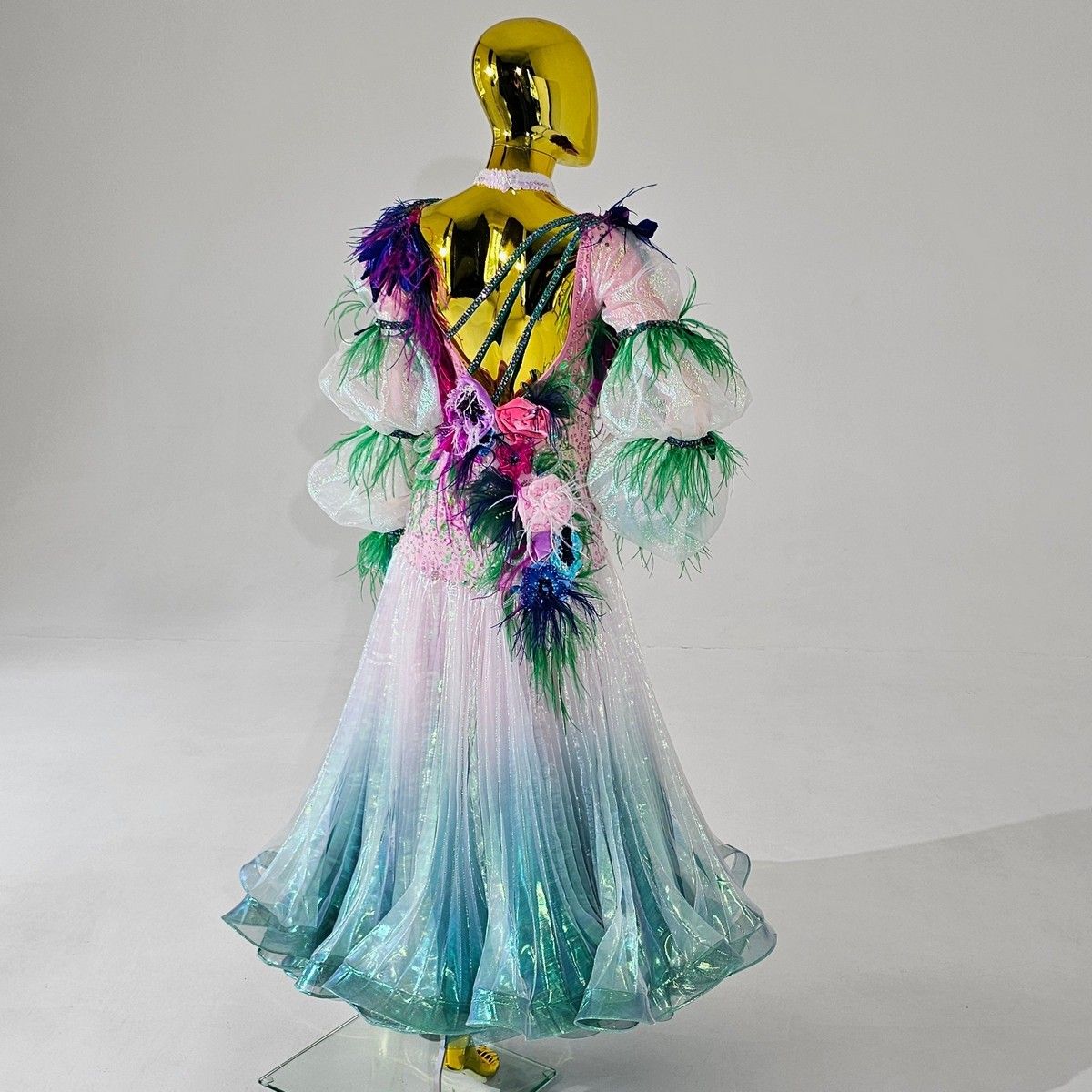 Создавая платье Лесной Девы, я старалась использовать необычные материалы с неземным отливом и свечением – градиенты, органзу. Рукава скроены в виде буфов из роз, а трава выполнена из страусиных перьев, собранных в пучки. Стразы с неоновым эффектом усилили «эльфийское» свечение наряда.