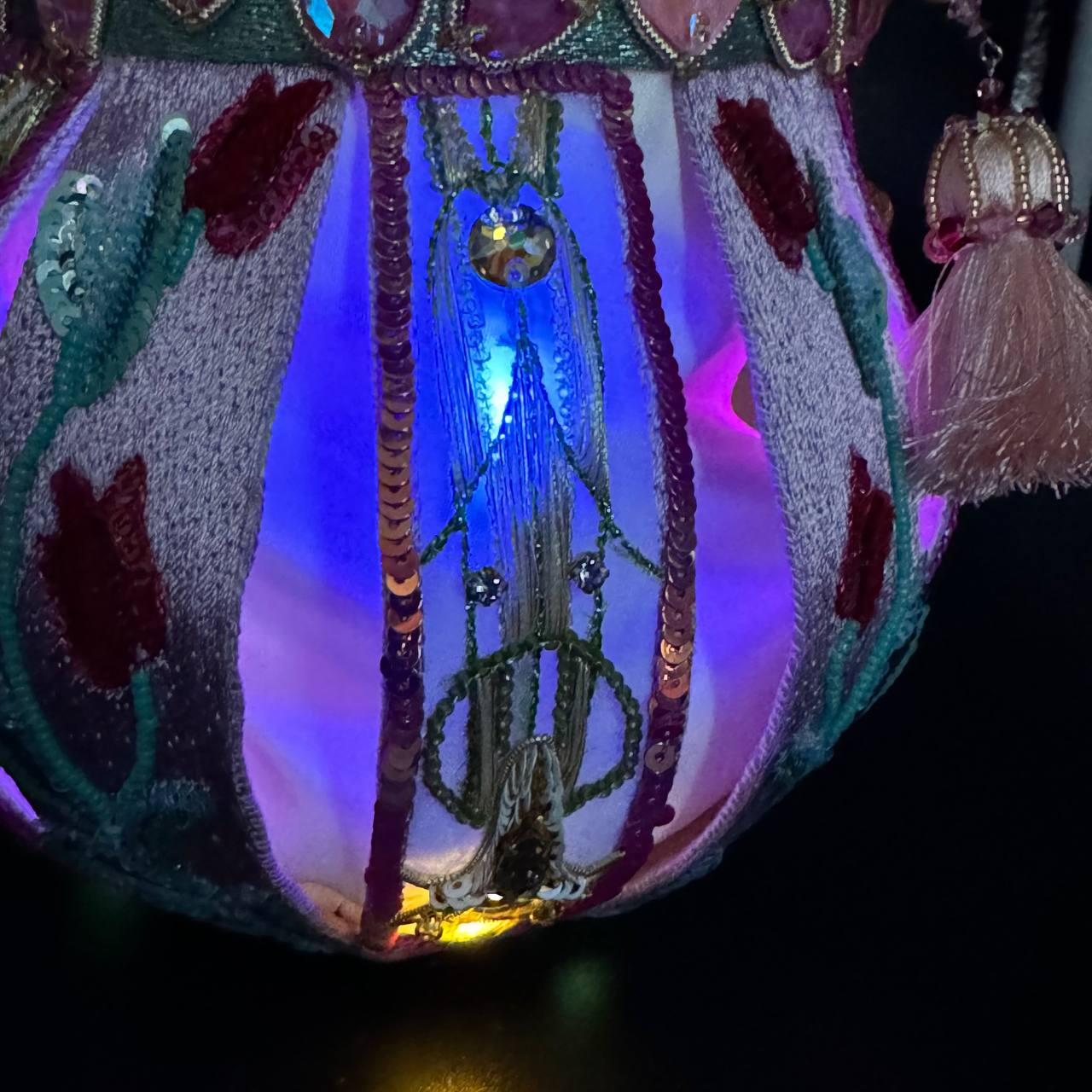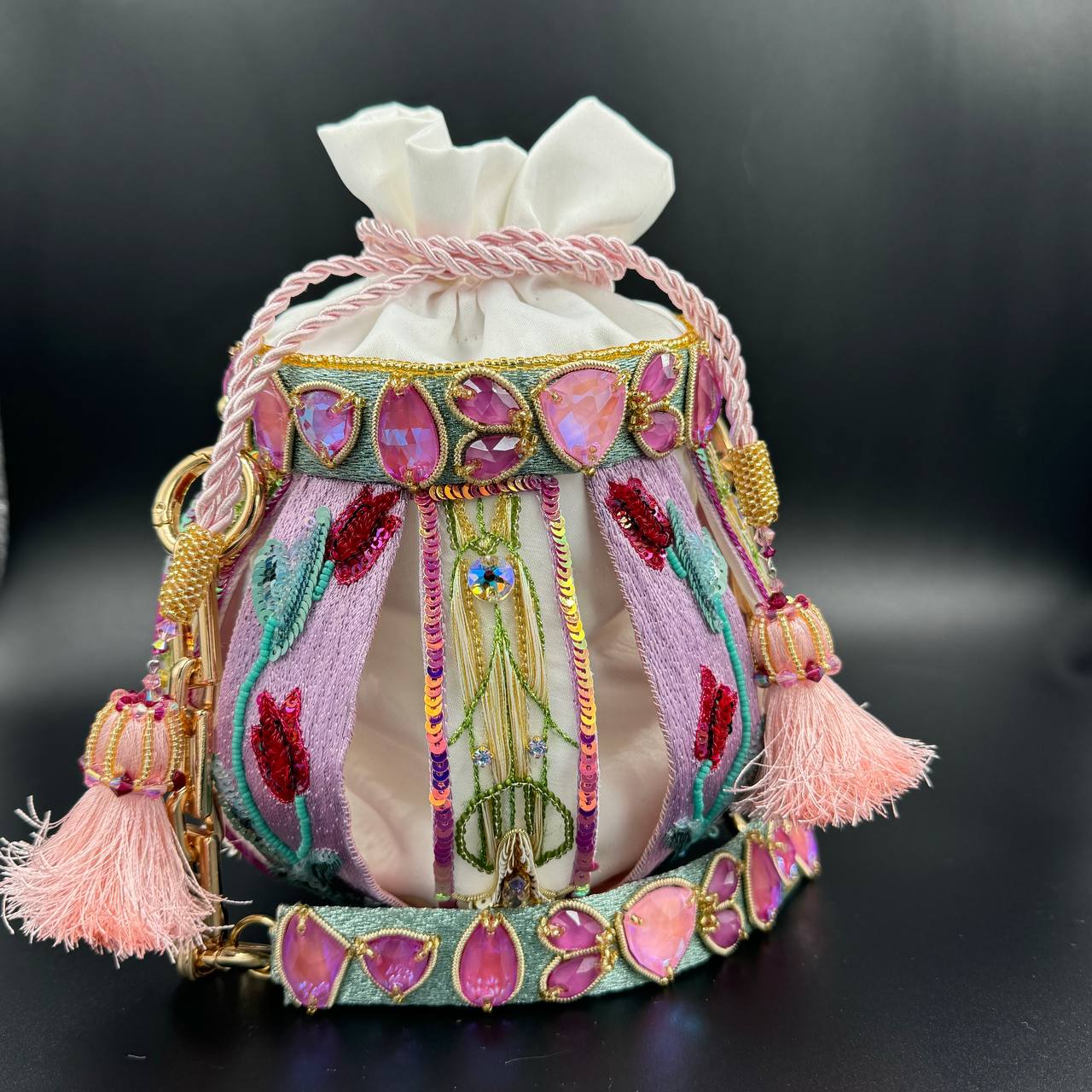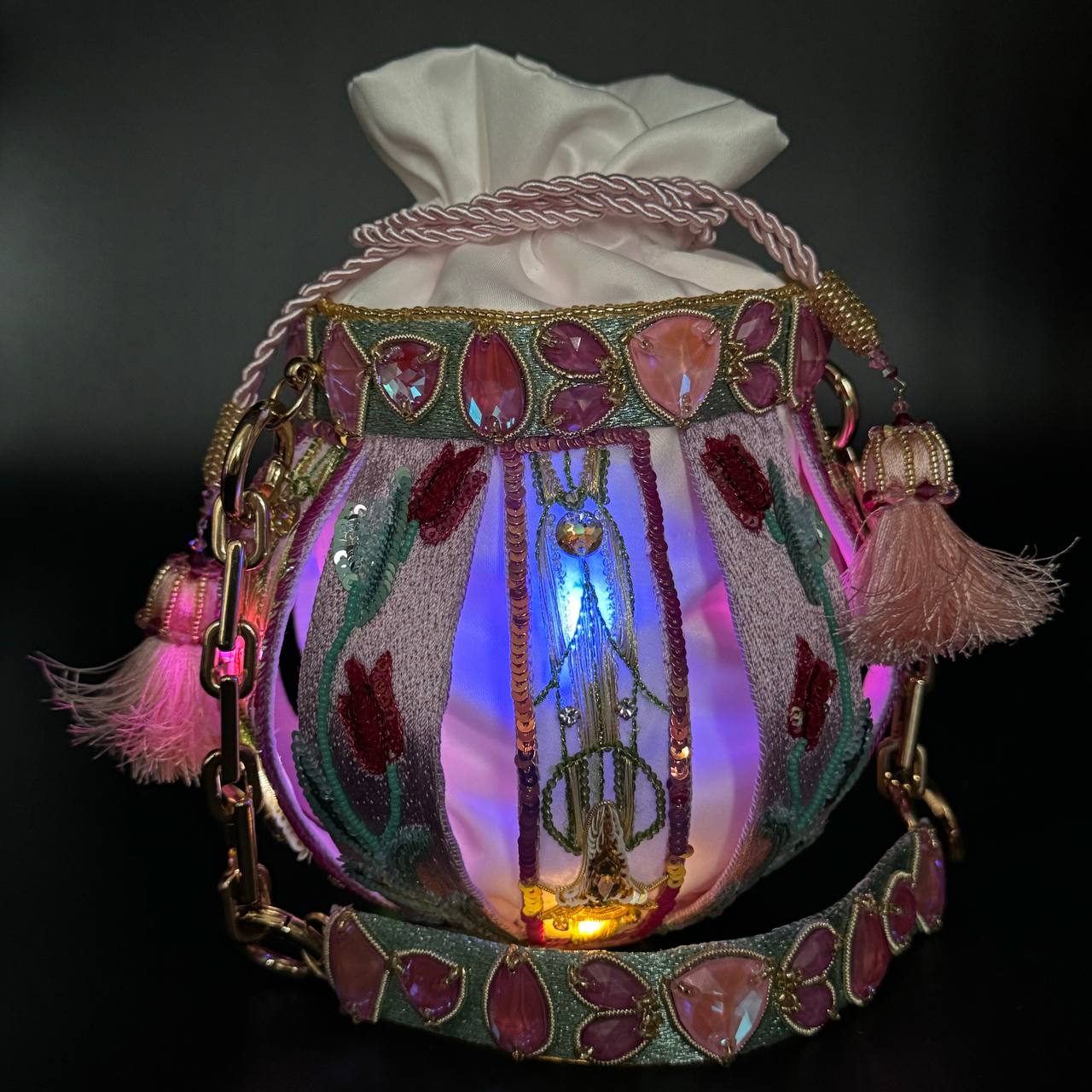 Когда-то феи подарили людям волшебный предмет. Они украсили его кристаллами, бисером, нитками и пайетками. Рисунки напоминали витражи с цветами и весенние цветущие поля. Вдохновленные волшебными растениями, феи вложили в него частичку своей магии, чтобы каждый, кто прикоснётся к этому аксессуару, ощутил силу природы. Сверкающие кристаллы переливаются, словно утренняя роса на лепестках, а узоры из пайеток напоминают о крыльях фей, мягко скользящих среди цветов. Каждая золотистая нить — это след их лёгких, невесомых шагов.