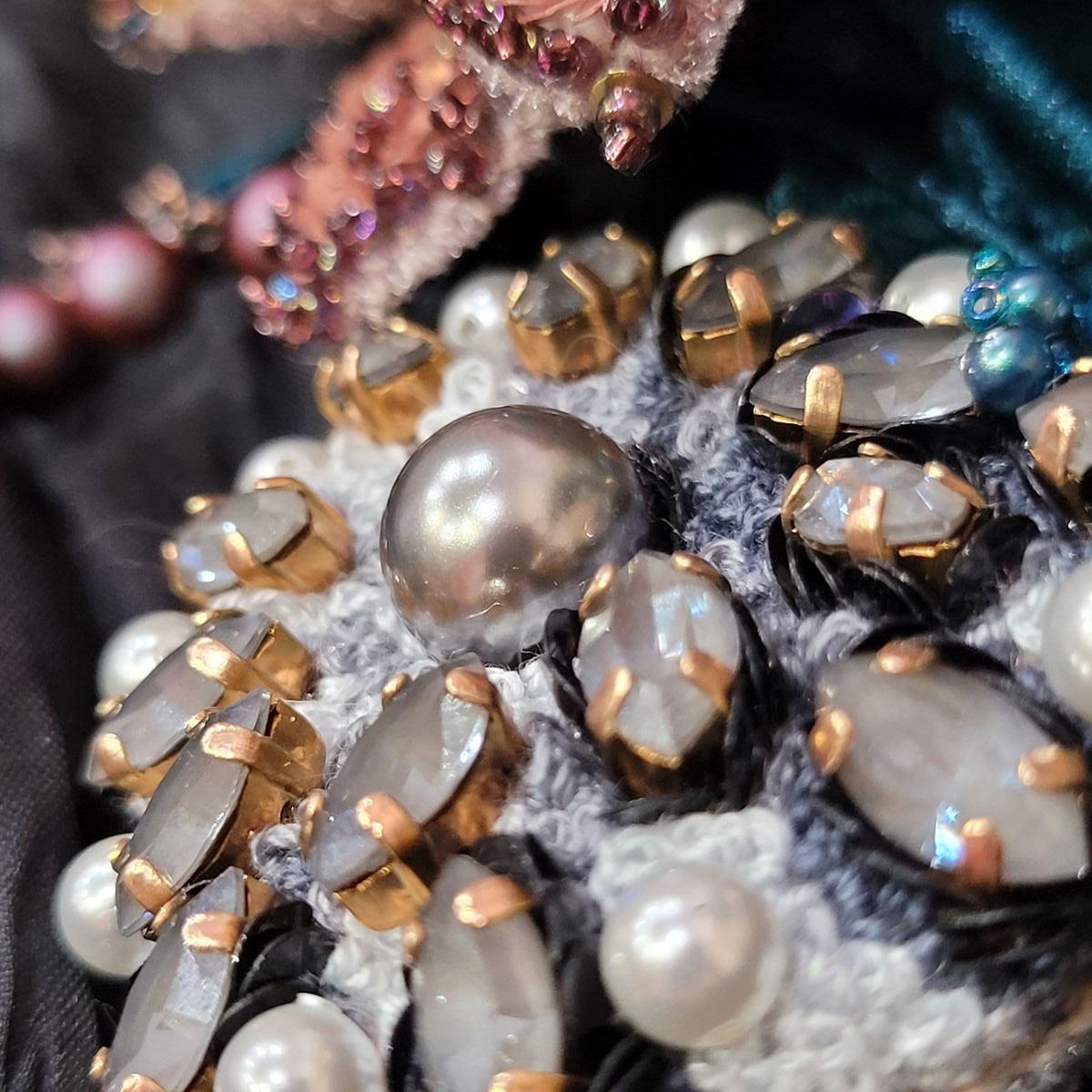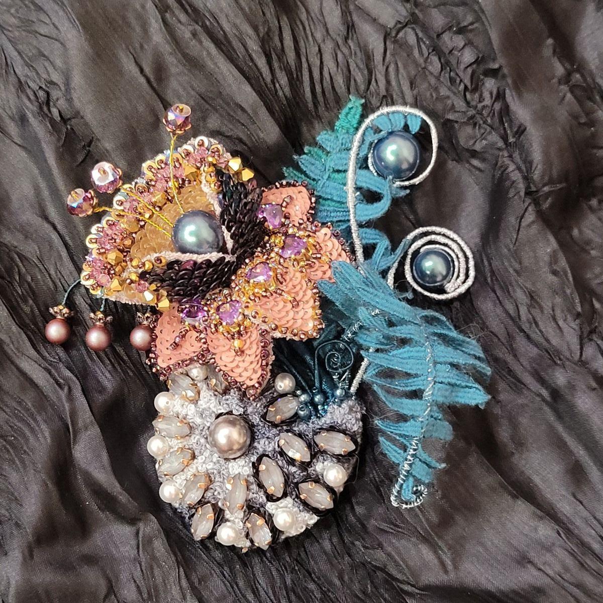 Брошь ярко и образно передает атмосферу тайн и чудес, скрывающихся в недрах дикой природы. Выбранная цветовая гамма - холодные зелёные, бирюзовые оттенки и приглушённый аметистовый - создаёт эффект погружения в параллельную реальность, где привычные формы и образы трансформируются, открывая свои потаённые грани.