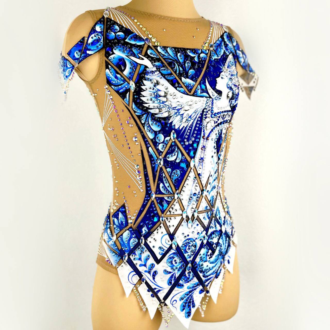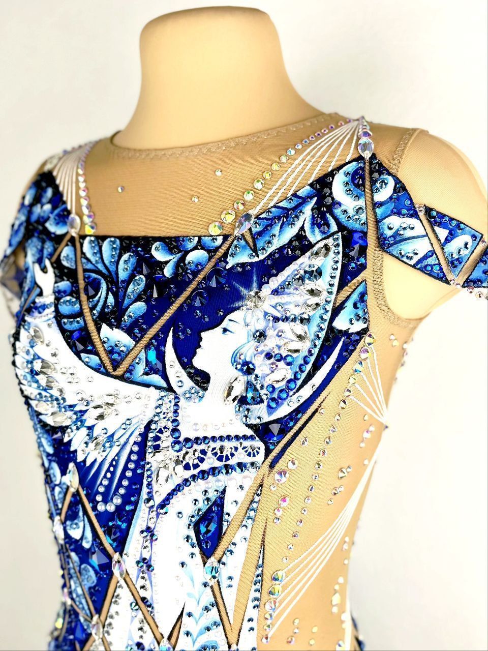 фарфоровая посуда в серванте, искусно расписанная гжелью, белые льняные нити,