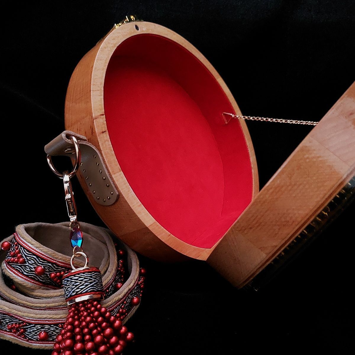 Плечевой ремень выполнен в старинной русской технике поясного ткачества на дощечках. Данный способ я осваивала специально для этой работы, придумав, как вплетать бусины в процессе ткачества.