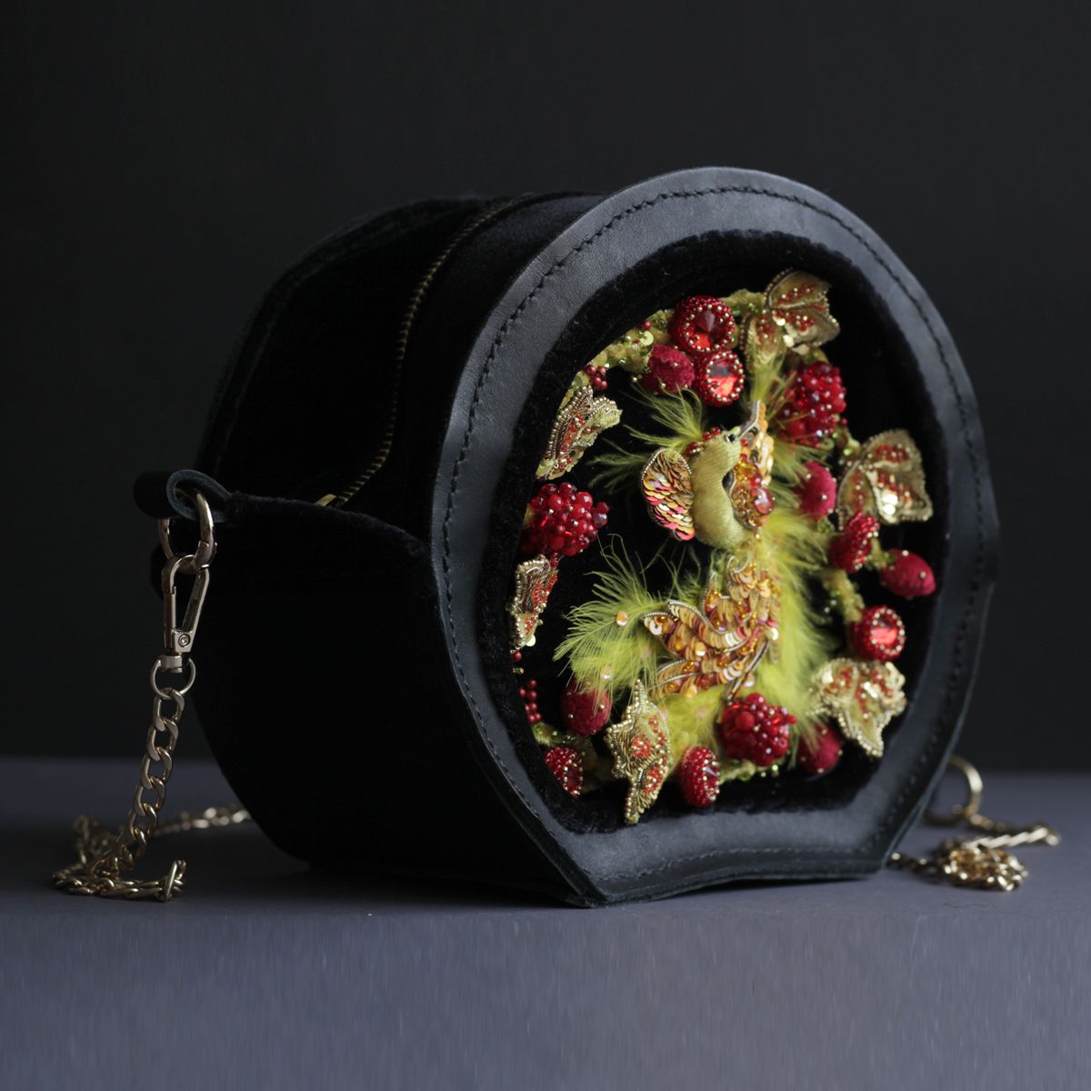 Она на столько прекрасна, разнообразна и интересна, что вдохновила меня на создание сумочки. Я решила не просто повторить плоскую роспись, а придать ей объем, фактурность. На чёрном фоне распустились золотые листья, яркие гроздья ягод. А в центре композиции разместилась жар-птица. Эта птица как символ истинного огня, который исходит изнутри. Символ силы и мощи. Вся солнечная энергия воплощена в этой птице. Она просто обязана сиять и пылать, что я и передала в сумочке с помощью цвета, фактуры. И конечно, же она по-настоящему светится. Сама сумочка сшита полностью вручную из натуральной кожи и бархата.