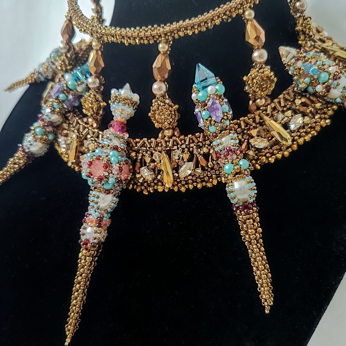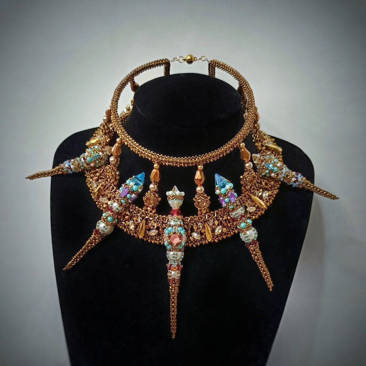 Моя работа посвящена старинному традиционному способу рукоделия-прядению, круглая форма колье со стойками, соединяющими большой круг и малый, символизируют колесо прялки, на котором закреплены разноцветные веретëна. При создании этого колье, я вдохновилась старинными веретенами, найденными в деревне при разборе дома, принадлежащего многие года нашей семье. Разноцветные, красивые, резные, длинные и короткие, на некоторых ещё была сохранена намотанная шерстяная нить. Когда берёшь в руки эти предметы старины, сразу представляешь как твои прабабушки сидели у окна, пряли, пели песни, отдыхая от тяжёлого деревенского быта.