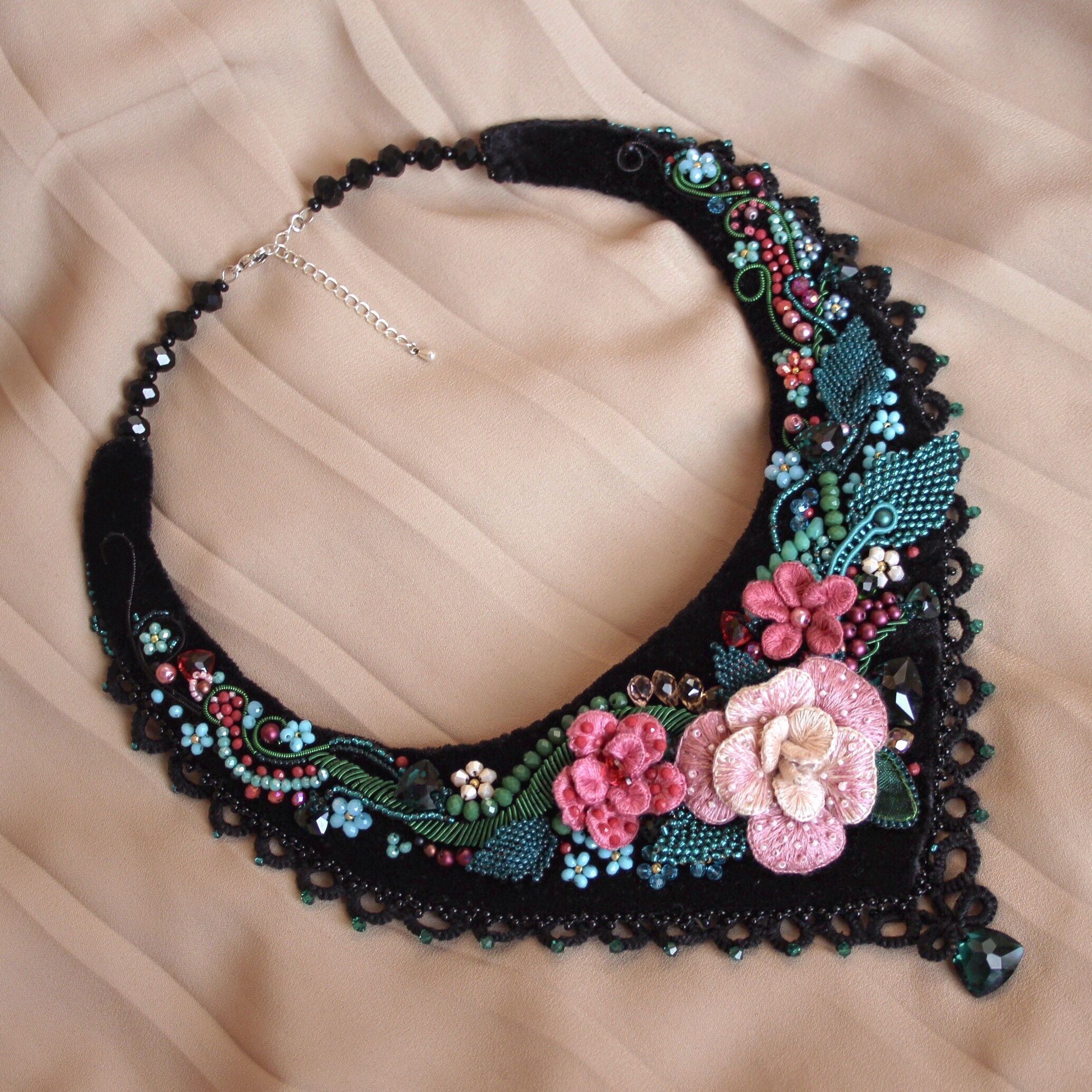 Вдохновением для создания данного колье послужила Жостовская роспись – один из традиционных видов русско-народной росписи. Жостовской росписью обычно украшались металлические подносы. Изделия обрели популярность на весь мир.