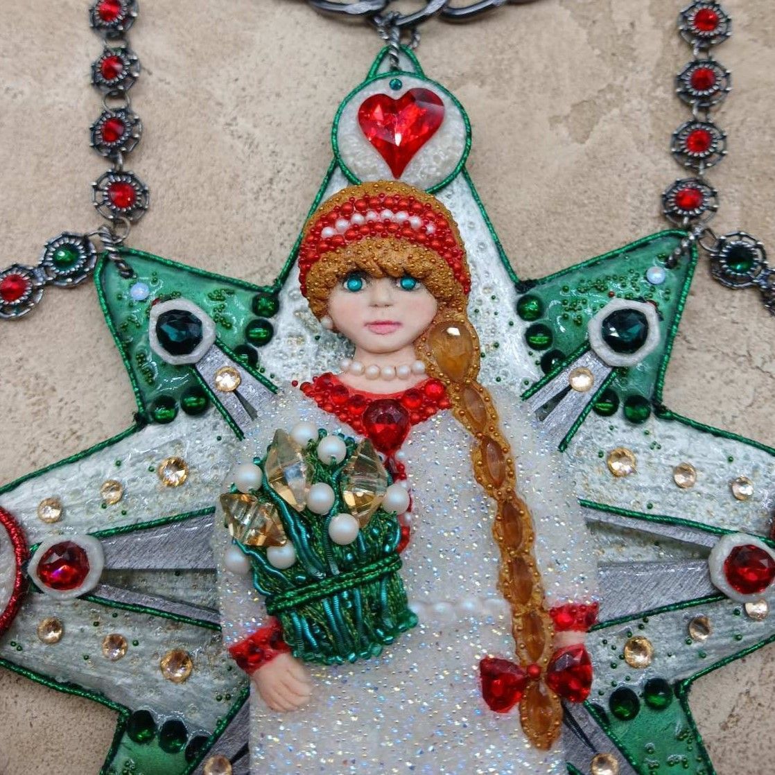 Для участия в конкурсе я создала колье, представляющего собой восьмилучевую звезду – октограмму, которая символизирует гармоничную связь духовного и телесного. Центральным элементом колье является девушка в древнерусском наряде, олицетворяющая почитание традиций и наследия предков. Сзади девушки находятся стрелки компаса, который указывает на возможные варианты будущего: элемент с красным сердцем указывает на безусловную Любовь, элемент со знаком бесконечности – на вечность бытия, элемент с бегущим гепардом – указывает на жизнь в гармонии с природой, ну и последний элемент, располагающийся внизу – представляет собой схематичные буквы AI, обозначающие искусственный интеллект. Любой из данных вариантов будущего возможен, все зависит только от выбора человека здесь и сейчас. В наших силах создать прекрасное будущее, нужно только верить в себя и открыть Любви свое сердце.