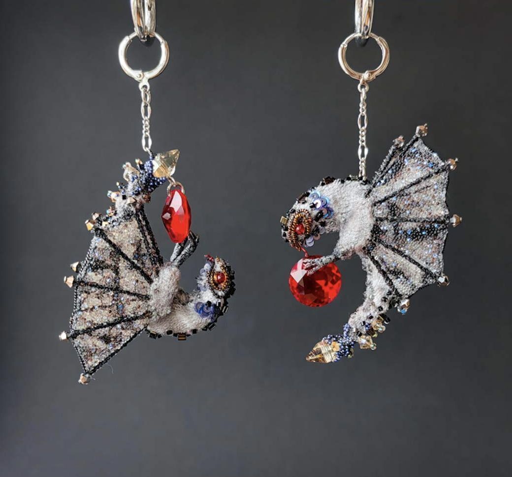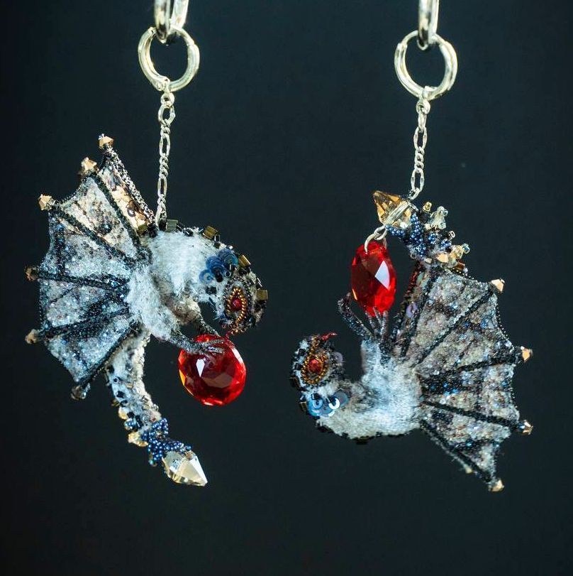 Драконы выполнены из бархата, на прочном каркасе.Расшиты бисером, кристаллами, пайетками и канителью. Крылья выполнены из органзы. С внутренней стороны расшиты пайетками и металлизированными нитями. С лицевой стороны украшены кристальной тканью Сваровски.
