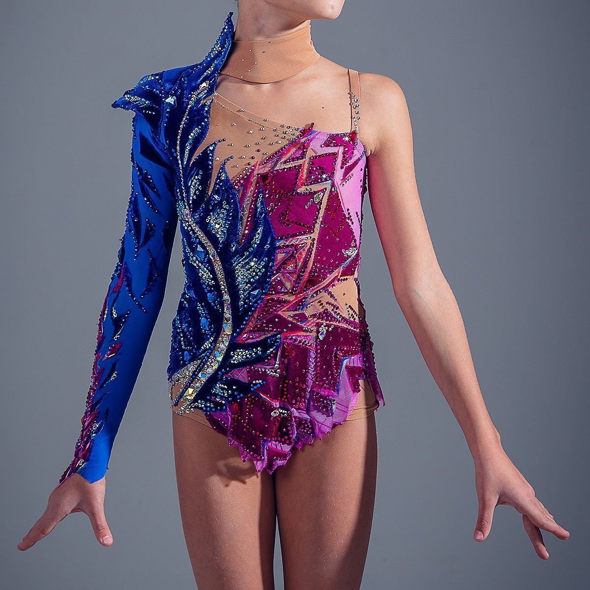 Источником вдохновения для создания данной изделия послужило переплетение образов райской птицы «Сирин», и образа древнего хрустального стеклодувного промысла- стеклоделия. В хрупкости и нестабильности нашего времени, даже при невесомом касании пера может разбиться душа на множество осколков. Но в непредугаданном будущем, через калейдоскоп «острого кружева» родится новая, светлая, чистая душа. Цветовое сочетание изделия выполнено исходя из исконных оттенков образа птицы «Сирин»-(синего и бордового), с учетом модных тенденций в цвете. А также, были учтены такие критерии, как: образ спортсмена, возраст и актуальность атмосфере зала для соревнований.