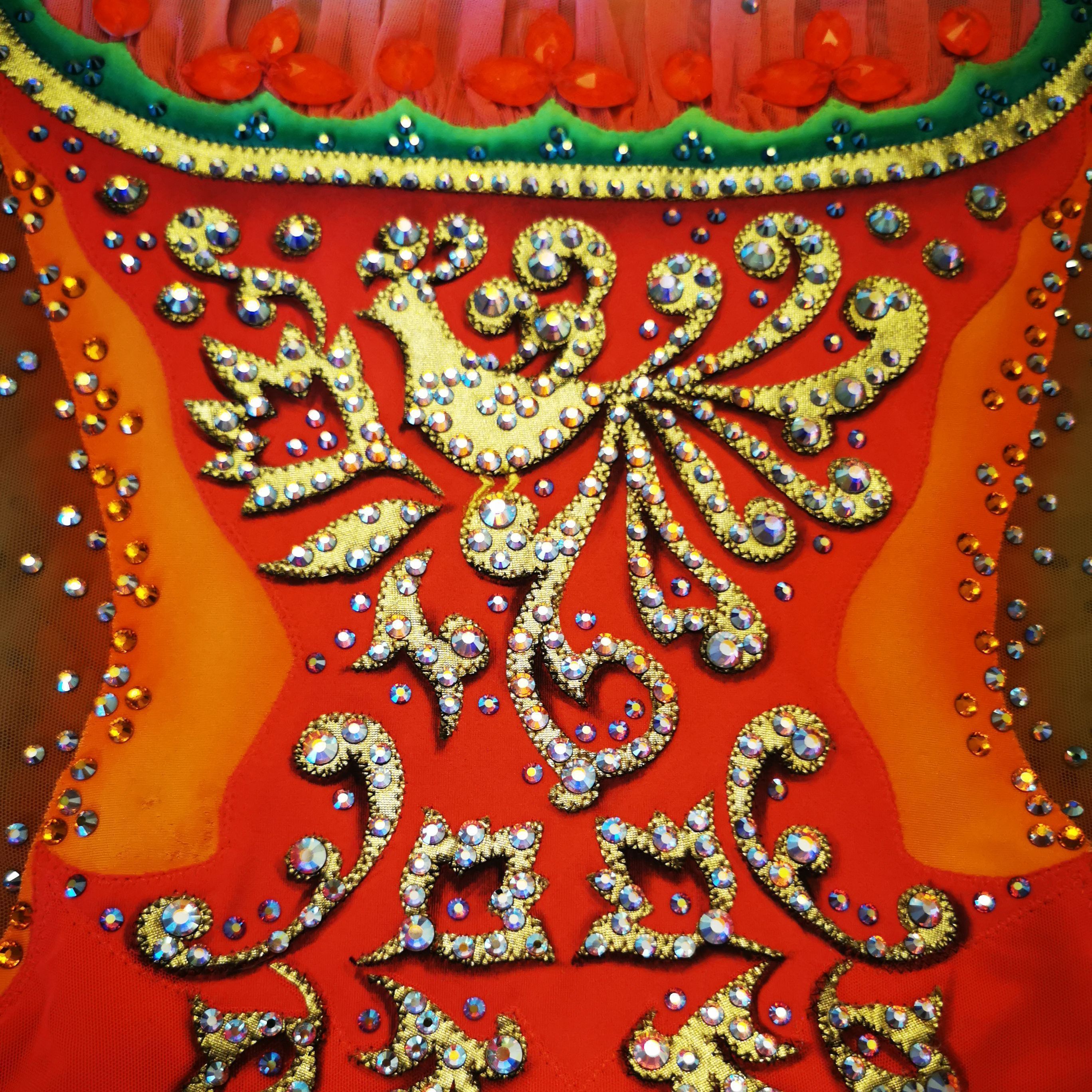 Соблюдена цветовая палитра, характерная для хохломской росписи: контраст золотого, алого и неонового, помогли достичь желаемого результата. Купальник получился ярким, выразительным и абсолютно соответствует поставленной программе.