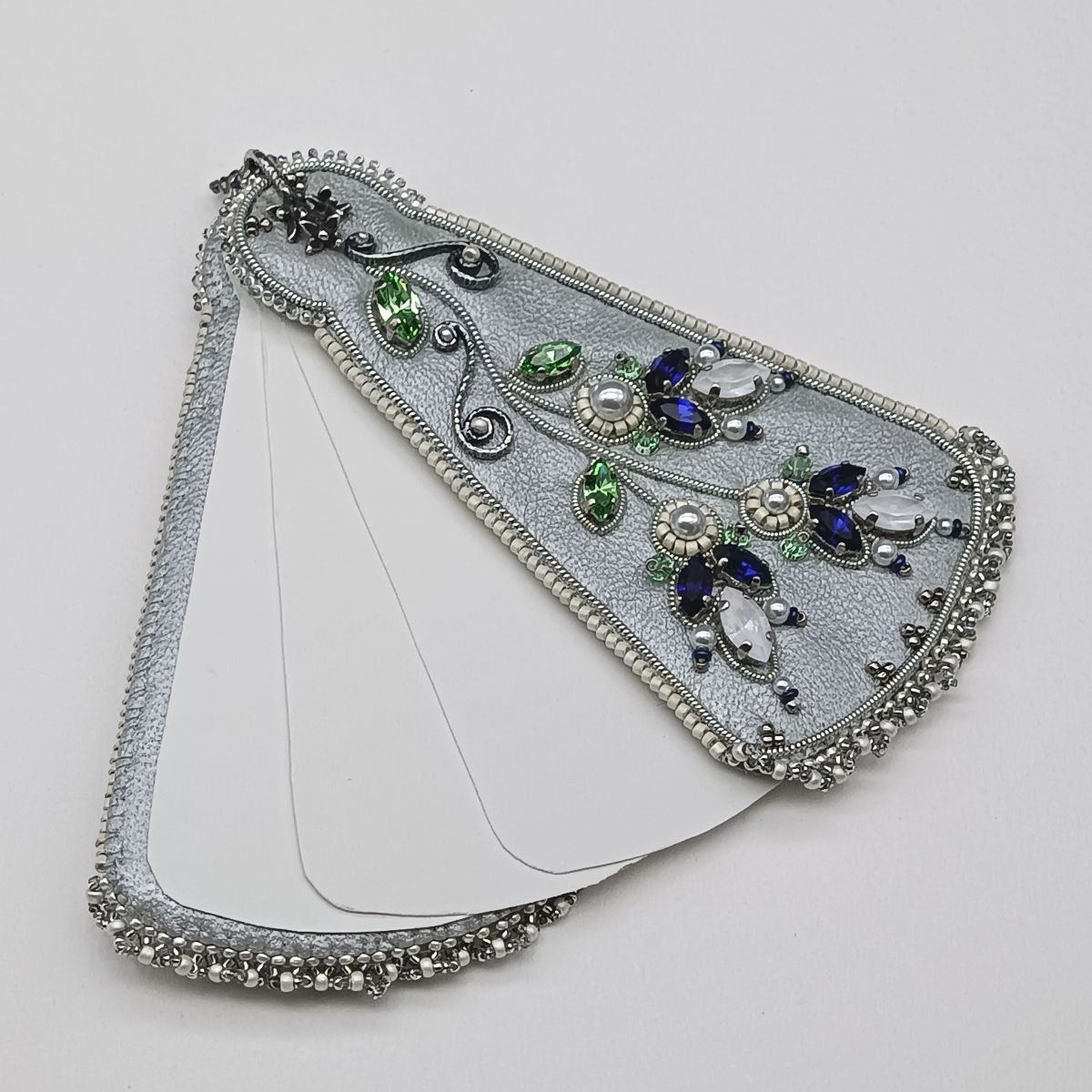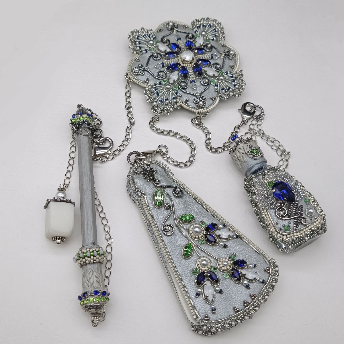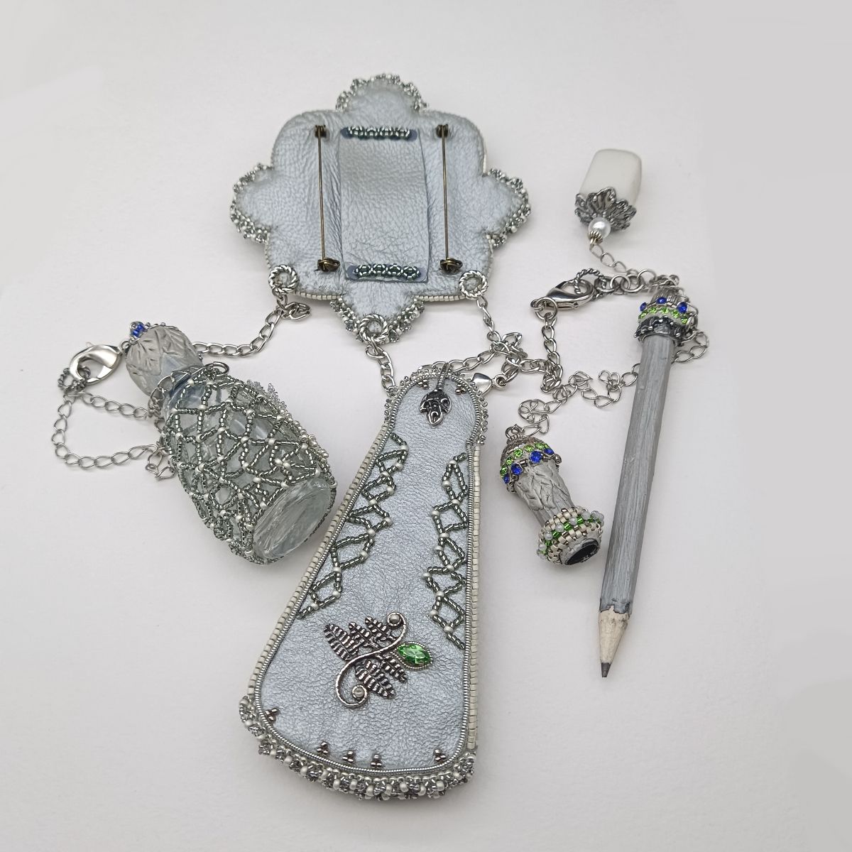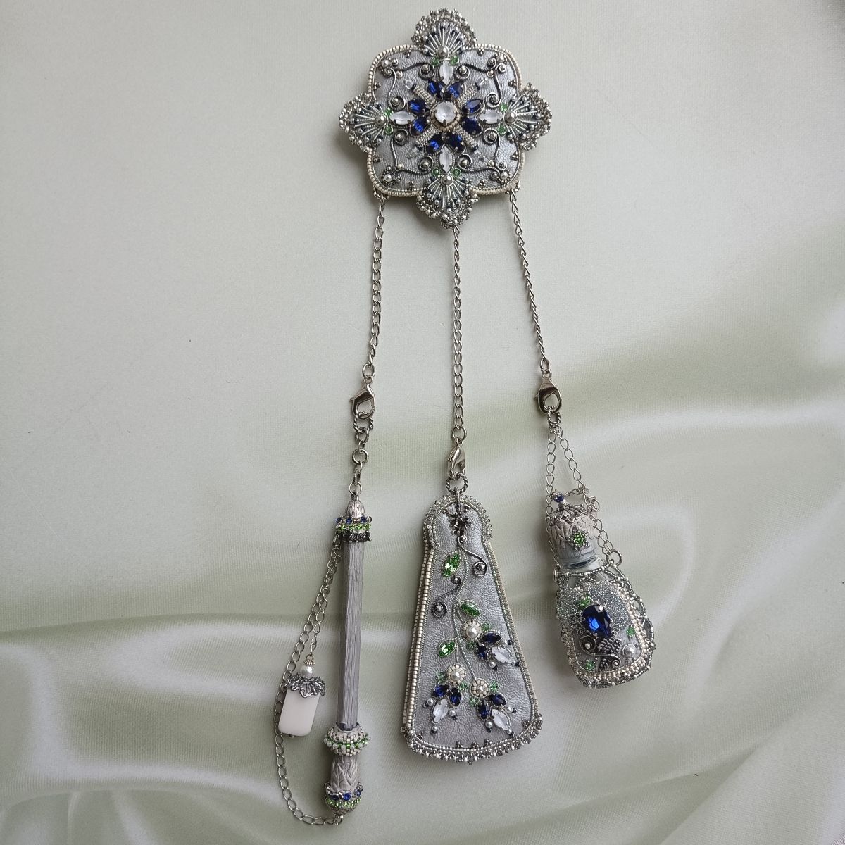 В данном украшении подвешены бальная книжечка, карандашик с ластиком и флакончик для духов.