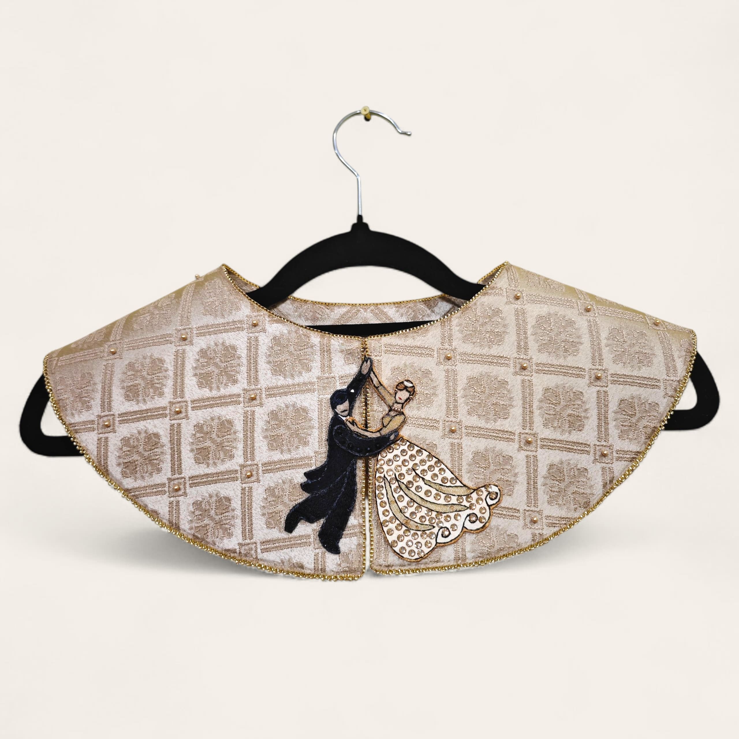 На фоне, напоминающем узор паркета, застыли в изящном движении кавалер и дебютантка. Она парит в его руках, а он бережно ведёт её сквозь время. Паркет под ногами мерцает, словно сохраняя следы всех, кто когда-то танцевал здесь вальс.