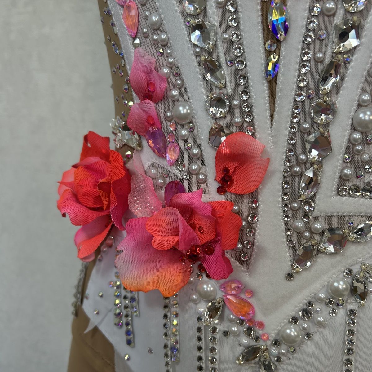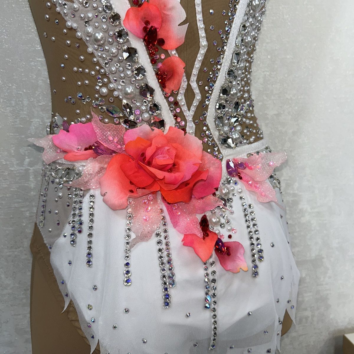 Цветы на плече и бёдрах подчёркивают линии тела. Образ завершают жемчуг, кристаллы нежных розовых и алых оттенков и подвески из страз передающие атмосферу «Венского бала».