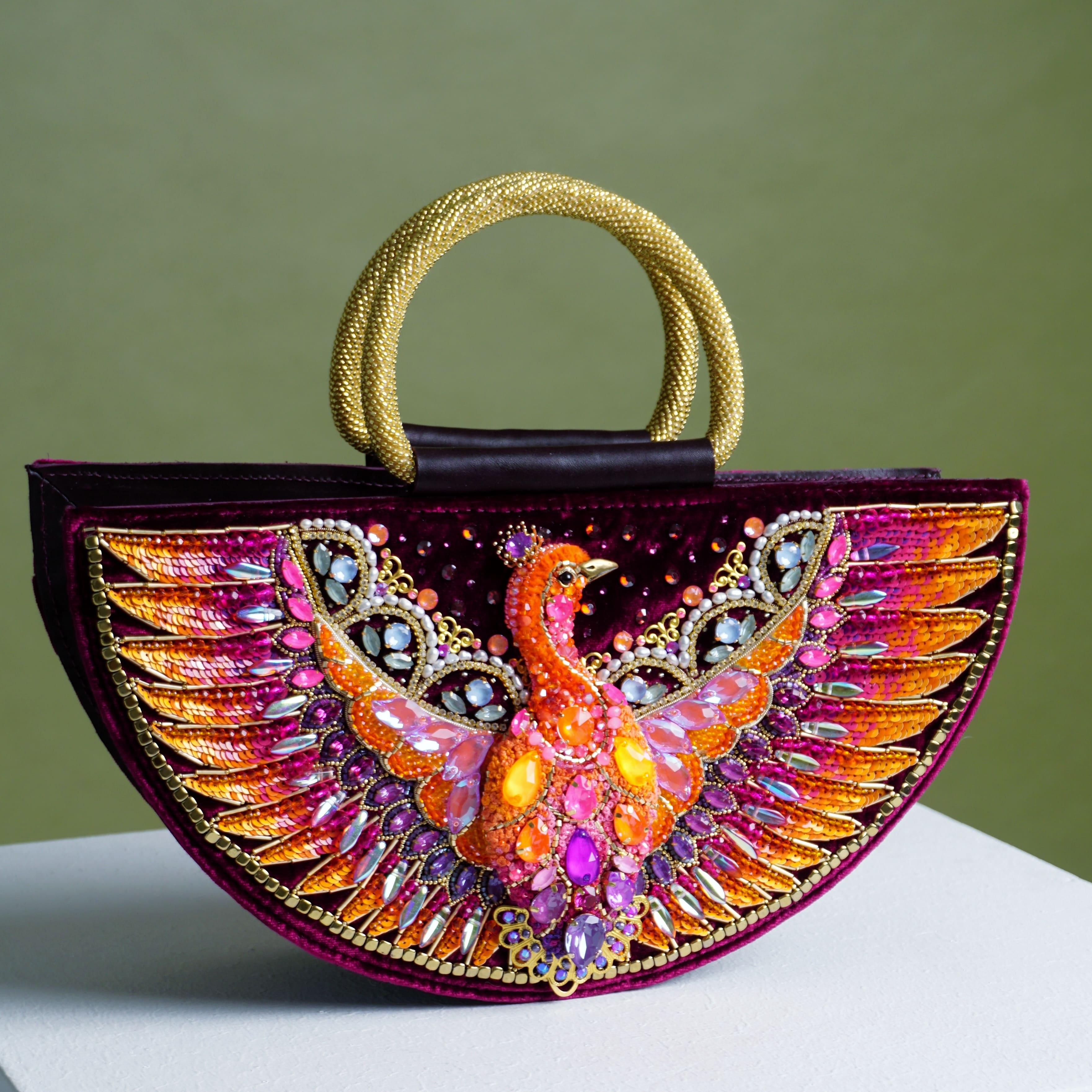 Сумка «Веер перемен» создана на каркасной основе в стилизованной форме веера, но в современном стиле. Ручки сумки обвязаны жгутами из золотого бисера, что несет в себе не только практичное применение, но и также декоративный характер-стилизацию солнца, к которому тянется птица. Также у сумки есть дополнительные снимающиеся аксессуары: длинная ручка-трансформер, состоящая из латунной цепочки, жемчуга и бусин, а также обвес, который также является продолжением хвоста птицы.