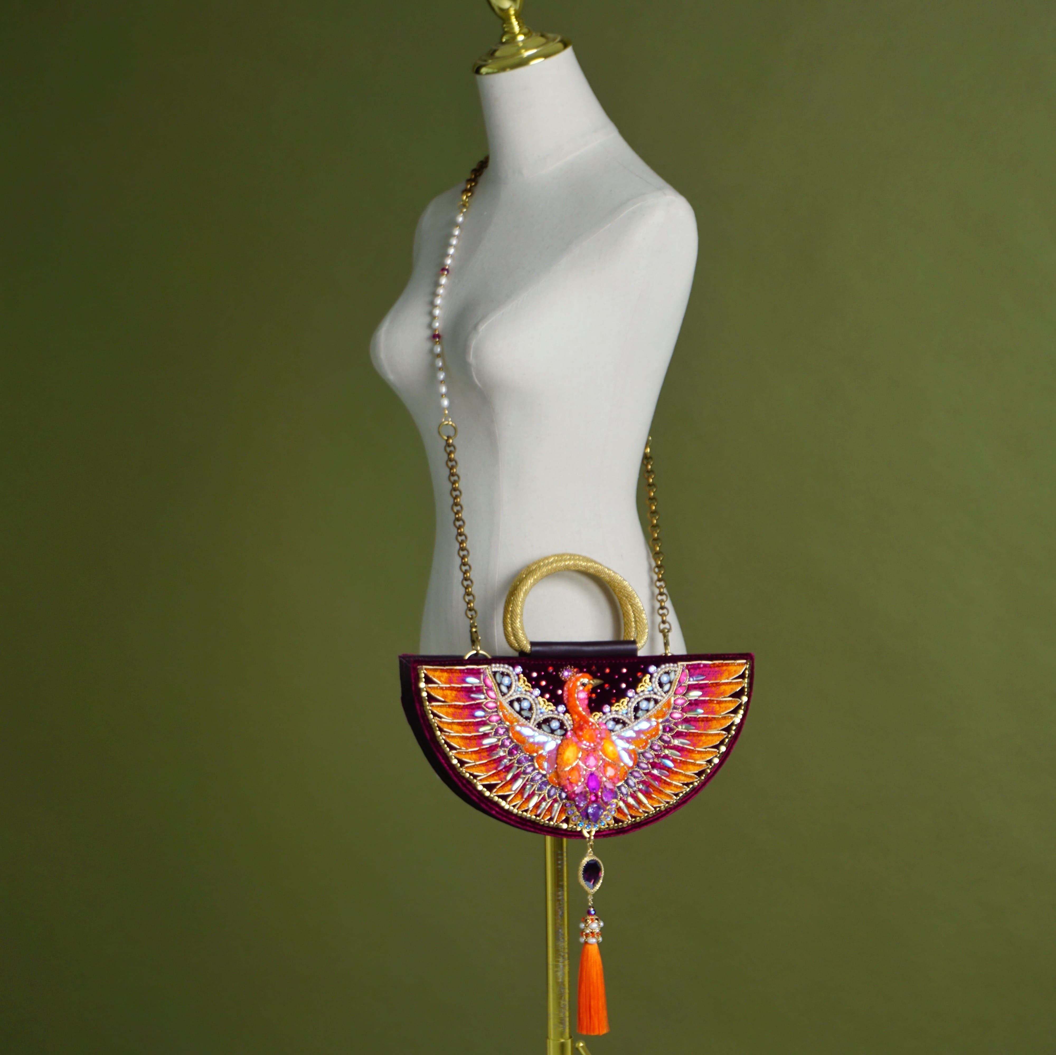 За основу идеи сумки я взяла последний период расцвет веера - «ар-нуво». С одной стороны сумки, по мотивам этого стиля, я вышила популярный аксессуар того времени в виде кармана. На нем изображен растительный орнамент, в котором можно увидеть солнце, дерево, цветы. На другой стороне по форме сумки, изображена летящая птица с раскрытыми крыльями, - это Феникс. Символ, которого означает «возрождение». Так, в моей работе появился смысл отдать дань уважения аксессуару того времени в нынешней интерпретации каждой современной женщины.