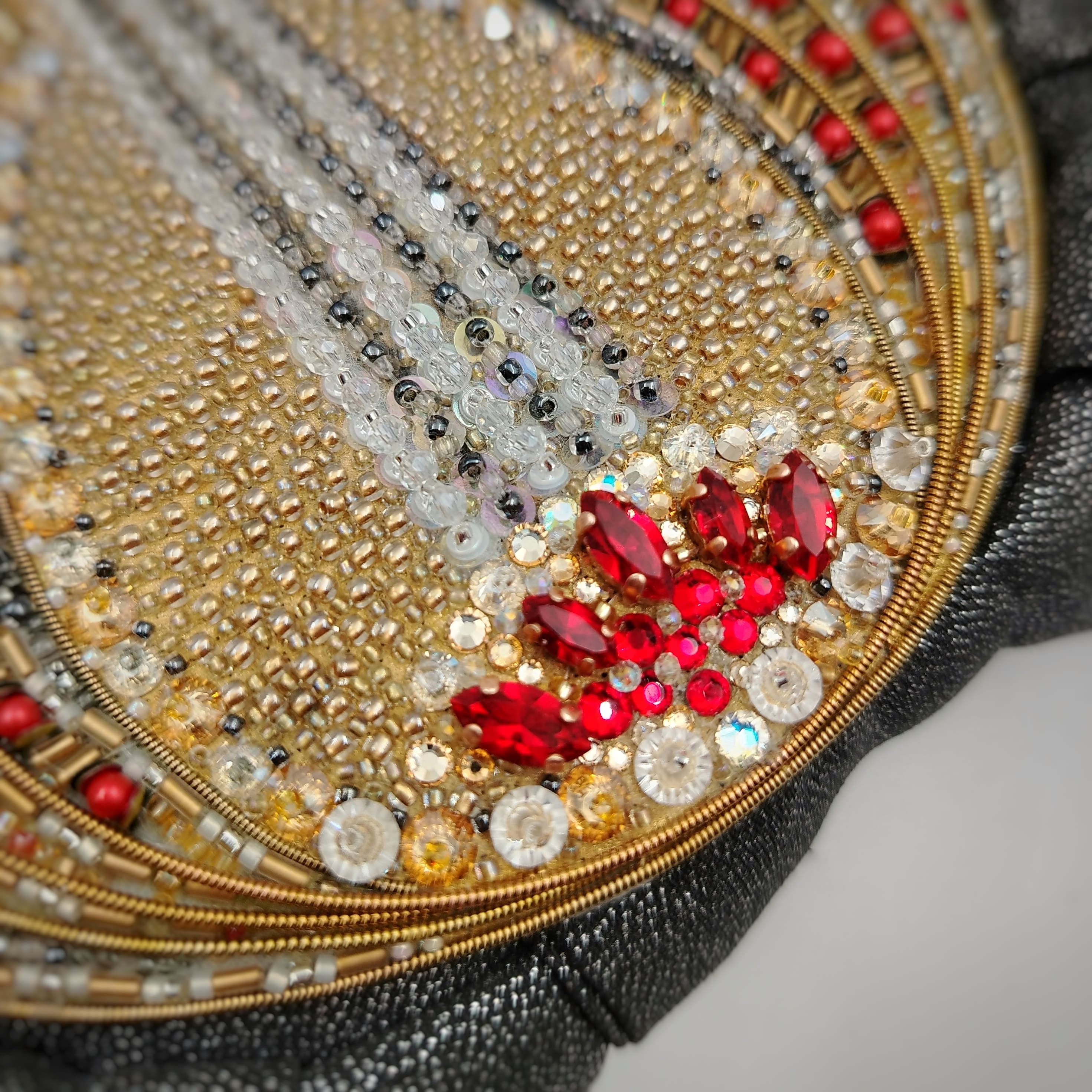 Элементы ручной вышивки имитируют колонны, люстры, букеты цветов и даже участников.