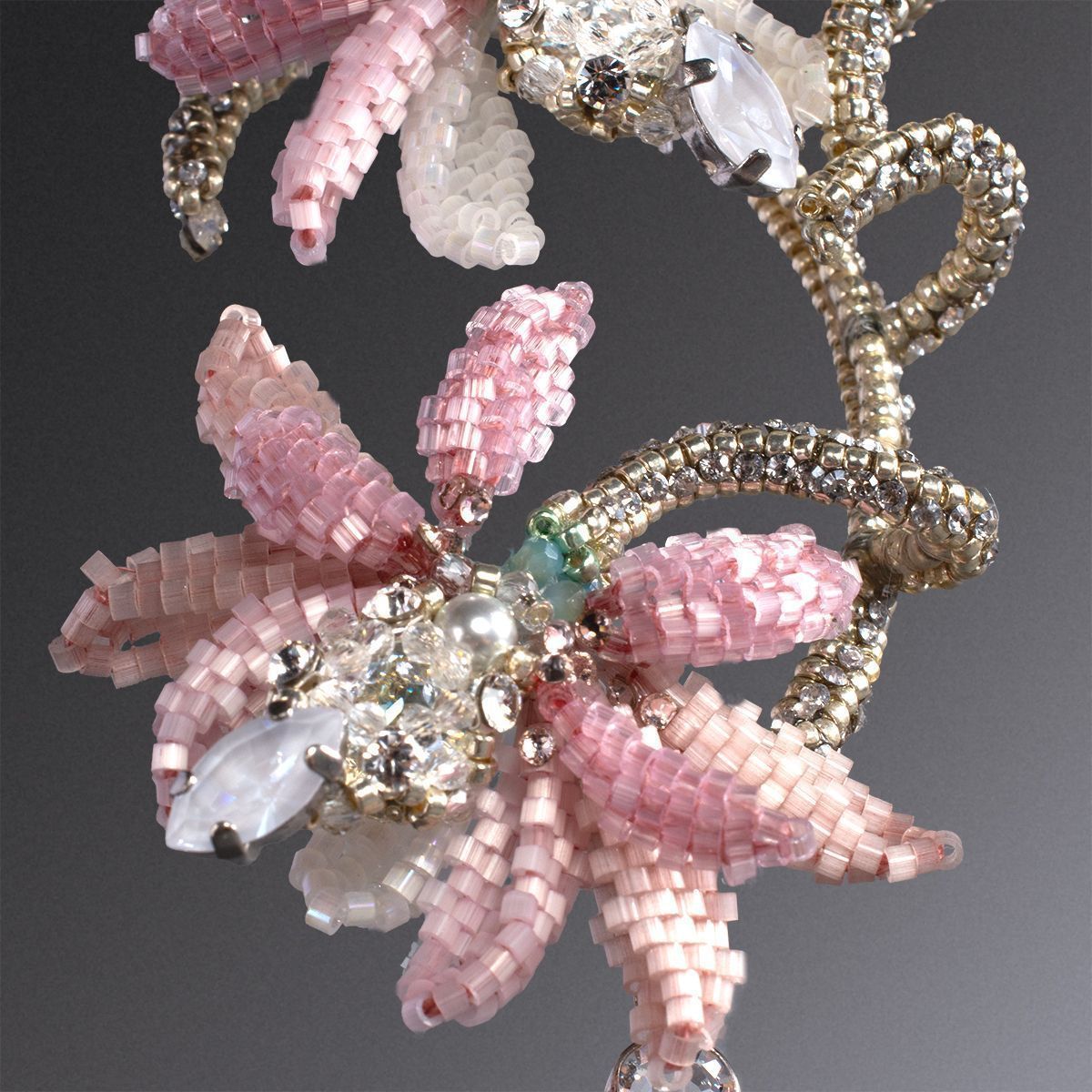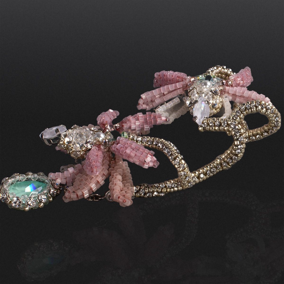 Можно ли в украшении запечатлеть мгновение вальса, пронизанное легкой грустью? Перед Вами кафф, сплетенный из серебряного бисера изящно повторяющий изгиб уха. Его обрамляют нежные лепестки, сплетенные из сатинового бисера, словно замершие в вечном танце; склонившиеся к изящному жемчужному бутону в центре — символу первой невинной симпатии. Из-под каждого соцветия Дицентры ниспадает единственная сверкающая слеза, раскрывающая символическое значение самого цветка, заключенное в сострадании и безграничной любви ко всему живому. Это симфония чувств и грации, квинтэссенция идеалов юной дебютантки. Застывшее мгновение между звуками оркестра и шуршанием шелковых юбок, воплощение самой сути Венского бала, сочетающего меланхоличную красоту цветка с бальной роскошью.