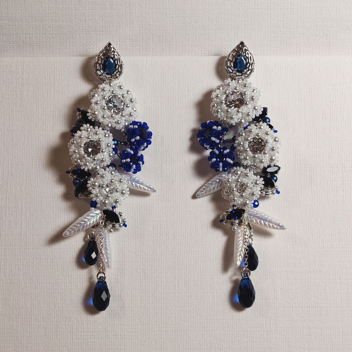 Их окружают стеклянные листья. А вниз, подобно нотным станам, струятся нити с тёмно-синими подвесками-каплями. Это не капли воды, а капли самой ночи, тяжёлые, насыщенные тайной бездонного небесного океана. С каждым шагом они мерно колышутся, словно тихая мелодия, обращённая к сердцу.