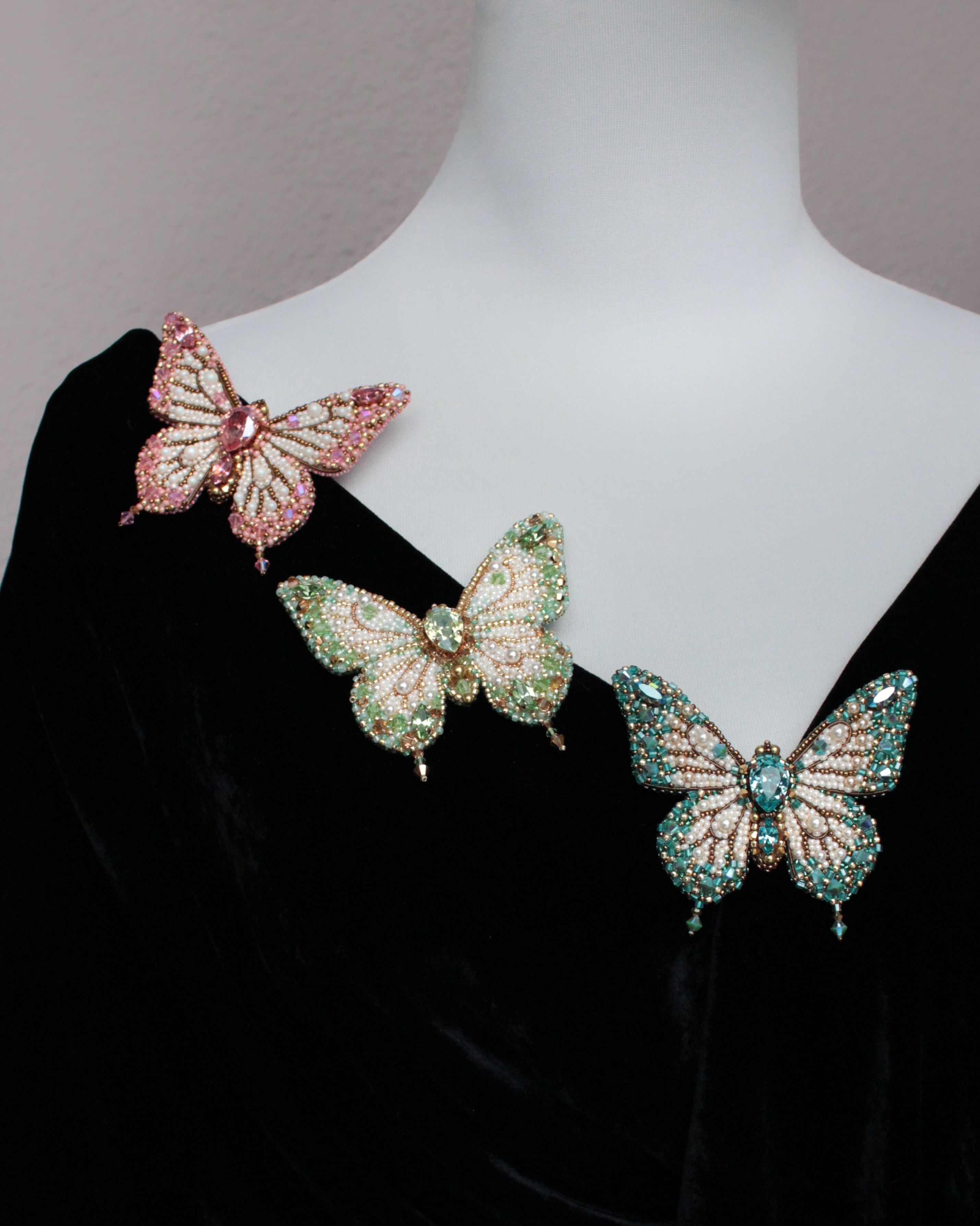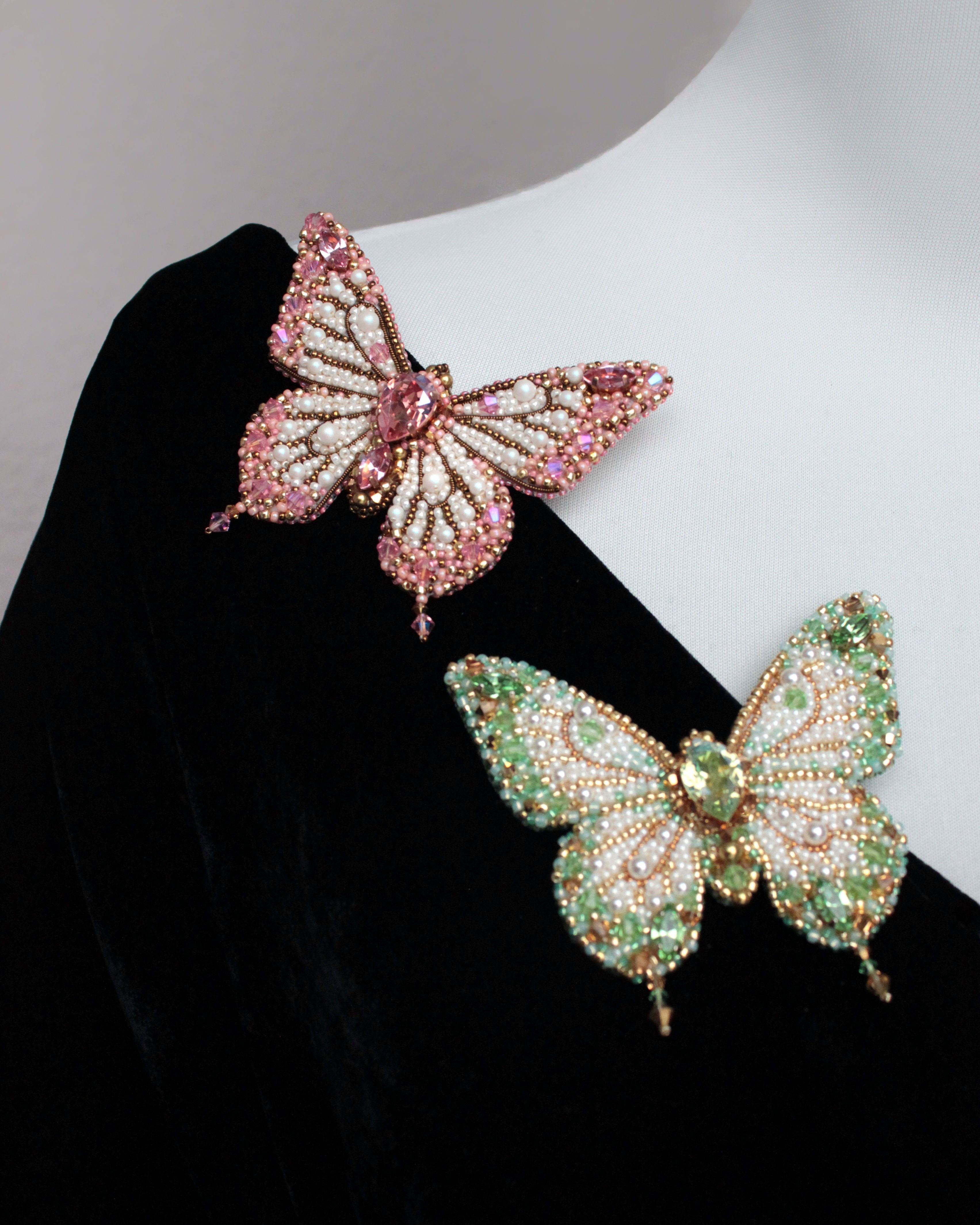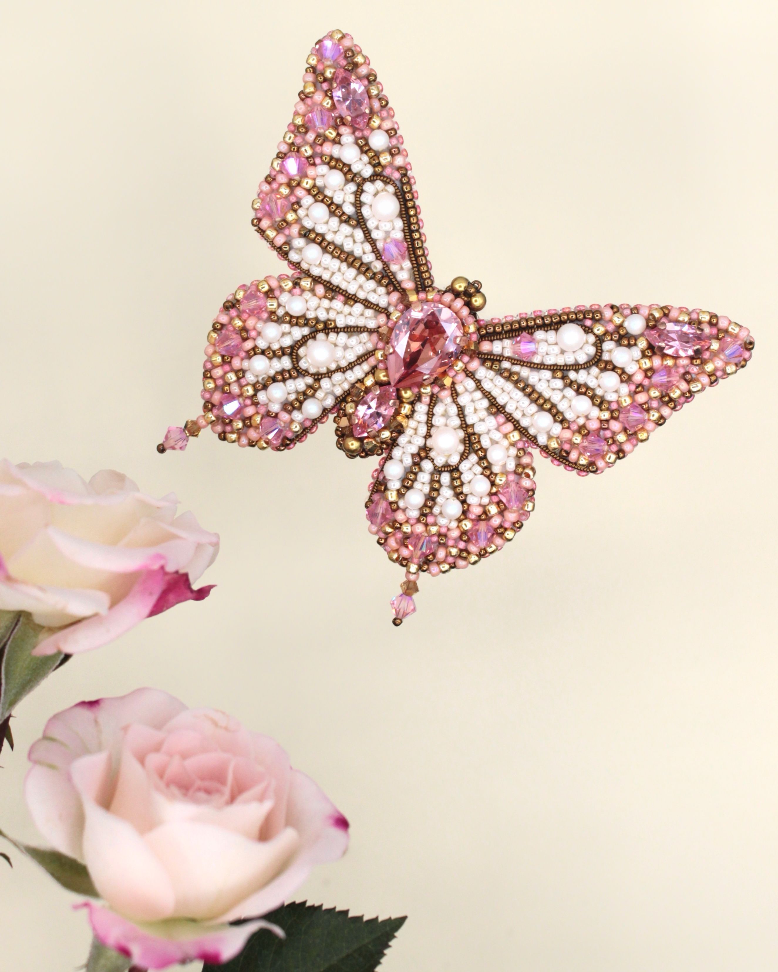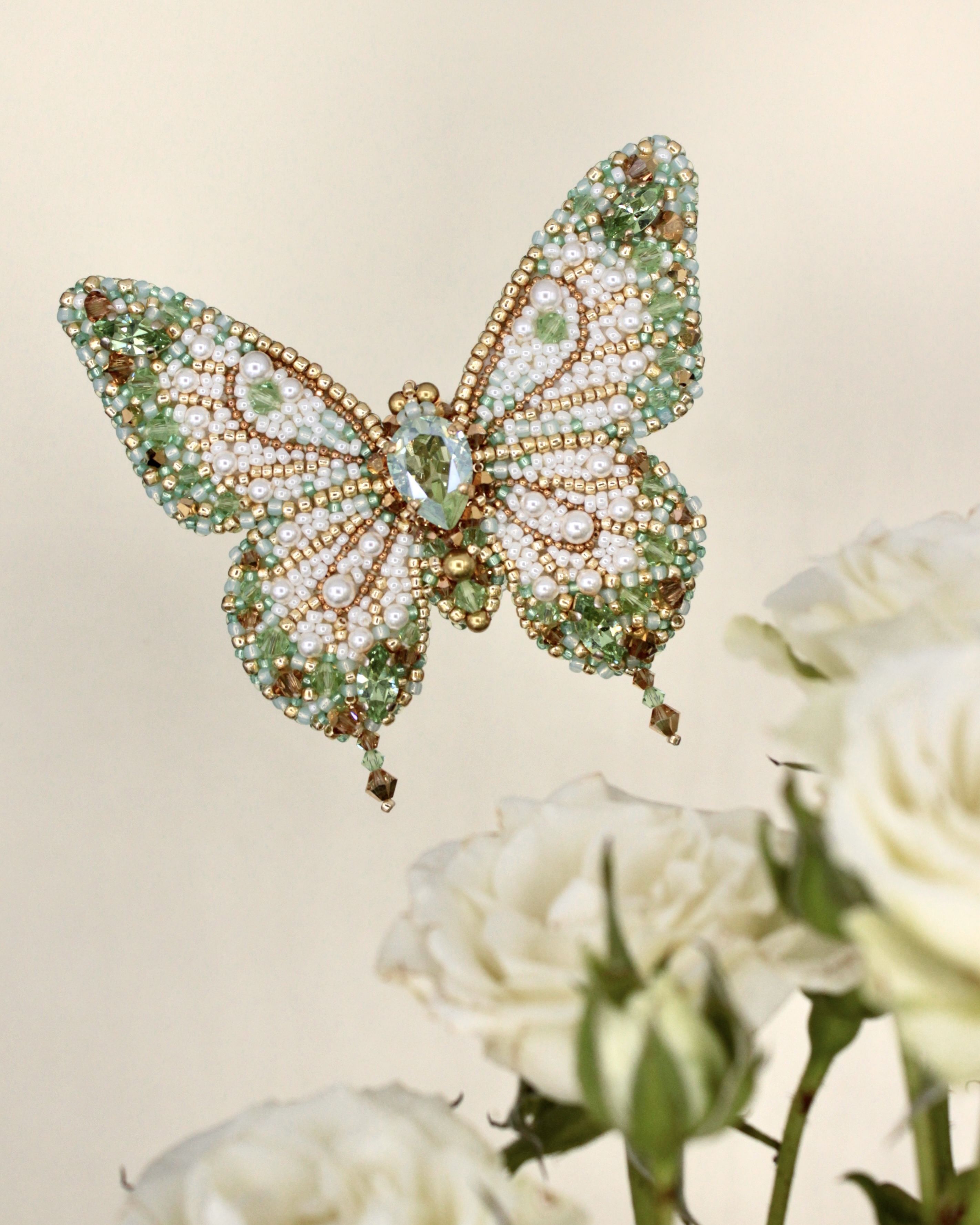 В мастер‑классе «Бабочка» вы найдёте простые сочетания бисера, кристаллов и бусин — вариант, подходящий для начинающих мастеров, уже знакомых с основами вышивки брошей.